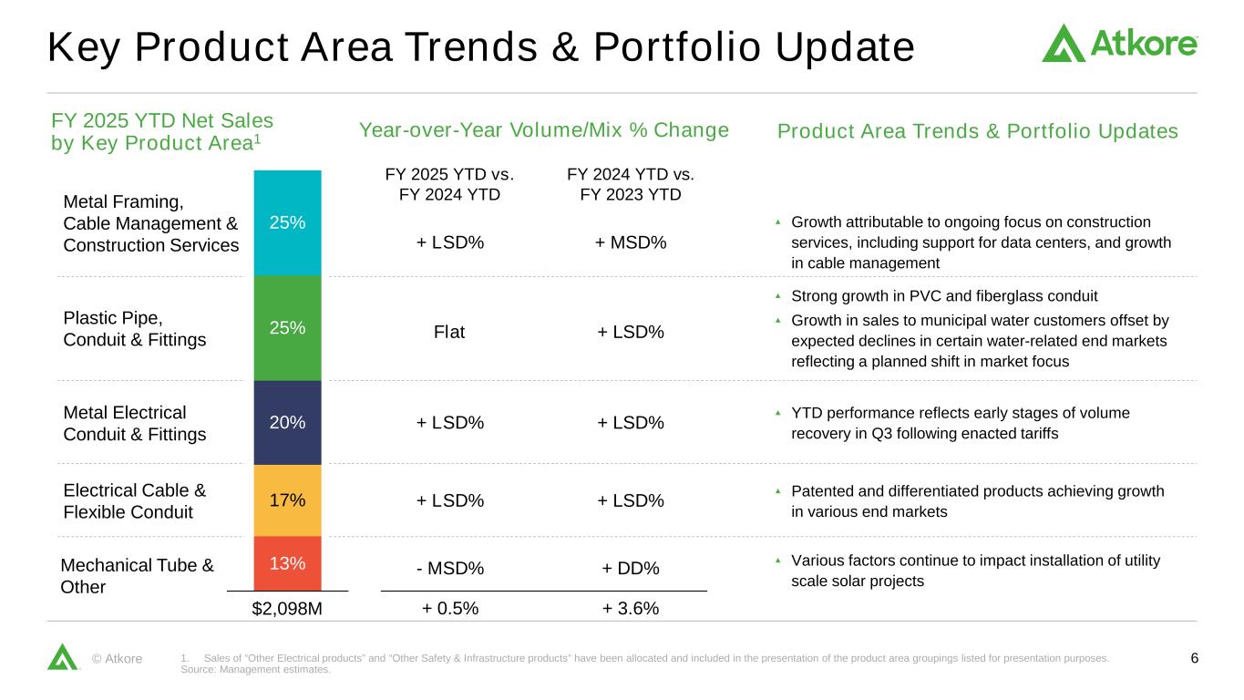 5© Atkore Consolidated Atkore Bridges 1. “Other” may include items such as F/X, M&A, productivity, solar tax credits, investments, interest and tax rate. 2. See non-GAAP reconciliation in appendix. Adjusted EBITDA Bridge2 Net Sales BridgeQ3 2025 $15 $101 $4 $3 2024 Volume/Mix Price Divestiture Other1 2025 $822M $735M $11 $101 $28 $1 $11 2024 Volume/Mix Price Cost Changes Divestiture Other1 2025 $206M $100M Net Sales % Change Adjusted Diluted EPS Bridge2 Volume/Mix 1.9% Price (12.2%) Divestiture (0.5%) Other1 0.2% Total (10.6%) $3.80 $1.63 $2.33 $0.01 $0.12 $0.03 2024 Quarterly Results Divestiture Share Count Other1 2025