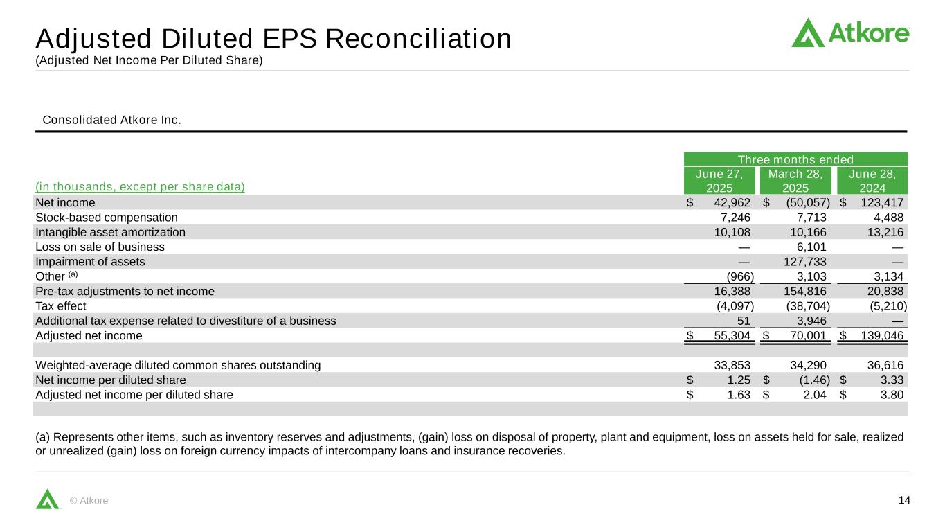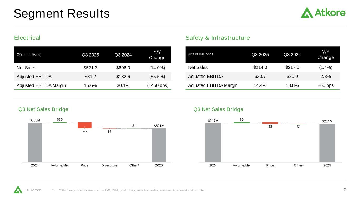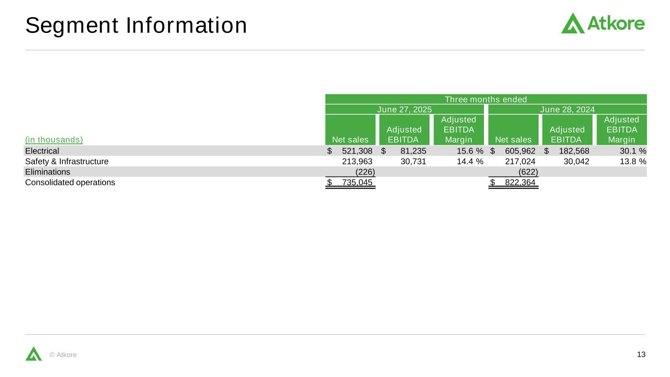 13© Atkore Segment Information Three months ended June 27, 2025 June 28, 2024 (in thousands) Net sales Adjusted EBITDA Adjusted EBITDA Margin Net sales Adjusted EBITDA Adjusted EBITDA Margin Electrical $ 521,308 $ 81,235 15.6 % $ 605,962 $ 182,568 30.1 % Safety & Infrastructure 213,963 30,731 14.4 % 217,024 30,042 13.8 % Eliminations (226) (622) Consolidated operations $ 735,045 $ 822,364