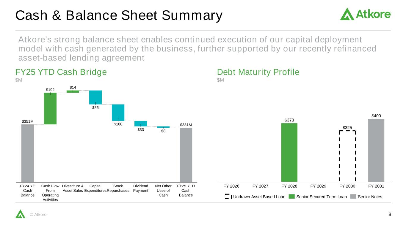 7© Atkore Segment Results Q3 Net Sales Bridge Q3 Net Sales Bridge Electrical Safety & Infrastructure ($’s in millions) Q3 2025 Q3 2024 Y/Y Change Net Sales $521.3 $606.0 (14.0%) Adjusted EBITDA $81.2 $182.6 (55.5%) Adjusted EBITDA Margin 15.6% 30.1% (1450 bps) ($’s in millions) Q3 2025 Q3 2024 Y/Y Change Net Sales $214.0 $217.0 (1.4%) Adjusted EBITDA $30.7 $30.0 2.3% Adjusted EBITDA Margin 14.4% 13.8% +60 bps 1. “Other” may include items such as F/X, M&A, productivity, solar tax credits, investments, interest and tax rate. $10 $92 $4 $1 2024 Volume/Mix Price Divestiture Other1 2025 $606M $521M $6 $8 $1 2024 Volume/Mix Price Other1 2025 $217M $214M