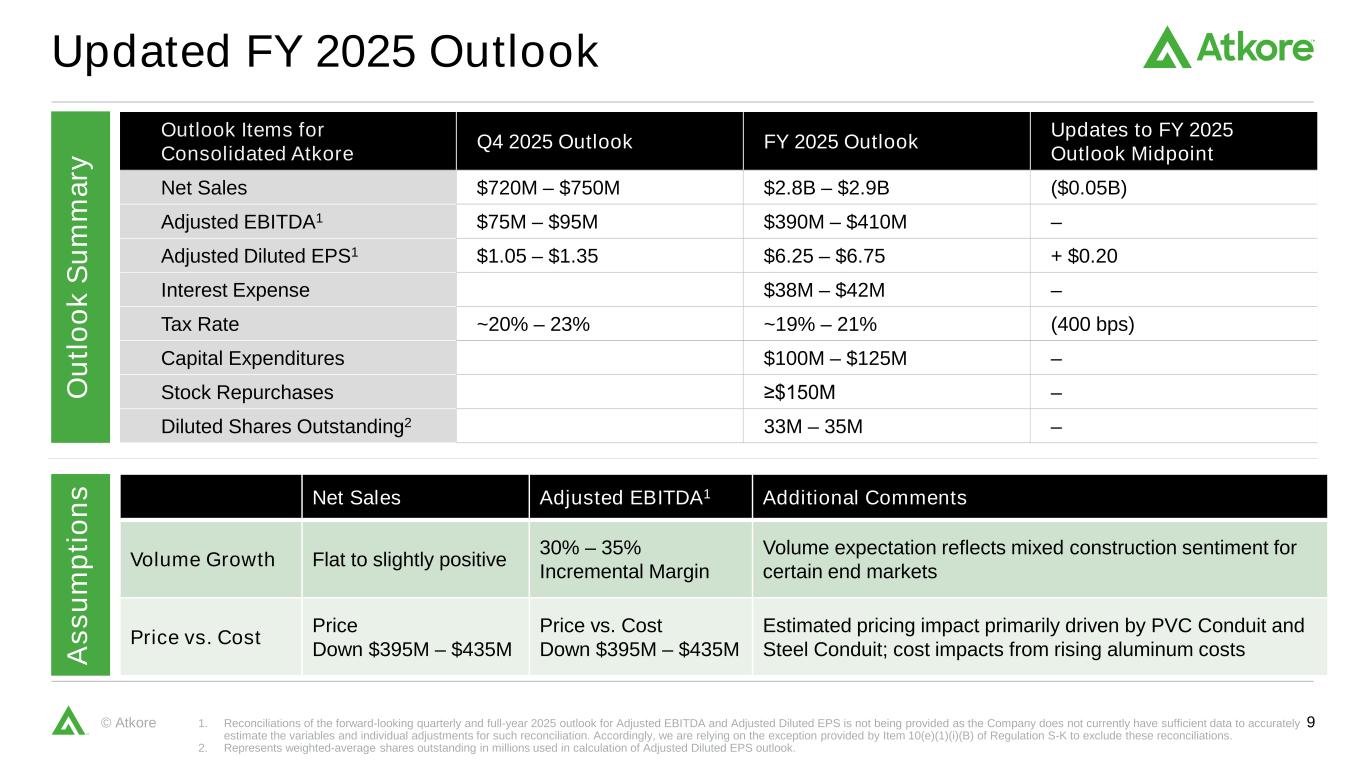 9© Atkore Updated FY 2025 Outlook O ut lo ok S um m ar y 1. Reconciliations of the forward-looking quarterly and full-year 2025 outlook for Adjusted EBITDA and Adjusted Diluted EPS is not being provided as the Company does not currently have sufficient data to accurately estimate the variables and individual adjustments for such reconciliation. Accordingly, we are relying on the exception provided by Item 10(e)(1)(i)(B) of Regulation S-K to exclude these reconciliations. 2. Represents weighted-average shares outstanding in millions used in calculation of Adjusted Diluted EPS outlook. Outlook Items for Consolidated Atkore Q4 2025 Outlook FY 2025 Outlook Updates to FY 2025 Outlook Midpoint Net Sales $720M – $750M $2.8B – $2.9B ($0.05B) Adjusted EBITDA1 $75M – $95M $390M – $410M – Adjusted Diluted EPS1 $1.05 – $1.35 $6.25 – $6.75 + $0.20 Interest Expense $38M – $42M – Tax Rate ~20% – 23% ~19% – 21% (400 bps) Capital Expenditures $100M – $125M – Stock Repurchases ≥$150M – Diluted Shares Outstanding2 33M – 35M – Net Sales Adjusted EBITDA1 Additional Comments Volume Growth Flat to slightly positive 30% – 35% Incremental Margin Volume expectation reflects mixed construction sentiment for certain end markets Price vs. Cost Price Down $395M – $435M Price vs. Cost Down $395M – $435M Estimated pricing impact primarily driven by PVC Conduit and Steel Conduit; cost impacts from rising aluminum costs A ss um pt io ns