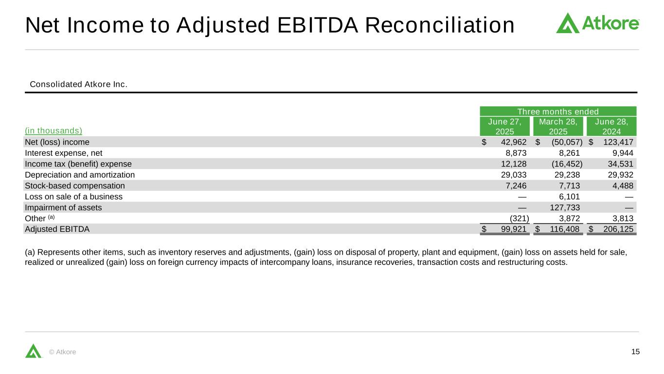 14© Atkore Consolidated Atkore Inc. Adjusted Diluted EPS Reconciliation (Adjusted Net Income Per Diluted Share) Three months ended (in thousands, except per share data) June 27, 2025 March 28, 2025 June 28, 2024 Net income $ 42,962 $ (50,057) $ 123,417 Stock-based compensation 7,246 7,713 4,488 Intangible asset amortization 10,108 10,166 13,216 Loss on sale of business — 6,101 — Impairment of assets — 127,733 — Other (a) (966) 3,103 3,134 Pre-tax adjustments to net income 16,388 154,816 20,838 Tax effect (4,097) (38,704) (5,210) Additional tax expense related to divestiture of a business 51 3,946 — Adjusted net income $ 55,304 $ 70,001 $ 139,046 Weighted-average diluted common shares outstanding 33,853 34,290 36,616 Net income per diluted share $ 1.25 $ (1.46) $ 3.33 Adjusted net income per diluted share $ 1.63 $ 2.04 $ 3.80 (a) Represents other items, such as inventory reserves and adjustments, (gain) loss on disposal of property, plant and equipment, loss on assets held for sale, realized or unrealized (gain) loss on foreign currency impacts of intercompany loans and insurance recoveries.