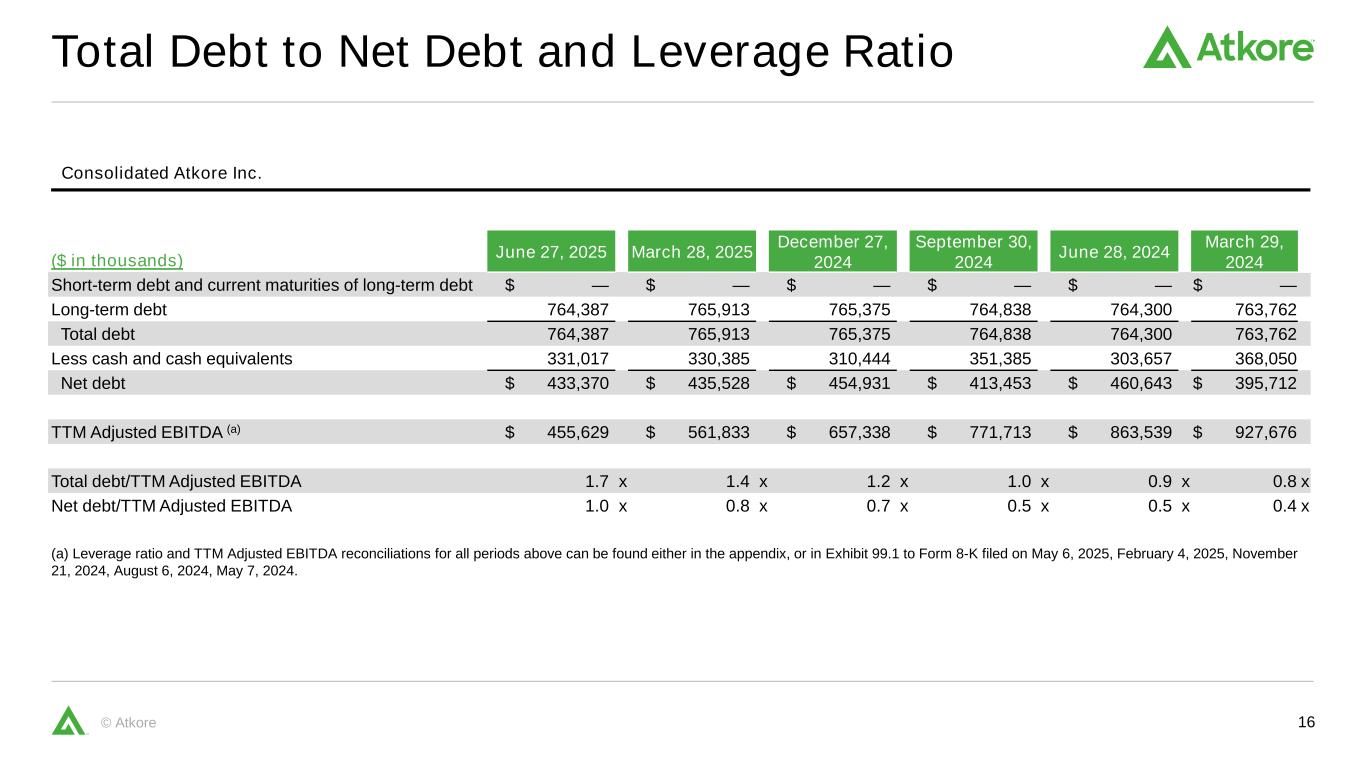 15© Atkore Net Income to Adjusted EBITDA Reconciliation Consolidated Atkore Inc. Three months ended (in thousands) June 27, 2025 March 28, 2025 June 28, 2024 Net (loss) income $ 42,962 $ (50,057) $ 123,417 Interest expense, net 8,873 8,261 9,944 Income tax (benefit) expense 12,128 (16,452) 34,531 Depreciation and amortization 29,033 29,238 29,932 Stock-based compensation 7,246 7,713 4,488 Loss on sale of a business — 6,101 — Impairment of assets — 127,733 — Other (a) (321) 3,872 3,813 Adjusted EBITDA $ 99,921 $ 116,408 $ 206,125 (a) Represents other items, such as inventory reserves and adjustments, (gain) loss on disposal of property, plant and equipment, (gain) loss on assets held for sale, realized or unrealized (gain) loss on foreign currency impacts of intercompany loans, insurance recoveries, transaction costs and restructuring costs.