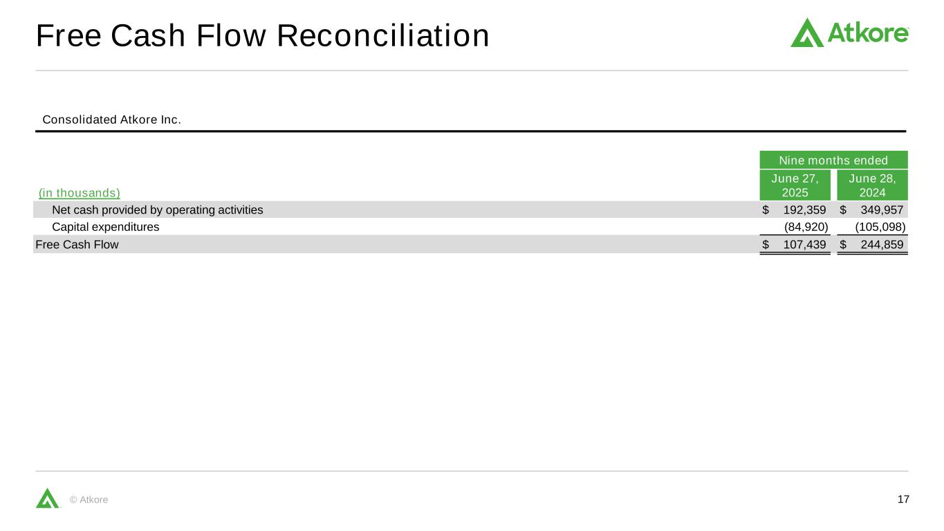 16© Atkore Total Debt to Net Debt and Leverage Ratio Consolidated Atkore Inc. ($ in thousands) June 27, 2025 March 28, 2025 December 27, 2024 September 30, 2024 June 28, 2024 March 29, 2024 Short-term debt and current maturities of long-term debt $ — $ — $ — $ — $ — $ — Long-term debt 764,387 765,913 765,375 764,838 764,300 763,762 Total debt 764,387 765,913 765,375 764,838 764,300 763,762 Less cash and cash equivalents 331,017 330,385 310,444 351,385 303,657 368,050 Net debt $ 433,370 $ 435,528 $ 454,931 $ 413,453 $ 460,643 $ 395,712 TTM Adjusted EBITDA (a) $ 455,629 $ 561,833 $ 657,338 $ 771,713 $ 863,539 $ 927,676 Total debt/TTM Adjusted EBITDA 1.7 x 1.4 x 1.2 x 1.0 x 0.9 x 0.8 x Net debt/TTM Adjusted EBITDA 1.0 x 0.8 x 0.7 x 0.5 x 0.5 x 0.4 x (a) Leverage ratio and TTM Adjusted EBITDA reconciliations for all periods above can be found either in the appendix, or in Exhibit 99.1 to Form 8-K filed on May 6, 2025, February 4, 2025, November 21, 2024, August 6, 2024, May 7, 2024.