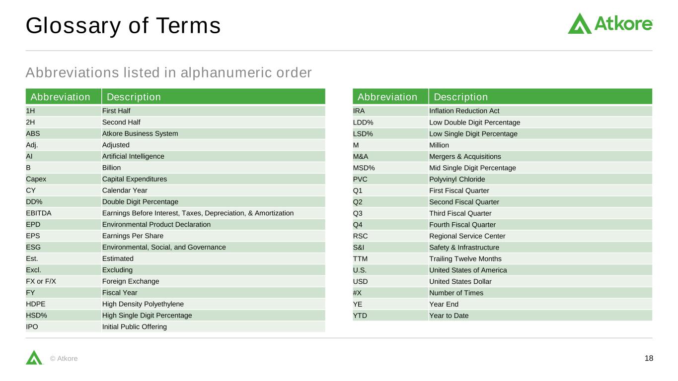18© Atkore Abbreviations listed in alphanumeric order Glossary of Terms Abbreviation Description 1H First Half 2H Second Half ABS Atkore Business System Adj. Adjusted AI Artificial Intelligence B Billion Capex Capital Expenditures CY Calendar Year DD% Double Digit Percentage EBITDA Earnings Before Interest, Taxes, Depreciation, & Amortization EPD Environmental Product Declaration EPS Earnings Per Share ESG Environmental, Social, and Governance Est. Estimated Excl. Excluding FX or F/X Foreign Exchange FY Fiscal Year HDPE High Density Polyethylene HSD% High Single Digit Percentage IPO Initial Public Offering Abbreviation Description IRA Inflation Reduction Act LDD% Low Double Digit Percentage LSD% Low Single Digit Percentage M Million M&A Mergers & Acquisitions MSD% Mid Single Digit Percentage PVC Polyvinyl Chloride Q1 First Fiscal Quarter Q2 Second Fiscal Quarter Q3 Third Fiscal Quarter Q4 Fourth Fiscal Quarter RSC Regional Service Center S&I Safety & Infrastructure TTM Trailing Twelve Months U.S. United States of America USD United States Dollar #X Number of Times YE Year End YTD Year to Date