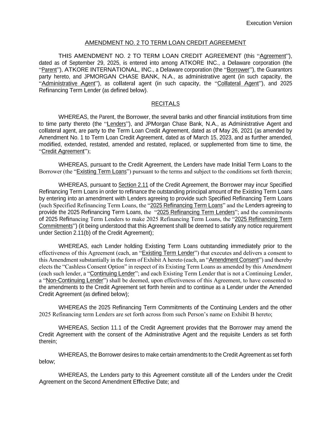Execution Version AMENDMENT NO. 2 TO TERM LOAN CREDIT AGREEMENT THIS AMENDMENT NO. 2 TO TERM LOAN CREDIT AGREEMENT (this “Agreement”), dated as of September 29, 2025, is entered into among ATKORE INC., a Delaware corporation (the “Parent”), ATKORE INTERNATIONAL, INC., a Delaware corporation (the “Borrower”), the Guarantors party hereto, and JPMORGAN CHASE BANK, N.A., as administrative agent (in such capacity, the “Administrative Agent”), as collateral agent (in such capacity, the “Collateral Agent”), and 2025 Refinancing Term Lender (as defined below). RECITALS WHEREAS, the Parent, the Borrower, the several banks and other financial institutions from time to time party thereto (the “Lenders”), and JPMorgan Chase Bank, N.A., as Administrative Agent and collateral agent, are party to the Term Loan Credit Agreement, dated as of May 26, 2021 (as amended by Amendment No. 1 to Term Loan Credit Agreement, dated as of March 15, 2023, and as further amended, modified, extended, restated, amended and restated, replaced, or supplemented from time to time, the “Credit Agreement”); WHEREAS, pursuant to the Credit Agreement, the Lenders have made Initial Term Loans to the Borrower (the “Existing Term Loans”) pursuant to the terms and subject to the conditions set forth therein; WHEREAS, pursuant to Section 2.11 of the Credit Agreement, the Borrower may incur Specified Refinancing Term Loans in order to refinance the outstanding principal amount of the Existing Term Loans by entering into an amendment with Lenders agreeing to provide such Specified Refinancing Term Loans (such Specified Refinancing Term Loans, the “2025 Refinancing Term Loans” and the Lenders agreeing to provide the 2025 Refinancing Term Loans, the “2025 Refinancing Term Lenders”; and the commitments of 2025 Refinancing Term Lenders to make 2025 Refinancing Term Loans, the “2025 Refinancing Term Commitments”) (it being understood that this Agreement shall be deemed to satisfy any notice requirement under Section 2.11(b) of the Credit Agreement); WHEREAS, each Lender holding Existing Term Loans outstanding immediately prior to the effectiveness of this Agreement (each, an “Existing Term Lender”) that executes and delivers a consent to this Amendment substantially in the form of Exhibit A hereto (each, an “Amendment Consent”) and thereby elects the “Cashless Consent Option” in respect of its Existing Term Loans as amended by this Amendment (each such lender, a “Continuing Lender”; and each Existing Term Lender that is not a Continuing Lender, a “Non-Continuing Lender”) shall be deemed, upon effectiveness of this Agreement, to have consented to the amendments to the Credit Agreement set forth herein and to continue as a Lender under the Amended Credit Agreement (as defined below); WHEREAS the 2025 Refinancing Term Commitments of the Continuing Lenders and the other 2025 Refinancing term Lenders are set forth across from such Person’s name on Exhibit B hereto; WHEREAS, Section 11.1 of the Credit Agreement provides that the Borrower may amend the Credit Agreement with the consent of the Administrative Agent and the requisite Lenders as set forth therein; WHEREAS, the Borrower desires to make certain amendments to the Credit Agreement as set forth below; WHEREAS, the Lenders party to this Agreement constitute all of the Lenders under the Credit Agreement on the Second Amendment Effective Date; and