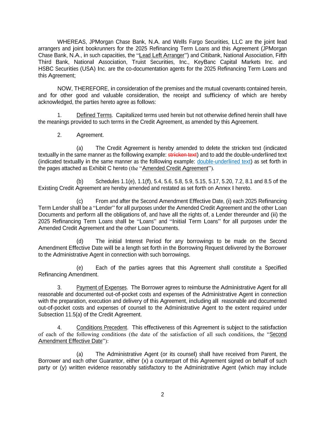 2 WHEREAS, JPMorgan Chase Bank, N.A. and Wells Fargo Securities, LLC are the joint lead arrangers and joint bookrunners for the 2025 Refinancing Term Loans and this Agreement (JPMorgan Chase Bank, N.A., in such capacities, the “Lead Left Arranger”) and Citibank, National Association, Fifth Third Bank, National Association, Truist Securities, Inc., KeyBanc Capital Markets Inc. and HSBC Securities (USA) Inc. are the co-documentation agents for the 2025 Refinancing Term Loans and this Agreement; NOW, THEREFORE, in consideration of the premises and the mutual covenants contained herein, and for other good and valuable consideration, the receipt and sufficiency of which are hereby acknowledged, the parties hereto agree as follows: 1. Defined Terms. Capitalized terms used herein but not otherwise defined herein shall have the meanings provided to such terms in the Credit Agreement, as amended by this Agreement. 2. Agreement. (a) The Credit Agreement is hereby amended to delete the stricken text (indicated textually in the same manner as the following example: stricken text) and to add the double-underlined text (indicated textually in the same manner as the following example: double-underlined text) as set forth in the pages attached as Exhibit C hereto (the “Amended Credit Agreement”). (b) Schedules 1.1(e), 1.1(f), 5.4, 5.6, 5.8, 5.9, 5.15, 5.17, 5.20, 7.2, 8.1 and 8.5 of the Existing Credit Agreement are hereby amended and restated as set forth on Annex I hereto. (c) From and after the Second Amendment Effective Date, (i) each 2025 Refinancing Term Lender shall be a “Lender” for all purposes under the Amended Credit Agreement and the other Loan Documents and perform all the obligations of, and have all the rights of, a Lender thereunder and (ii) the 2025 Refinancing Term Loans shall be “Loans” and “Initial Term Loans” for all purposes under the Amended Credit Agreement and the other Loan Documents. (d) The initial Interest Period for any borrowings to be made on the Second Amendment Effective Date will be a length set forth in the Borrowing Request delivered by the Borrower to the Administrative Agent in connection with such borrowings. (e) Each of the parties agrees that this Agreement shall constitute a Specified Refinancing Amendment. 3. Payment of Expenses. The Borrower agrees to reimburse the Administrative Agent for all reasonable and documented out-of-pocket costs and expenses of the Administrative Agent in connection with the preparation, execution and delivery of this Agreement, including all reasonable and documented out-of-pocket costs and expenses of counsel to the Administrative Agent to the extent required under Subsection 11.5(a) of the Credit Agreement. 4. Conditions Precedent. This effectiveness of this Agreement is subject to the satisfaction of each of the following conditions (the date of the satisfaction of all such conditions, the “Second Amendment Effective Date”): (a) The Administrative Agent (or its counsel) shall have received from Parent, the Borrower and each other Guarantor, either (x) a counterpart of this Agreement signed on behalf of such party or (y) written evidence reasonably satisfactory to the Administrative Agent (which may include
