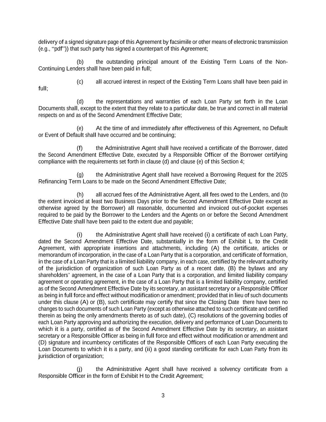 3 delivery of a signed signature page of this Agreement by facsimile or other means of electronic transmission (e.g., “pdf”)) that such party has signed a counterpart of this Agreement; (b) the outstanding principal amount of the Existing Term Loans of the Non- Continuing Lenders shall have been paid in full; (c) all accrued interest in respect of the Existing Term Loans shall have been paid in full; (d) the representations and warranties of each Loan Party set forth in the Loan Documents shall, except to the extent that they relate to a particular date, be true and correct in all material respects on and as of the Second Amendment Effective Date; (e) At the time of and immediately after effectiveness of this Agreement, no Default or Event of Default shall have occurred and be continuing; (f) the Administrative Agent shall have received a certificate of the Borrower, dated the Second Amendment Effective Date, executed by a Responsible Officer of the Borrower certifying compliance with the requirements set forth in clause (d) and clause (e) of this Section 4; (g) the Administrative Agent shall have received a Borrowing Request for the 2025 Refinancing Term Loans to be made on the Second Amendment Effective Date; (h) all accrued fees of the Administrative Agent, all fees owed to the Lenders, and (to the extent invoiced at least two Business Days prior to the Second Amendment Effective Date except as otherwise agreed by the Borrower) all reasonable, documented and invoiced out-of-pocket expenses required to be paid by the Borrower to the Lenders and the Agents on or before the Second Amendment Effective Date shall have been paid to the extent due and payable; (i) the Administrative Agent shall have received (i) a certificate of each Loan Party, dated the Second Amendment Effective Date, substantially in the form of Exhibit L to the Credit Agreement, with appropriate insertions and attachments, including (A) the certificate, articles or memorandum of incorporation, in the case of a Loan Party that is a corporation, and certificate of formation, in the case of a Loan Party that is a limited liability company, in each case, certified by the relevant authority of the jurisdiction of organization of such Loan Party as of a recent date, (B) the bylaws and any shareholders’ agreement, in the case of a Loan Party that is a corporation, and limited liability company agreement or operating agreement, in the case of a Loan Party that is a limited liability company, certified as of the Second Amendment Effective Date by its secretary, an assistant secretary or a Responsible Officer as being in full force and effect without modification or amendment; provided that in lieu of such documents under this clause (A) or (B), such certificate may certify that since the Closing Date there have been no changes to such documents of such Loan Party (except as otherwise attached to such certificate and certified therein as being the only amendments thereto as of such date), (C) resolutions of the governing bodies of each Loan Party approving and authorizing the execution, delivery and performance of Loan Documents to which it is a party, certified as of the Second Amendment Effective Date by its secretary, an assistant secretary or a Responsible Officer as being in full force and effect without modification or amendment and (D) signature and incumbency certificates of the Responsible Officers of each Loan Party executing the Loan Documents to which it is a party, and (ii) a good standing certificate for each Loan Party from its jurisdiction of organization; (j) the Administrative Agent shall have received a solvency certificate from a Responsible Officer in the form of Exhibit H to the Credit Agreement;