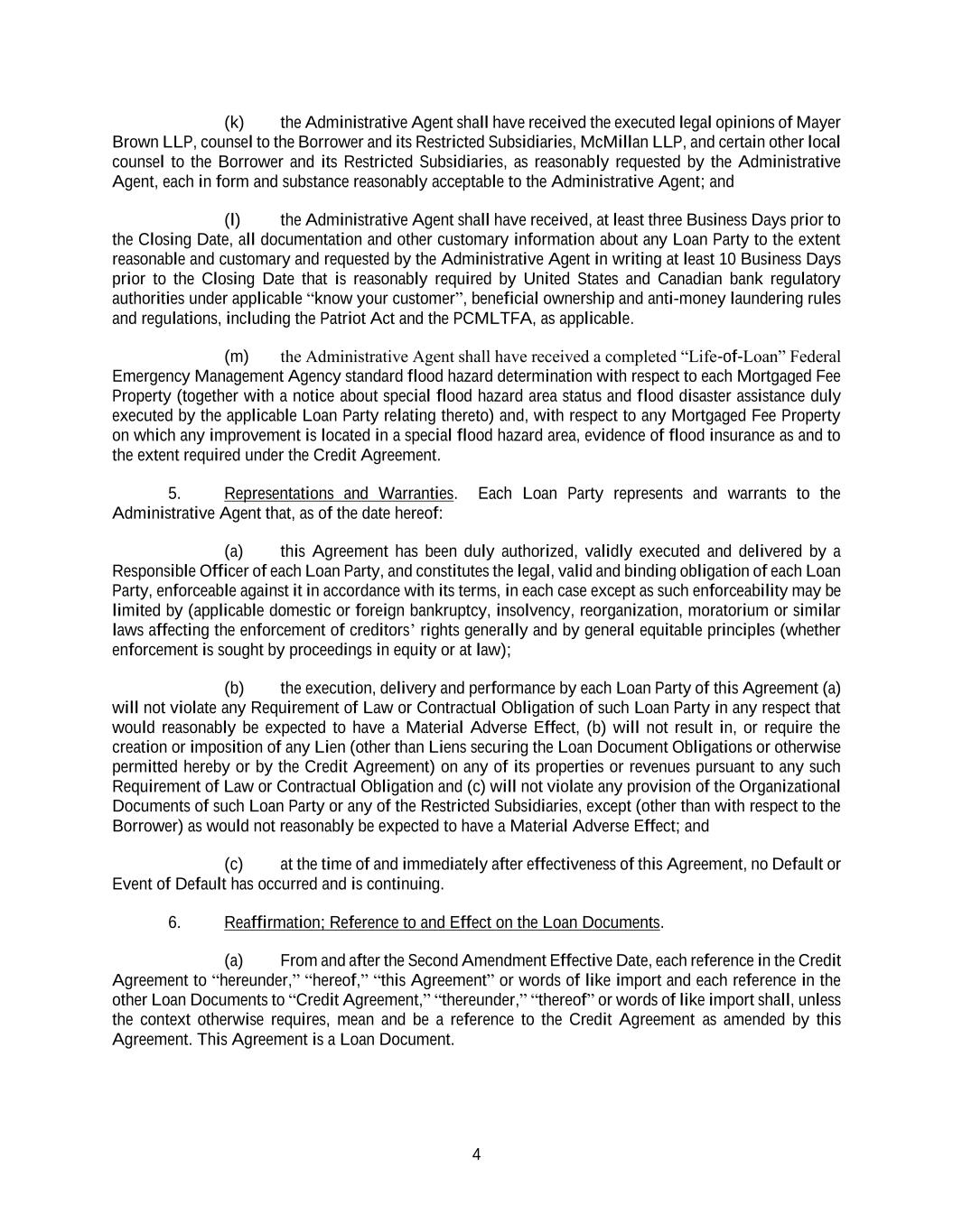 4 (k) the Administrative Agent shall have received the executed legal opinions of Mayer Brown LLP, counsel to the Borrower and its Restricted Subsidiaries, McMillan LLP, and certain other local counsel to the Borrower and its Restricted Subsidiaries, as reasonably requested by the Administrative Agent, each in form and substance reasonably acceptable to the Administrative Agent; and (l) the Administrative Agent shall have received, at least three Business Days prior to the Closing Date, all documentation and other customary information about any Loan Party to the extent reasonable and customary and requested by the Administrative Agent in writing at least 10 Business Days prior to the Closing Date that is reasonably required by United States and Canadian bank regulatory authorities under applicable “know your customer”, beneficial ownership and anti-money laundering rules and regulations, including the Patriot Act and the PCMLTFA, as applicable. (m) the Administrative Agent shall have received a completed “Life-of-Loan” Federal Emergency Management Agency standard flood hazard determination with respect to each Mortgaged Fee Property (together with a notice about special flood hazard area status and flood disaster assistance duly executed by the applicable Loan Party relating thereto) and, with respect to any Mortgaged Fee Property on which any improvement is located in a special flood hazard area, evidence of flood insurance as and to the extent required under the Credit Agreement. 5. Representations and Warranties. Each Loan Party represents and warrants to the Administrative Agent that, as of the date hereof: (a) this Agreement has been duly authorized, validly executed and delivered by a Responsible Officer of each Loan Party, and constitutes the legal, valid and binding obligation of each Loan Party, enforceable against it in accordance with its terms, in each case except as such enforceability may be limited by (applicable domestic or foreign bankruptcy, insolvency, reorganization, moratorium or similar laws affecting the enforcement of creditors’ rights generally and by general equitable principles (whether enforcement is sought by proceedings in equity or at law); (b) the execution, delivery and performance by each Loan Party of this Agreement (a) will not violate any Requirement of Law or Contractual Obligation of such Loan Party in any respect that would reasonably be expected to have a Material Adverse Effect, (b) will not result in, or require the creation or imposition of any Lien (other than Liens securing the Loan Document Obligations or otherwise permitted hereby or by the Credit Agreement) on any of its properties or revenues pursuant to any such Requirement of Law or Contractual Obligation and (c) will not violate any provision of the Organizational Documents of such Loan Party or any of the Restricted Subsidiaries, except (other than with respect to the Borrower) as would not reasonably be expected to have a Material Adverse Effect; and (c) at the time of and immediately after effectiveness of this Agreement, no Default or Event of Default has occurred and is continuing. 6. Reaffirmation; Reference to and Effect on the Loan Documents. (a) From and after the Second Amendment Effective Date, each reference in the Credit Agreement to “hereunder,” “hereof,” “this Agreement” or words of like import and each reference in the other Loan Documents to “Credit Agreement,” “thereunder,” “thereof” or words of like import shall, unless the context otherwise requires, mean and be a reference to the Credit Agreement as amended by this Agreement. This Agreement is a Loan Document.