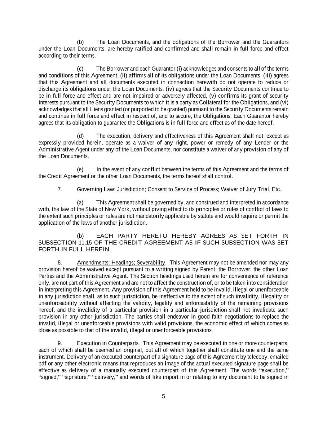 5 (b) The Loan Documents, and the obligations of the Borrower and the Guarantors under the Loan Documents, are hereby ratified and confirmed and shall remain in full force and effect according to their terms. (c) The Borrower and each Guarantor (i) acknowledges and consents to all of the terms and conditions of this Agreement, (ii) affirms all of its obligations under the Loan Documents, (iii) agrees that this Agreement and all documents executed in connection herewith do not operate to reduce or discharge its obligations under the Loan Documents, (iv) agrees that the Security Documents continue to be in full force and effect and are not impaired or adversely affected, (v) confirms its grant of security interests pursuant to the Security Documents to which it is a party as Collateral for the Obligations, and (vi) acknowledges that all Liens granted (or purported to be granted) pursuant to the Security Documents remain and continue in full force and effect in respect of, and to secure, the Obligations. Each Guarantor hereby agrees that its obligation to guarantee the Obligations is in full force and effect as of the date hereof. (d) The execution, delivery and effectiveness of this Agreement shall not, except as expressly provided herein, operate as a waiver of any right, power or remedy of any Lender or the Administrative Agent under any of the Loan Documents, nor constitute a waiver of any provision of any of the Loan Documents. (e) In the event of any conflict between the terms of this Agreement and the terms of the Credit Agreement or the other Loan Documents, the terms hereof shall control. 7. Governing Law; Jurisdiction; Consent to Service of Process; Waiver of Jury Trial, Etc. (a) This Agreement shall be governed by, and construed and interpreted in accordance with, the law of the State of New York, without giving effect to its principles or rules of conflict of laws to the extent such principles or rules are not mandatorily applicable by statute and would require or permit the application of the laws of another jurisdiction. (b) EACH PARTY HERETO HEREBY AGREES AS SET FORTH IN SUBSECTION 11.15 OF THE CREDIT AGREEMENT AS IF SUCH SUBSECTION WAS SET FORTH IN FULL HEREIN. 8. Amendments; Headings; Severability. This Agreement may not be amended nor may any provision hereof be waived except pursuant to a writing signed by Parent, the Borrower, the other Loan Parties and the Administrative Agent. The Section headings used herein are for convenience of reference only, are not part of this Agreement and are not to affect the construction of, or to be taken into consideration in interpreting this Agreement. Any provision of this Agreement held to be invalid, illegal or unenforceable in any jurisdiction shall, as to such jurisdiction, be ineffective to the extent of such invalidity, illegality or unenforceability without affecting the validity, legality and enforceability of the remaining provisions hereof, and the invalidity of a particular provision in a particular jurisdiction shall not invalidate such provision in any other jurisdiction. The parties shall endeavor in good-faith negotiations to replace the invalid, illegal or unenforceable provisions with valid provisions, the economic effect of which comes as close as possible to that of the invalid, illegal or unenforceable provisions. 9. Execution in Counterparts. This Agreement may be executed in one or more counterparts, each of which shall be deemed an original, but all of which together shall constitute one and the same instrument. Delivery of an executed counterpart of a signature page of this Agreement by telecopy, emailed pdf or any other electronic means that reproduces an image of the actual executed signature page shall be effective as delivery of a manually executed counterpart of this Agreement. The words “execution,” “signed,” “signature,” “delivery,” and words of like import in or relating to any document to be signed in