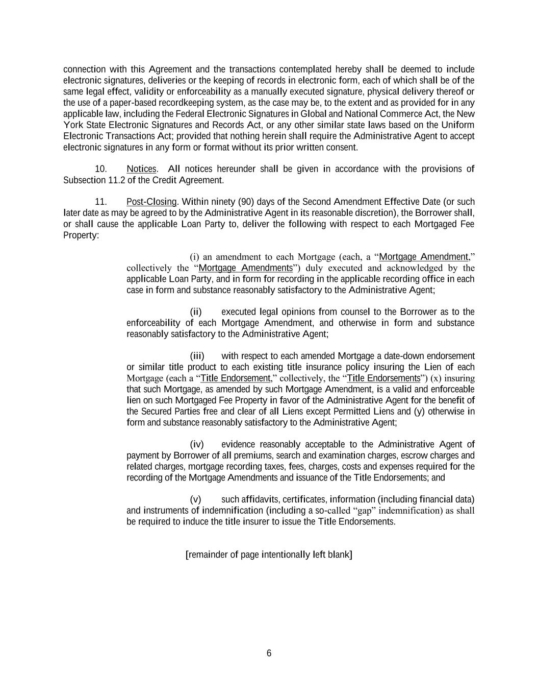 6 connection with this Agreement and the transactions contemplated hereby shall be deemed to include electronic signatures, deliveries or the keeping of records in electronic form, each of which shall be of the same legal effect, validity or enforceability as a manually executed signature, physical delivery thereof or the use of a paper-based recordkeeping system, as the case may be, to the extent and as provided for in any applicable law, including the Federal Electronic Signatures in Global and National Commerce Act, the New York State Electronic Signatures and Records Act, or any other similar state laws based on the Uniform Electronic Transactions Act; provided that nothing herein shall require the Administrative Agent to accept electronic signatures in any form or format without its prior written consent. 10. Notices. All notices hereunder shall be given in accordance with the provisions of Subsection 11.2 of the Credit Agreement. 11. Post-Closing. Within ninety (90) days of the Second Amendment Effective Date (or such later date as may be agreed to by the Administrative Agent in its reasonable discretion), the Borrower shall, or shall cause the applicable Loan Party to, deliver the following with respect to each Mortgaged Fee Property: (i) an amendment to each Mortgage (each, a “Mortgage Amendment,” collectively the “Mortgage Amendments”) duly executed and acknowledged by the applicable Loan Party, and in form for recording in the applicable recording office in each case in form and substance reasonably satisfactory to the Administrative Agent; (ii) executed legal opinions from counsel to the Borrower as to the enforceability of each Mortgage Amendment, and otherwise in form and substance reasonably satisfactory to the Administrative Agent; (iii) with respect to each amended Mortgage a date-down endorsement or similar title product to each existing title insurance policy insuring the Lien of each Mortgage (each a “Title Endorsement,” collectively, the “Title Endorsements”) (x) insuring that such Mortgage, as amended by such Mortgage Amendment, is a valid and enforceable lien on such Mortgaged Fee Property in favor of the Administrative Agent for the benefit of the Secured Parties free and clear of all Liens except Permitted Liens and (y) otherwise in form and substance reasonably satisfactory to the Administrative Agent; (iv) evidence reasonably acceptable to the Administrative Agent of payment by Borrower of all premiums, search and examination charges, escrow charges and related charges, mortgage recording taxes, fees, charges, costs and expenses required for the recording of the Mortgage Amendments and issuance of the Title Endorsements; and (v) such affidavits, certificates, information (including financial data) and instruments of indemnification (including a so-called “gap” indemnification) as shall be required to induce the title insurer to issue the Title Endorsements. [remainder of page intentionally left blank]