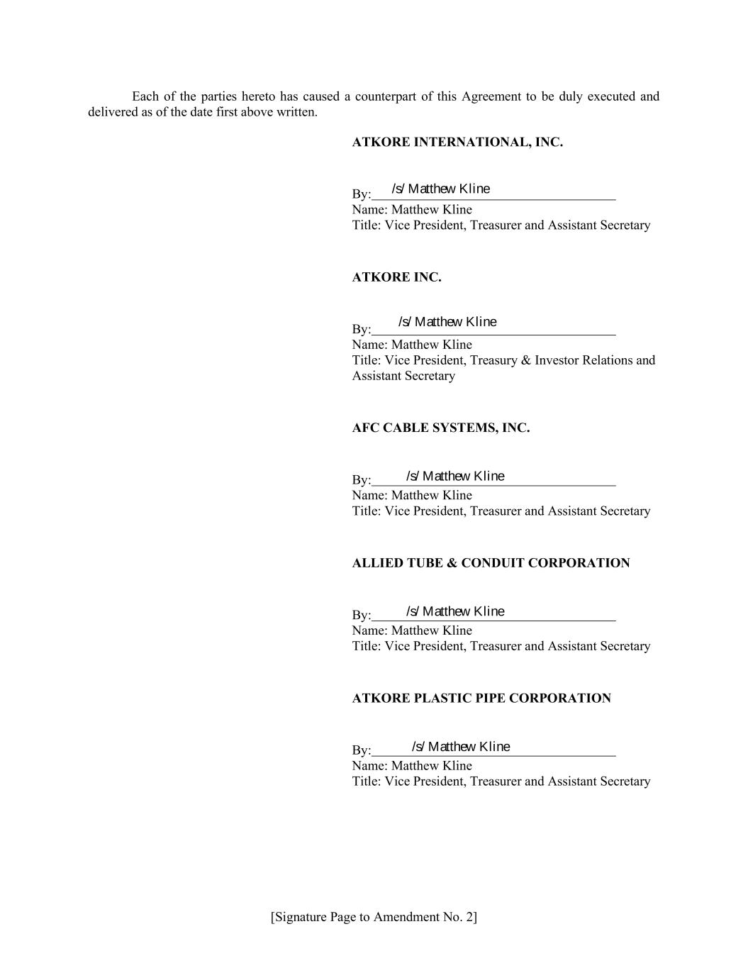 [Signature Page to Amendment No. 2] Each of the parties hereto has caused a counterpart of this Agreement to be duly executed and delivered as of the date first above written. ATKORE INTERNATIONAL, INC. By: Name: Matthew Kline Title: Vice President, Treasurer and Assistant Secretary ATKORE INC. By: Name: Matthew Kline Title: Vice President, Treasury & Investor Relations and Assistant Secretary AFC CABLE SYSTEMS, INC. By: Name: Matthew Kline Title: Vice President, Treasurer and Assistant Secretary ALLIED TUBE & CONDUIT CORPORATION By: Name: Matthew Kline Title: Vice President, Treasurer and Assistant Secretary ATKORE PLASTIC PIPE CORPORATION By: Name: Matthew Kline Title: Vice President, Treasurer and Assistant Secretary /s/ Matthew Kline /s/ Matthew Kline /s/ Matthew Kline /s/ Matthew Kline /s/ Matthew Kline