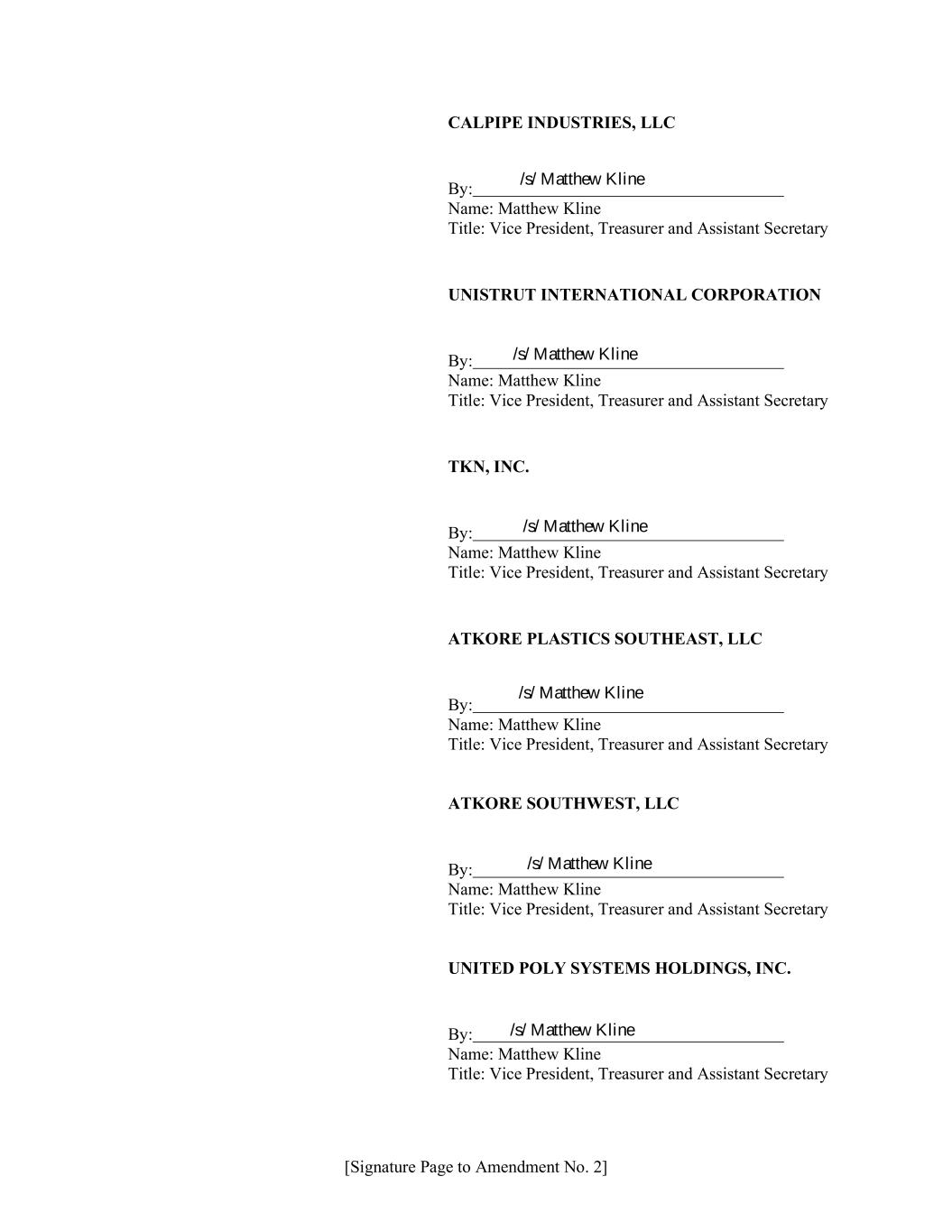 [Signature Page to Amendment No. 2] CALPIPE INDUSTRIES, LLC By: Name: Matthew Kline Title: Vice President, Treasurer and Assistant Secretary UNISTRUT INTERNATIONAL CORPORATION By: Name: Matthew Kline Title: Vice President, Treasurer and Assistant Secretary TKN, INC. By: Name: Matthew Kline Title: Vice President, Treasurer and Assistant Secretary ATKORE PLASTICS SOUTHEAST, LLC By: Name: Matthew Kline Title: Vice President, Treasurer and Assistant Secretary ATKORE SOUTHWEST, LLC By: Name: Matthew Kline Title: Vice President, Treasurer and Assistant Secretary UNITED POLY SYSTEMS HOLDINGS, INC. By: Name: Matthew Kline Title: Vice President, Treasurer and Assistant Secretary /s/ Matthew Kline /s/ Matthew Kline /s/ Matthew Kline /s/ Matthew Kline /s/ Matthew Kline /s/ Matthew Kline