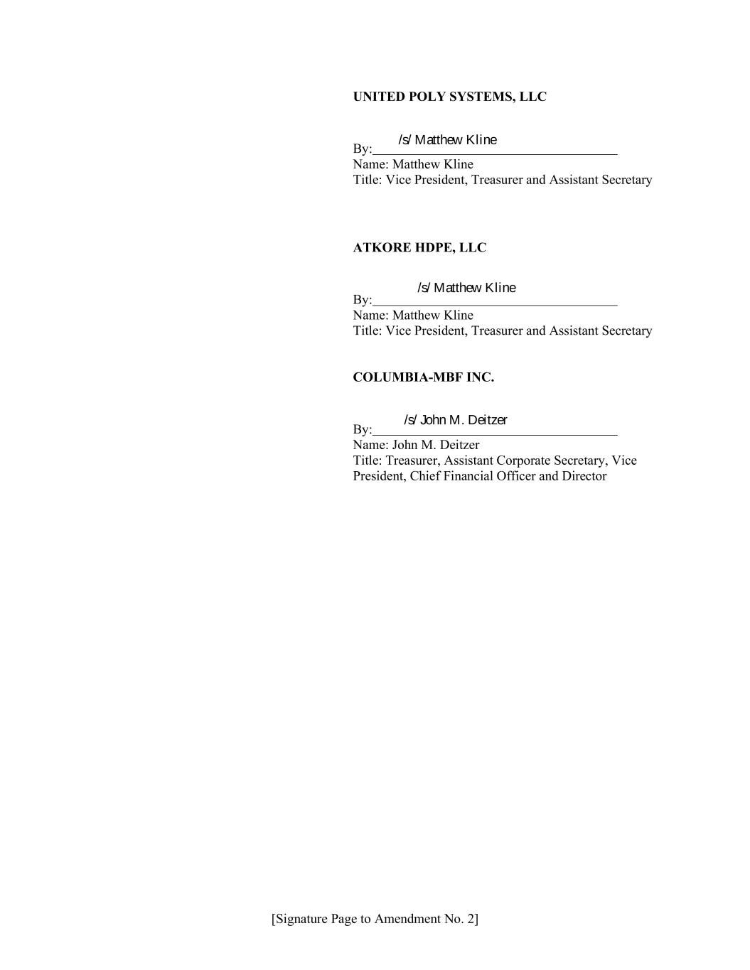 [Signature Page to Amendment No. 2] UNITED POLY SYSTEMS, LLC By: Name: Matthew Kline Title: Vice President, Treasurer and Assistant Secretary ATKORE HDPE, LLC By: Name: Matthew Kline Title: Vice President, Treasurer and Assistant Secretary COLUMBIA-MBF INC. By: Name: John M. Deitzer Title: Treasurer, Assistant Corporate Secretary, Vice President, Chief Financial Officer and Director /s/ Matthew Kline /s/ Matthew Kline /s/ John M. Deitzer