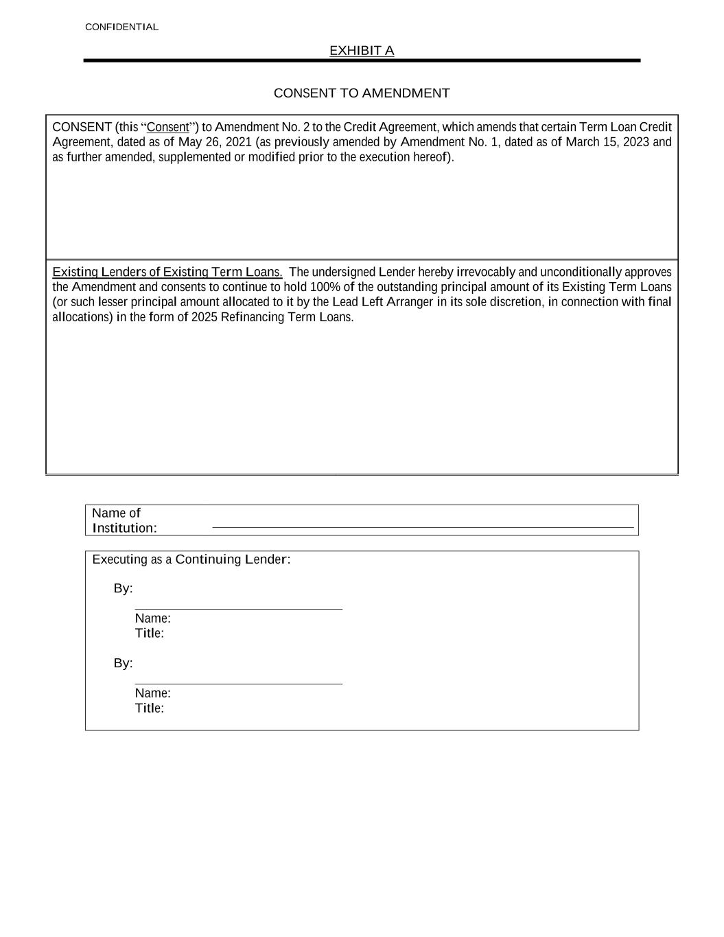 EXHIBIT A CONFIDENTIAL CONSENT TO AMENDMENT CONSENT (this “Consent”) to Amendment No. 2 to the Credit Agreement, which amends that certain Term Loan Credit Agreement, dated as of May 26, 2021 (as previously amended by Amendment No. 1, dated as of March 15, 2023 and as further amended, supplemented or modified prior to the execution hereof). Existing Lenders of Existing Term Loans. The undersigned Lender hereby irrevocably and unconditionally approves the Amendment and consents to continue to hold 100% of the outstanding principal amount of its Existing Term Loans (or such lesser principal amount allocated to it by the Lead Left Arranger in its sole discretion, in connection with final allocations) in the form of 2025 Refinancing Term Loans. Name of Institution: Executing as a Continuing Lender: By: Name: Title: By: Name: Title: