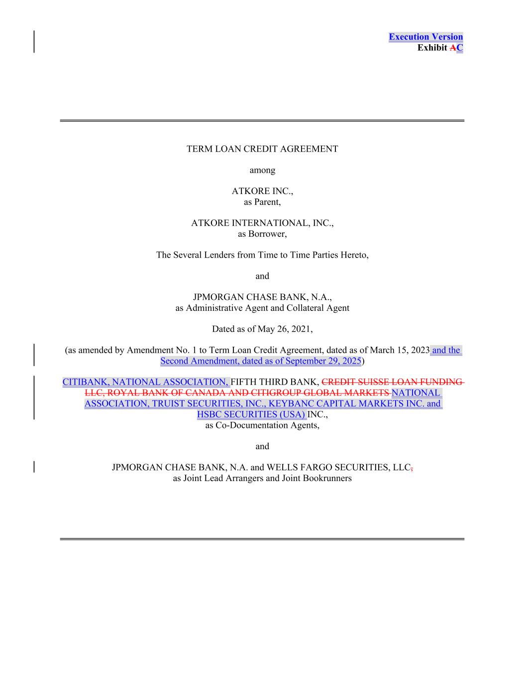 Execution Version Exhibit AC TERM LOAN CREDIT AGREEMENT among ATKORE INC., as Parent, ATKORE INTERNATIONAL, INC., as Borrower, The Several Lenders from Time to Time Parties Hereto, and JPMORGAN CHASE BANK, N.A., as Administrative Agent and Collateral Agent Dated as of May 26, 2021, (as amended by Amendment No. 1 to Term Loan Credit Agreement, dated as of March 15, 2023 and the Second Amendment, dated as of September 29, 2025) CITIBANK, NATIONAL ASSOCIATION, FIFTH THIRD BANK, CREDIT SUISSE LOAN FUNDING LLC, ROYAL BANK OF CANADA AND CITIGROUP GLOBAL MARKETS NATIONAL ASSOCIATION, TRUIST SECURITIES, INC., KEYBANC CAPITAL MARKETS INC. and HSBC SECURITIES (USA) INC., as Co-Documentation Agents, and JPMORGAN CHASE BANK, N.A. and WELLS FARGO SECURITIES, LLC, as Joint Lead Arrangers and Joint Bookrunners