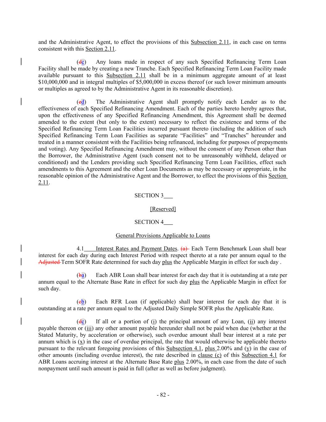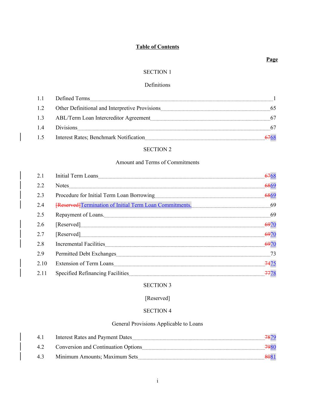 Table of Contents Page SECTION 1 Definitions 1.1 Defined Terms 1 1.2 Other Definitional and Interpretive Provisions 65 1.3 ABL/Term Loan Intercreditor Agreement 67 1.4 Divisions 67 1.5 Interest Rates; Benchmark Notification 6768 SECTION 2 Amount and Terms of Commitments 2.1 Initial Term Loans 6768 2.2 Notes 6869 2.3 Procedure for Initial Term Loan Borrowing 6869 2.4 [Reserved]Termination of Initial Term Loan Commitments. 69 2.5 Repayment of Loans. 69 2.6 [Reserved] 6970 2.7 [Reserved] 6970 2.8 Incremental Facilities 6970 2.9 Permitted Debt Exchanges 73 2.10 Extension of Term Loans 7475 2.11 Specified Refinancing Facilities 7778 SECTION 3 [Reserved] SECTION 4 General Provisions Applicable to Loans 4.1 Interest Rates and Payment Dates 7879 4.2 Conversion and Continuation Options 7980 4.3 Minimum Amounts; Maximum Sets 8081 i