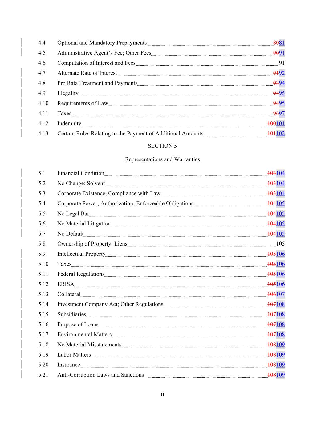4.4 Optional and Mandatory Prepayments 8081 4.5 Administrative Agent’s Fee; Other Fees 9091 4.6 Computation of Interest and Fees 91 4.7 Alternate Rate of Interest 9192 4.8 Pro Rata Treatment and Payments 9394 4.9 Illegality 9495 4.10 Requirements of Law 9495 4.11 Taxes 9697 4.12 Indemnity 100101 4.13 Certain Rules Relating to the Payment of Additional Amounts 101102 SECTION 5 Representations and Warranties 5.1 Financial Condition 103104 5.2 No Change; Solvent 103104 5.3 Corporate Existence; Compliance with Law 103104 5.4 Corporate Power; Authorization; Enforceable Obligations 104105 5.5 No Legal Bar 104105 5.6 No Material Litigation 104105 5.7 No Default 104105 5.8 Ownership of Property; Liens 105 5.9 Intellectual Property 105106 5.10 Taxes 105106 5.11 Federal Regulations 105106 5.12 ERISA 105106 5.13 Collateral 106107 5.14 Investment Company Act; Other Regulations 107108 5.15 Subsidiaries 107108 5.16 Purpose of Loans 107108 5.17 Environmental Matters 107108 5.18 No Material Misstatements 108109 5.19 Labor Matters 108109 5.20 Insurance 108109 5.21 Anti-Corruption Laws and Sanctions 108109 ii