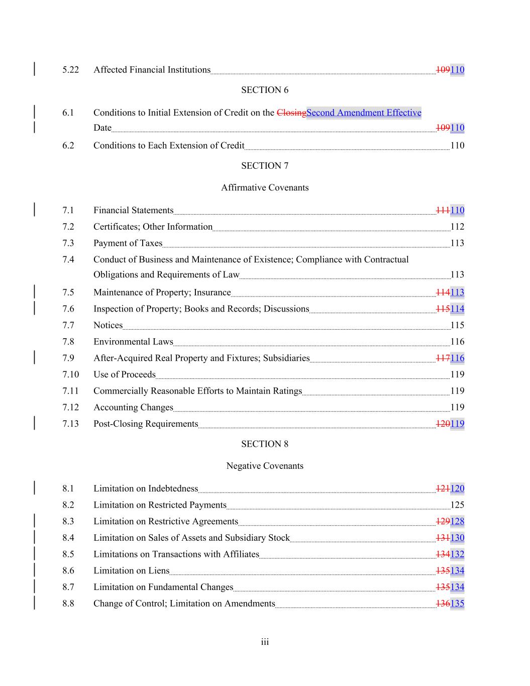 5.22 Affected Financial Institutions 109110 SECTION 6 6.1 Conditions to Initial Extension of Credit on the ClosingSecond Amendment Effective Date 109110 6.2 Conditions to Each Extension of Credit 110 SECTION 7 Affirmative Covenants 7.1 Financial Statements 111110 7.2 Certificates; Other Information 112 7.3 Payment of Taxes 113 7.4 Conduct of Business and Maintenance of Existence; Compliance with Contractual Obligations and Requirements of Law 113 7.5 Maintenance of Property; Insurance 114113 7.6 Inspection of Property; Books and Records; Discussions 115114 7.7 Notices 115 7.8 Environmental Laws 116 7.9 After-Acquired Real Property and Fixtures; Subsidiaries 117116 7.10 Use of Proceeds 119 7.11 Commercially Reasonable Efforts to Maintain Ratings 119 7.12 Accounting Changes 119 7.13 Post-Closing Requirements 120119 SECTION 8 Negative Covenants 8.1 Limitation on Indebtedness 121120 8.2 Limitation on Restricted Payments 125 8.3 Limitation on Restrictive Agreements 129128 8.4 Limitation on Sales of Assets and Subsidiary Stock 131130 8.5 Limitations on Transactions with Affiliates 134132 8.6 Limitation on Liens 135134 8.7 Limitation on Fundamental Changes 135134 8.8 Change of Control; Limitation on Amendments 136135 iii