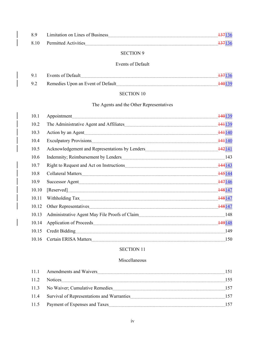 8.9 Limitation on Lines of Business 137136 8.10 Permitted Activities 137136 SECTION 9 Events of Default 9.1 Events of Default 137136 9.2 Remedies Upon an Event of Default 140139 SECTION 10 The Agents and the Other Representatives 10.1 Appointment 140139 10.2 The Administrative Agent and Affiliates 141139 10.3 Action by an Agent 141140 10.4 Exculpatory Provisions 141140 10.5 Acknowledgement and Representations by Lenders 142141 10.6 Indemnity; Reimbursement by Lenders 143 10.7 Right to Request and Act on Instructions 144143 10.8 Collateral Matters 145144 10.9 Successor Agent 147146 10.10 [Reserved] 148147 10.11 Withholding Tax 148147 10.12 Other Representatives 148147 10.13 Administrative Agent May File Proofs of Claim 148 10.14 Application of Proceeds 149148 10.15 Credit Bidding 149 10.16 Certain ERISA Matters 150 SECTION 11 Miscellaneous 11.1 Amendments and Waivers 151 11.2 Notices 155 11.3 No Waiver; Cumulative Remedies 157 11.4 Survival of Representations and Warranties 157 11.5 Payment of Expenses and Taxes 157 iv