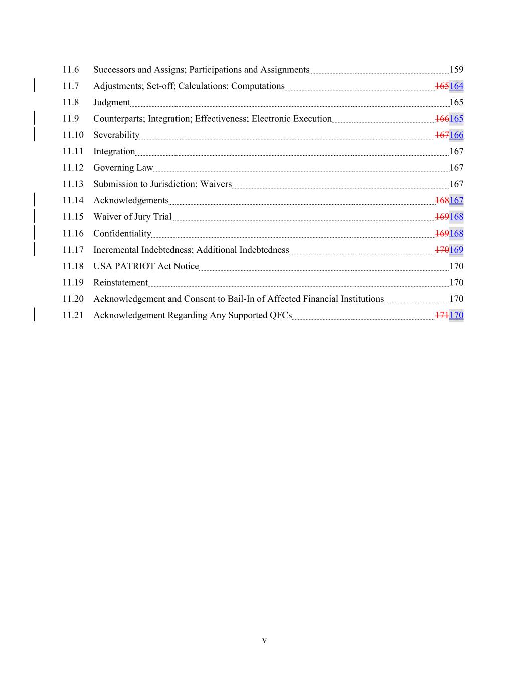 11.6 Successors and Assigns; Participations and Assignments 159 11.7 Adjustments; Set-off; Calculations; Computations 165164 11.8 Judgment 165 11.9 Counterparts; Integration; Effectiveness; Electronic Execution 166165 11.10 Severability 167166 11.11 Integration 167 11.12 Governing Law 167 11.13 Submission to Jurisdiction; Waivers 167 11.14 Acknowledgements 168167 11.15 Waiver of Jury Trial 169168 11.16 Confidentiality 169168 11.17 Incremental Indebtedness; Additional Indebtedness 170169 11.18 USA PATRIOT Act Notice 170 11.19 Reinstatement 170 11.20 Acknowledgement and Consent to Bail-In of Affected Financial Institutions 170 11.21 Acknowledgement Regarding Any Supported QFCs 171170 v