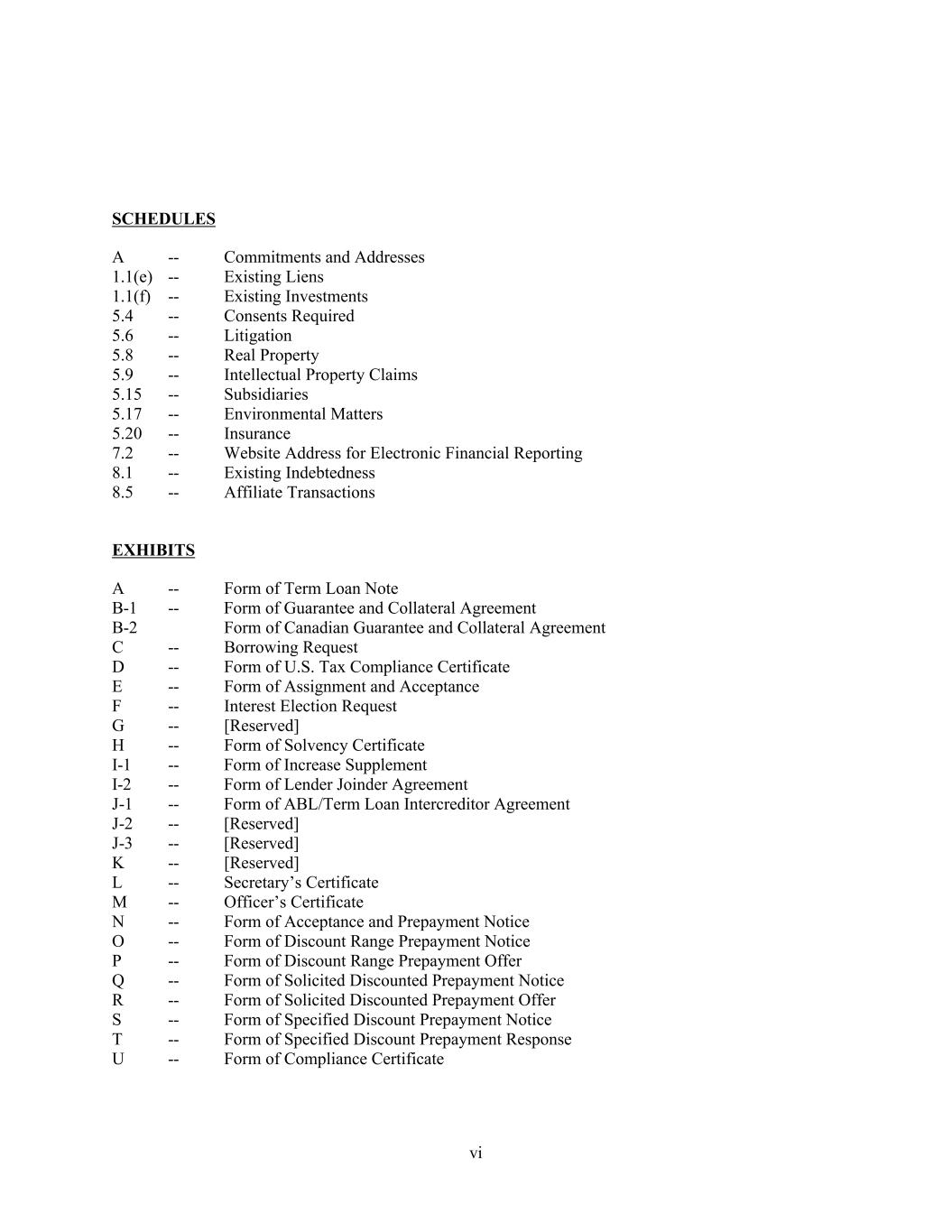 SCHEDULES A -- Commitments and Addresses 1.1(e) -- Existing Liens 1.1(f) -- Existing Investments 5.4 -- Consents Required 5.6 -- Litigation 5.8 -- Real Property 5.9 -- Intellectual Property Claims 5.15 -- Subsidiaries 5.17 -- Environmental Matters 5.20 -- Insurance 7.2 -- Website Address for Electronic Financial Reporting 8.1 -- Existing Indebtedness 8.5 -- Affiliate Transactions EXHIBITS A -- Form of Term Loan Note B-1 -- Form of Guarantee and Collateral Agreement B-2 Form of Canadian Guarantee and Collateral Agreement C -- Borrowing Request D -- Form of U.S. Tax Compliance Certificate E -- Form of Assignment and Acceptance F -- Interest Election Request G -- [Reserved] H -- Form of Solvency Certificate I-1 -- Form of Increase Supplement I-2 -- Form of Lender Joinder Agreement J-1 -- Form of ABL/Term Loan Intercreditor Agreement J-2 -- [Reserved] J-3 -- [Reserved] K -- [Reserved] L -- Secretary’s Certificate M -- Officer’s Certificate N -- Form of Acceptance and Prepayment Notice O -- Form of Discount Range Prepayment Notice P -- Form of Discount Range Prepayment Offer Q -- Form of Solicited Discounted Prepayment Notice R -- Form of Solicited Discounted Prepayment Offer S -- Form of Specified Discount Prepayment Notice T -- Form of Specified Discount Prepayment Response U -- Form of Compliance Certificate vi