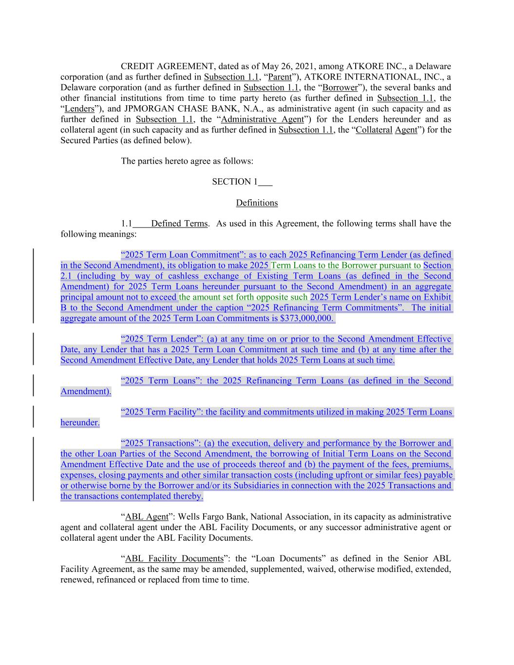 CREDIT AGREEMENT, dated as of May 26, 2021, among ATKORE INC., a Delaware corporation (and as further defined in Subsection 1.1, “Parent”), ATKORE INTERNATIONAL, INC., a Delaware corporation (and as further defined in Subsection 1.1, the “Borrower”), the several banks and other financial institutions from time to time party hereto (as further defined in Subsection 1.1, the “Lenders”), and JPMORGAN CHASE BANK, N.A., as administrative agent (in such capacity and as further defined in Subsection 1.1, the “Administrative Agent”) for the Lenders hereunder and as collateral agent (in such capacity and as further defined in Subsection 1.1, the “Collateral Agent”) for the Secured Parties (as defined below). The parties hereto agree as follows: SECTION 1 Definitions 1.1 Defined Terms. As used in this Agreement, the following terms shall have the following meanings: “2025 Term Loan Commitment”: as to each 2025 Refinancing Term Lender (as defined in the Second Amendment), its obligation to make 2025 Term Loans to the Borrower pursuant to Section 2.1 (including by way of cashless exchange of Existing Term Loans (as defined in the Second Amendment) for 2025 Term Loans hereunder pursuant to the Second Amendment) in an aggregate principal amount not to exceed the amount set forth opposite such 2025 Term Lender’s name on Exhibit B to the Second Amendment under the caption “2025 Refinancing Term Commitments”. The initial aggregate amount of the 2025 Term Loan Commitments is $373,000,000. “2025 Term Lender”: (a) at any time on or prior to the Second Amendment Effective Date, any Lender that has a 2025 Term Loan Commitment at such time and (b) at any time after the Second Amendment Effective Date, any Lender that holds 2025 Term Loans at such time. “2025 Term Loans”: the 2025 Refinancing Term Loans (as defined in the Second Amendment). “2025 Term Facility”: the facility and commitments utilized in making 2025 Term Loans hereunder. “2025 Transactions”: (a) the execution, delivery and performance by the Borrower and the other Loan Parties of the Second Amendment, the borrowing of Initial Term Loans on the Second Amendment Effective Date and the use of proceeds thereof and (b) the payment of the fees, premiums, expenses, closing payments and other similar transaction costs (including upfront or similar fees) payable or otherwise borne by the Borrower and/or its Subsidiaries in connection with the 2025 Transactions and the transactions contemplated thereby. “ABL Agent”: Wells Fargo Bank, National Association, in its capacity as administrative agent and collateral agent under the ABL Facility Documents, or any successor administrative agent or collateral agent under the ABL Facility Documents. “ABL Facility Documents”: the “Loan Documents” as defined in the Senior ABL Facility Agreement, as the same may be amended, supplemented, waived, otherwise modified, extended, renewed, refinanced or replaced from time to time.