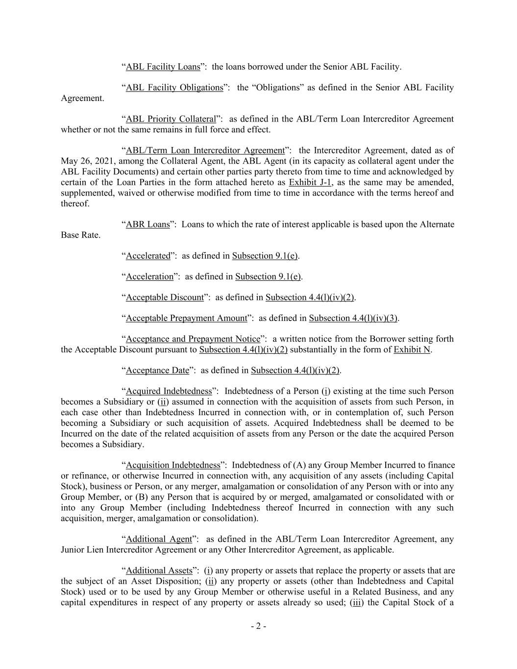 “ABL Facility Loans”: the loans borrowed under the Senior ABL Facility. “ABL Facility Obligations”: the “Obligations” as defined in the Senior ABL Facility Agreement. “ABL Priority Collateral”: as defined in the ABL/Term Loan Intercreditor Agreement whether or not the same remains in full force and effect. “ABL/Term Loan Intercreditor Agreement”: the Intercreditor Agreement, dated as of May 26, 2021, among the Collateral Agent, the ABL Agent (in its capacity as collateral agent under the ABL Facility Documents) and certain other parties party thereto from time to time and acknowledged by certain of the Loan Parties in the form attached hereto as Exhibit J-1, as the same may be amended, supplemented, waived or otherwise modified from time to time in accordance with the terms hereof and thereof. “ABR Loans”: Loans to which the rate of interest applicable is based upon the Alternate Base Rate. “Accelerated”: as defined in Subsection 9.1(e). “Acceleration”: as defined in Subsection 9.1(e). “Acceptable Discount”: as defined in Subsection 4.4(l)(iv)(2). “Acceptable Prepayment Amount”: as defined in Subsection 4.4(l)(iv)(3). “Acceptance and Prepayment Notice”: a written notice from the Borrower setting forth the Acceptable Discount pursuant to Subsection 4.4(l)(iv)(2) substantially in the form of Exhibit N. “Acceptance Date”: as defined in Subsection 4.4(l)(iv)(2). “Acquired Indebtedness”: Indebtedness of a Person (i) existing at the time such Person becomes a Subsidiary or (ii) assumed in connection with the acquisition of assets from such Person, in each case other than Indebtedness Incurred in connection with, or in contemplation of, such Person becoming a Subsidiary or such acquisition of assets. Acquired Indebtedness shall be deemed to be Incurred on the date of the related acquisition of assets from any Person or the date the acquired Person becomes a Subsidiary. “Acquisition Indebtedness”: Indebtedness of (A) any Group Member Incurred to finance or refinance, or otherwise Incurred in connection with, any acquisition of any assets (including Capital Stock), business or Person, or any merger, amalgamation or consolidation of any Person with or into any Group Member, or (B) any Person that is acquired by or merged, amalgamated or consolidated with or into any Group Member (including Indebtedness thereof Incurred in connection with any such acquisition, merger, amalgamation or consolidation). “Additional Agent”: as defined in the ABL/Term Loan Intercreditor Agreement, any Junior Lien Intercreditor Agreement or any Other Intercreditor Agreement, as applicable. “Additional Assets”: (i) any property or assets that replace the property or assets that are the subject of an Asset Disposition; (ii) any property or assets (other than Indebtedness and Capital Stock) used or to be used by any Group Member or otherwise useful in a Related Business, and any capital expenditures in respect of any property or assets already so used; (iii) the Capital Stock of a - 2 -