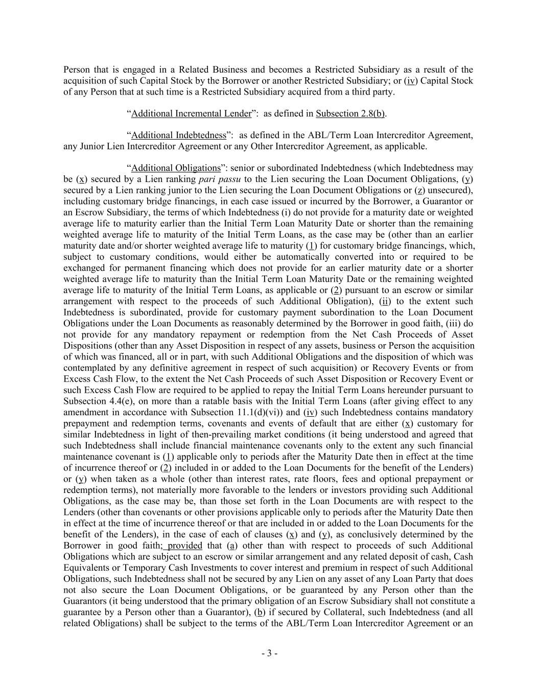 Person that is engaged in a Related Business and becomes a Restricted Subsidiary as a result of the acquisition of such Capital Stock by the Borrower or another Restricted Subsidiary; or (iv) Capital Stock of any Person that at such time is a Restricted Subsidiary acquired from a third party. “Additional Incremental Lender”: as defined in Subsection 2.8(b). “Additional Indebtedness”: as defined in the ABL/Term Loan Intercreditor Agreement, any Junior Lien Intercreditor Agreement or any Other Intercreditor Agreement, as applicable. “Additional Obligations”: senior or subordinated Indebtedness (which Indebtedness may be (x) secured by a Lien ranking pari passu to the Lien securing the Loan Document Obligations, (y) secured by a Lien ranking junior to the Lien securing the Loan Document Obligations or (z) unsecured), including customary bridge financings, in each case issued or incurred by the Borrower, a Guarantor or an Escrow Subsidiary, the terms of which Indebtedness (i) do not provide for a maturity date or weighted average life to maturity earlier than the Initial Term Loan Maturity Date or shorter than the remaining weighted average life to maturity of the Initial Term Loans, as the case may be (other than an earlier maturity date and/or shorter weighted average life to maturity (1) for customary bridge financings, which, subject to customary conditions, would either be automatically converted into or required to be exchanged for permanent financing which does not provide for an earlier maturity date or a shorter weighted average life to maturity than the Initial Term Loan Maturity Date or the remaining weighted average life to maturity of the Initial Term Loans, as applicable or (2) pursuant to an escrow or similar arrangement with respect to the proceeds of such Additional Obligation), (ii) to the extent such Indebtedness is subordinated, provide for customary payment subordination to the Loan Document Obligations under the Loan Documents as reasonably determined by the Borrower in good faith, (iii) do not provide for any mandatory repayment or redemption from the Net Cash Proceeds of Asset Dispositions (other than any Asset Disposition in respect of any assets, business or Person the acquisition of which was financed, all or in part, with such Additional Obligations and the disposition of which was contemplated by any definitive agreement in respect of such acquisition) or Recovery Events or from Excess Cash Flow, to the extent the Net Cash Proceeds of such Asset Disposition or Recovery Event or such Excess Cash Flow are required to be applied to repay the Initial Term Loans hereunder pursuant to Subsection 4.4(e), on more than a ratable basis with the Initial Term Loans (after giving effect to any amendment in accordance with Subsection 11.1(d)(vi)) and (iv) such Indebtedness contains mandatory prepayment and redemption terms, covenants and events of default that are either (x) customary for similar Indebtedness in light of then-prevailing market conditions (it being understood and agreed that such Indebtedness shall include financial maintenance covenants only to the extent any such financial maintenance covenant is (1) applicable only to periods after the Maturity Date then in effect at the time of incurrence thereof or (2) included in or added to the Loan Documents for the benefit of the Lenders) or (y) when taken as a whole (other than interest rates, rate floors, fees and optional prepayment or redemption terms), not materially more favorable to the lenders or investors providing such Additional Obligations, as the case may be, than those set forth in the Loan Documents are with respect to the Lenders (other than covenants or other provisions applicable only to periods after the Maturity Date then in effect at the time of incurrence thereof or that are included in or added to the Loan Documents for the benefit of the Lenders), in the case of each of clauses (x) and (y), as conclusively determined by the Borrower in good faith; provided that (a) other than with respect to proceeds of such Additional Obligations which are subject to an escrow or similar arrangement and any related deposit of cash, Cash Equivalents or Temporary Cash Investments to cover interest and premium in respect of such Additional Obligations, such Indebtedness shall not be secured by any Lien on any asset of any Loan Party that does not also secure the Loan Document Obligations, or be guaranteed by any Person other than the Guarantors (it being understood that the primary obligation of an Escrow Subsidiary shall not constitute a guarantee by a Person other than a Guarantor), (b) if secured by Collateral, such Indebtedness (and all related Obligations) shall be subject to the terms of the ABL/Term Loan Intercreditor Agreement or an - 3 -