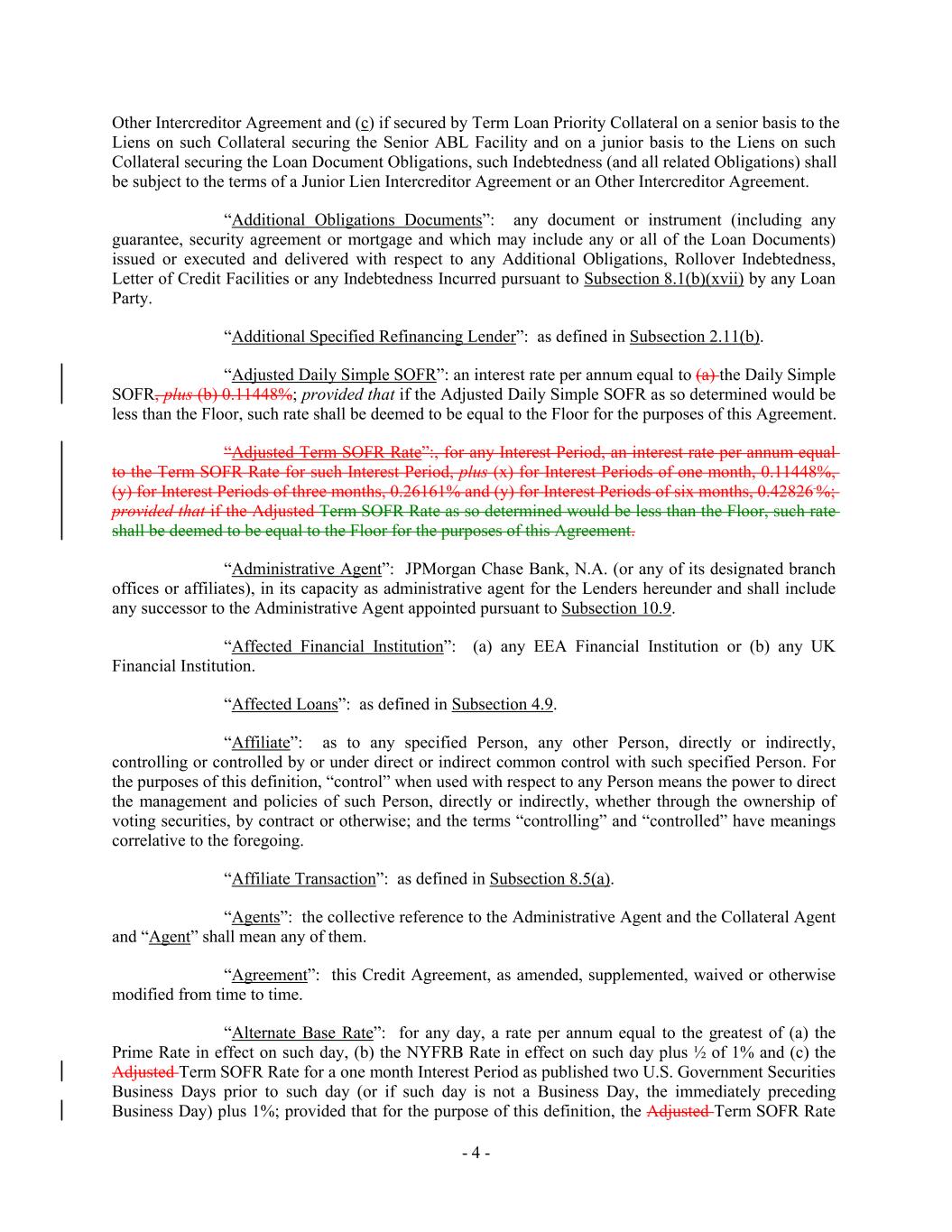 Other Intercreditor Agreement and (c) if secured by Term Loan Priority Collateral on a senior basis to the Liens on such Collateral securing the Senior ABL Facility and on a junior basis to the Liens on such Collateral securing the Loan Document Obligations, such Indebtedness (and all related Obligations) shall be subject to the terms of a Junior Lien Intercreditor Agreement or an Other Intercreditor Agreement. “Additional Obligations Documents”: any document or instrument (including any guarantee, security agreement or mortgage and which may include any or all of the Loan Documents) issued or executed and delivered with respect to any Additional Obligations, Rollover Indebtedness, Letter of Credit Facilities or any Indebtedness Incurred pursuant to Subsection 8.1(b)(xvii) by any Loan Party. “Additional Specified Refinancing Lender”: as defined in Subsection 2.11(b). “Adjusted Daily Simple SOFR”: an interest rate per annum equal to (a) the Daily Simple SOFR, plus (b) 0.11448%; provided that if the Adjusted Daily Simple SOFR as so determined would be less than the Floor, such rate shall be deemed to be equal to the Floor for the purposes of this Agreement. “Adjusted Term SOFR Rate”:, for any Interest Period, an interest rate per annum equal to the Term SOFR Rate for such Interest Period, plus (x) for Interest Periods of one month, 0.11448%, (y) for Interest Periods of three months, 0.26161% and (y) for Interest Periods of six months, 0.42826 %; provided that if the Adjusted Term SOFR Rate as so determined would be less than the Floor, such rate shall be deemed to be equal to the Floor for the purposes of this Agreement. “Administrative Agent”: JPMorgan Chase Bank, N.A. (or any of its designated branch offices or affiliates), in its capacity as administrative agent for the Lenders hereunder and shall include any successor to the Administrative Agent appointed pursuant to Subsection 10.9. “Affected Financial Institution”: (a) any EEA Financial Institution or (b) any UK Financial Institution. “Affected Loans”: as defined in Subsection 4.9. “Affiliate”: as to any specified Person, any other Person, directly or indirectly, controlling or controlled by or under direct or indirect common control with such specified Person. For the purposes of this definition, “control” when used with respect to any Person means the power to direct the management and policies of such Person, directly or indirectly, whether through the ownership of voting securities, by contract or otherwise; and the terms “controlling” and “controlled” have meanings correlative to the foregoing. “Affiliate Transaction”: as defined in Subsection 8.5(a). “Agents”: the collective reference to the Administrative Agent and the Collateral Agent and “Agent” shall mean any of them. “Agreement”: this Credit Agreement, as amended, supplemented, waived or otherwise modified from time to time. “Alternate Base Rate”: for any day, a rate per annum equal to the greatest of (a) the Prime Rate in effect on such day, (b) the NYFRB Rate in effect on such day plus ½ of 1% and (c) the Adjusted Term SOFR Rate for a one month Interest Period as published two U.S. Government Securities Business Days prior to such day (or if such day is not a Business Day, the immediately preceding Business Day) plus 1%; provided that for the purpose of this definition, the Adjusted Term SOFR Rate - 4 -