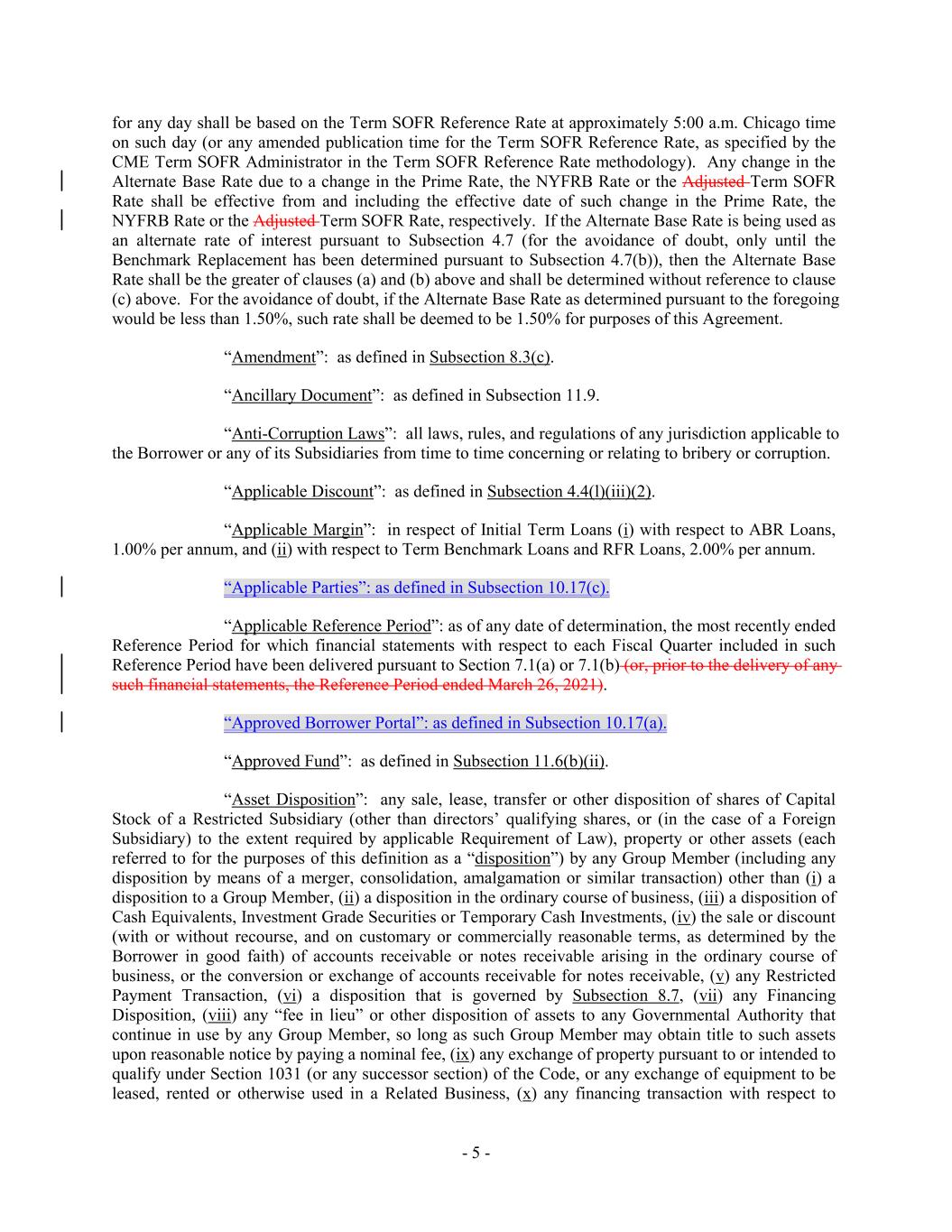 for any day shall be based on the Term SOFR Reference Rate at approximately 5:00 a.m. Chicago time on such day (or any amended publication time for the Term SOFR Reference Rate, as specified by the CME Term SOFR Administrator in the Term SOFR Reference Rate methodology). Any change in the Alternate Base Rate due to a change in the Prime Rate, the NYFRB Rate or the Adjusted Term SOFR Rate shall be effective from and including the effective date of such change in the Prime Rate, the NYFRB Rate or the Adjusted Term SOFR Rate, respectively. If the Alternate Base Rate is being used as an alternate rate of interest pursuant to Subsection 4.7 (for the avoidance of doubt, only until the Benchmark Replacement has been determined pursuant to Subsection 4.7(b)), then the Alternate Base Rate shall be the greater of clauses (a) and (b) above and shall be determined without reference to clause (c) above. For the avoidance of doubt, if the Alternate Base Rate as determined pursuant to the foregoing would be less than 1.50%, such rate shall be deemed to be 1.50% for purposes of this Agreement. “Amendment”: as defined in Subsection 8.3(c). “Ancillary Document”: as defined in Subsection 11.9. “Anti-Corruption Laws”: all laws, rules, and regulations of any jurisdiction applicable to the Borrower or any of its Subsidiaries from time to time concerning or relating to bribery or corruption. “Applicable Discount”: as defined in Subsection 4.4(l)(iii)(2). “Applicable Margin”: in respect of Initial Term Loans (i) with respect to ABR Loans, 1.00% per annum, and (ii) with respect to Term Benchmark Loans and RFR Loans, 2.00% per annum. “Applicable Parties”: as defined in Subsection 10.17(c). “Applicable Reference Period”: as of any date of determination, the most recently ended Reference Period for which financial statements with respect to each Fiscal Quarter included in such Reference Period have been delivered pursuant to Section 7.1(a) or 7.1(b) (or, prior to the delivery of any such financial statements, the Reference Period ended March 26, 2021). “Approved Borrower Portal”: as defined in Subsection 10.17(a). “Approved Fund”: as defined in Subsection 11.6(b)(ii). “Asset Disposition”: any sale, lease, transfer or other disposition of shares of Capital Stock of a Restricted Subsidiary (other than directors’ qualifying shares, or (in the case of a Foreign Subsidiary) to the extent required by applicable Requirement of Law), property or other assets (each referred to for the purposes of this definition as a “disposition”) by any Group Member (including any disposition by means of a merger, consolidation, amalgamation or similar transaction) other than (i) a disposition to a Group Member, (ii) a disposition in the ordinary course of business, (iii) a disposition of Cash Equivalents, Investment Grade Securities or Temporary Cash Investments, (iv) the sale or discount (with or without recourse, and on customary or commercially reasonable terms, as determined by the Borrower in good faith) of accounts receivable or notes receivable arising in the ordinary course of business, or the conversion or exchange of accounts receivable for notes receivable, (v) any Restricted Payment Transaction, (vi) a disposition that is governed by Subsection 8.7, (vii) any Financing Disposition, (viii) any “fee in lieu” or other disposition of assets to any Governmental Authority that continue in use by any Group Member, so long as such Group Member may obtain title to such assets upon reasonable notice by paying a nominal fee, (ix) any exchange of property pursuant to or intended to qualify under Section 1031 (or any successor section) of the Code, or any exchange of equipment to be leased, rented or otherwise used in a Related Business, (x) any financing transaction with respect to - 5 -