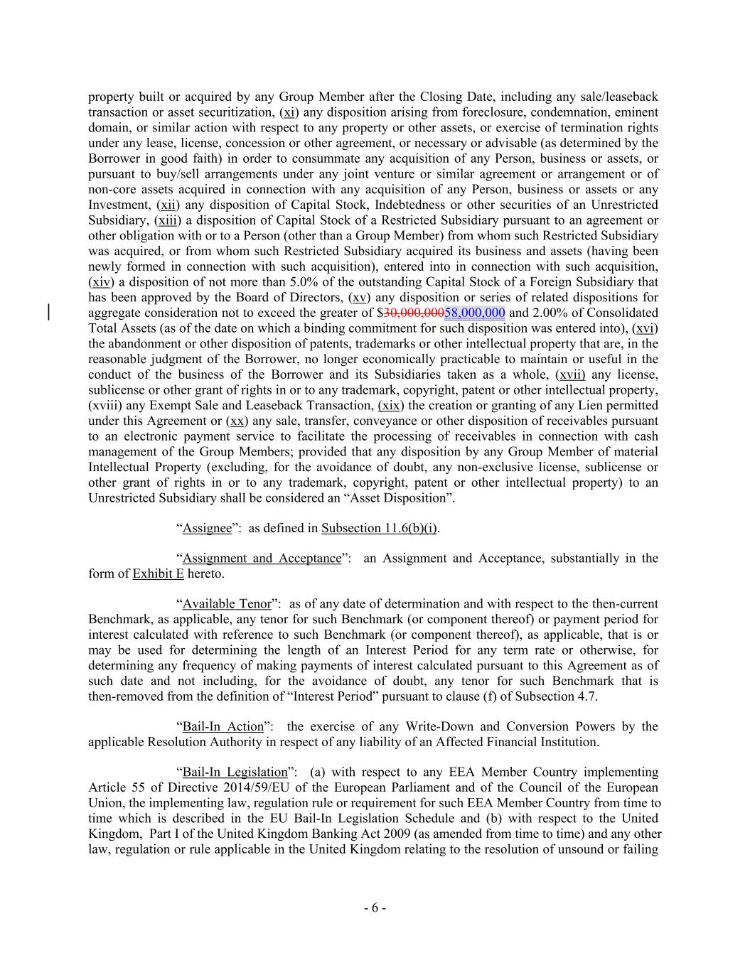 property built or acquired by any Group Member after the Closing Date, including any sale/leaseback transaction or asset securitization, (xi) any disposition arising from foreclosure, condemnation, eminent domain, or similar action with respect to any property or other assets, or exercise of termination rights under any lease, license, concession or other agreement, or necessary or advisable (as determined by the Borrower in good faith) in order to consummate any acquisition of any Person, business or assets, or pursuant to buy/sell arrangements under any joint venture or similar agreement or arrangement or of non-core assets acquired in connection with any acquisition of any Person, business or assets or any Investment, (xii) any disposition of Capital Stock, Indebtedness or other securities of an Unrestricted Subsidiary, (xiii) a disposition of Capital Stock of a Restricted Subsidiary pursuant to an agreement or other obligation with or to a Person (other than a Group Member) from whom such Restricted Subsidiary was acquired, or from whom such Restricted Subsidiary acquired its business and assets (having been newly formed in connection with such acquisition), entered into in connection with such acquisition, (xiv) a disposition of not more than 5.0% of the outstanding Capital Stock of a Foreign Subsidiary that has been approved by the Board of Directors, (xv) any disposition or series of related dispositions for aggregate consideration not to exceed the greater of $30,000,00058,000,000 and 2.00% of Consolidated Total Assets (as of the date on which a binding commitment for such disposition was entered into), (xvi) the abandonment or other disposition of patents, trademarks or other intellectual property that are, in the reasonable judgment of the Borrower, no longer economically practicable to maintain or useful in the conduct of the business of the Borrower and its Subsidiaries taken as a whole, (xvii) any license, sublicense or other grant of rights in or to any trademark, copyright, patent or other intellectual property, (xviii) any Exempt Sale and Leaseback Transaction, (xix) the creation or granting of any Lien permitted under this Agreement or (xx) any sale, transfer, conveyance or other disposition of receivables pursuant to an electronic payment service to facilitate the processing of receivables in connection with cash management of the Group Members; provided that any disposition by any Group Member of material Intellectual Property (excluding, for the avoidance of doubt, any non-exclusive license, sublicense or other grant of rights in or to any trademark, copyright, patent or other intellectual property) to an Unrestricted Subsidiary shall be considered an “Asset Disposition”. “Assignee”: as defined in Subsection 11.6(b)(i). “Assignment and Acceptance”: an Assignment and Acceptance, substantially in the form of Exhibit E hereto. “Available Tenor”: as of any date of determination and with respect to the then-current Benchmark, as applicable, any tenor for such Benchmark (or component thereof) or payment period for interest calculated with reference to such Benchmark (or component thereof), as applicable, that is or may be used for determining the length of an Interest Period for any term rate or otherwise, for determining any frequency of making payments of interest calculated pursuant to this Agreement as of such date and not including, for the avoidance of doubt, any tenor for such Benchmark that is then-removed from the definition of “Interest Period” pursuant to clause (f) of Subsection 4.7. “Bail-In Action”: the exercise of any Write-Down and Conversion Powers by the applicable Resolution Authority in respect of any liability of an Affected Financial Institution. “Bail-In Legislation”: (a) with respect to any EEA Member Country implementing Article 55 of Directive 2014/59/EU of the European Parliament and of the Council of the European Union, the implementing law, regulation rule or requirement for such EEA Member Country from time to time which is described in the EU Bail-In Legislation Schedule and (b) with respect to the United Kingdom, Part I of the United Kingdom Banking Act 2009 (as amended from time to time) and any other law, regulation or rule applicable in the United Kingdom relating to the resolution of unsound or failing - 6 -