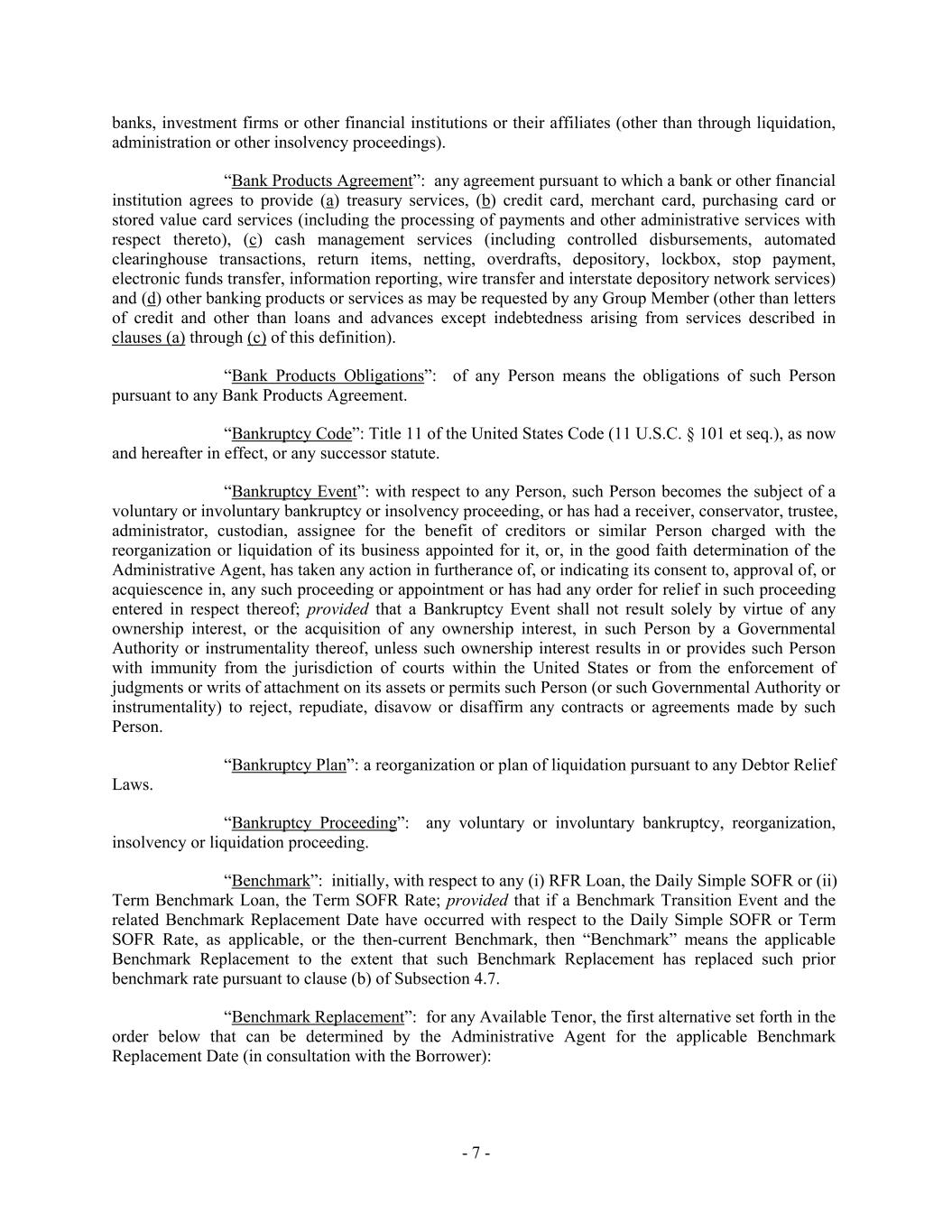 banks, investment firms or other financial institutions or their affiliates (other than through liquidation, administration or other insolvency proceedings). “Bank Products Agreement”: any agreement pursuant to which a bank or other financial institution agrees to provide (a) treasury services, (b) credit card, merchant card, purchasing card or stored value card services (including the processing of payments and other administrative services with respect thereto), (c) cash management services (including controlled disbursements, automated clearinghouse transactions, return items, netting, overdrafts, depository, lockbox, stop payment, electronic funds transfer, information reporting, wire transfer and interstate depository network services) and (d) other banking products or services as may be requested by any Group Member (other than letters of credit and other than loans and advances except indebtedness arising from services described in clauses (a) through (c) of this definition). “Bank Products Obligations”: of any Person means the obligations of such Person pursuant to any Bank Products Agreement. “Bankruptcy Code”: Title 11 of the United States Code (11 U.S.C. § 101 et seq.), as now and hereafter in effect, or any successor statute. “Bankruptcy Event”: with respect to any Person, such Person becomes the subject of a voluntary or involuntary bankruptcy or insolvency proceeding, or has had a receiver, conservator, trustee, administrator, custodian, assignee for the benefit of creditors or similar Person charged with the reorganization or liquidation of its business appointed for it, or, in the good faith determination of the Administrative Agent, has taken any action in furtherance of, or indicating its consent to, approval of, or acquiescence in, any such proceeding or appointment or has had any order for relief in such proceeding entered in respect thereof; provided that a Bankruptcy Event shall not result solely by virtue of any ownership interest, or the acquisition of any ownership interest, in such Person by a Governmental Authority or instrumentality thereof, unless such ownership interest results in or provides such Person with immunity from the jurisdiction of courts within the United States or from the enforcement of judgments or writs of attachment on its assets or permits such Person (or such Governmental Authority or instrumentality) to reject, repudiate, disavow or disaffirm any contracts or agreements made by such Person. “Bankruptcy Plan”: a reorganization or plan of liquidation pursuant to any Debtor Relief Laws. “Bankruptcy Proceeding”: any voluntary or involuntary bankruptcy, reorganization, insolvency or liquidation proceeding. “Benchmark”: initially, with respect to any (i) RFR Loan, the Daily Simple SOFR or (ii) Term Benchmark Loan, the Term SOFR Rate; provided that if a Benchmark Transition Event and the related Benchmark Replacement Date have occurred with respect to the Daily Simple SOFR or Term SOFR Rate, as applicable, or the then-current Benchmark, then “Benchmark” means the applicable Benchmark Replacement to the extent that such Benchmark Replacement has replaced such prior benchmark rate pursuant to clause (b) of Subsection 4.7. “Benchmark Replacement”: for any Available Tenor, the first alternative set forth in the order below that can be determined by the Administrative Agent for the applicable Benchmark Replacement Date (in consultation with the Borrower): - 7 -
