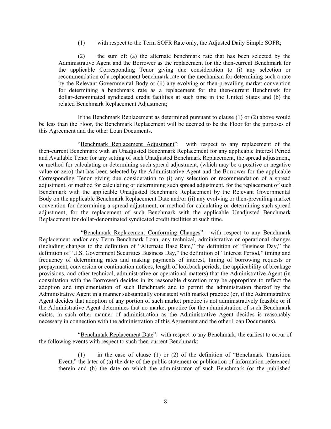 (1) with respect to the Term SOFR Rate only, the Adjusted Daily Simple SOFR; (2) the sum of: (a) the alternate benchmark rate that has been selected by the Administrative Agent and the Borrower as the replacement for the then-current Benchmark for the applicable Corresponding Tenor giving due consideration to (i) any selection or recommendation of a replacement benchmark rate or the mechanism for determining such a rate by the Relevant Governmental Body or (ii) any evolving or then-prevailing market convention for determining a benchmark rate as a replacement for the then-current Benchmark for dollar-denominated syndicated credit facilities at such time in the United States and (b) the related Benchmark Replacement Adjustment; If the Benchmark Replacement as determined pursuant to clause (1) or (2) above would be less than the Floor, the Benchmark Replacement will be deemed to be the Floor for the purposes of this Agreement and the other Loan Documents. “Benchmark Replacement Adjustment”: with respect to any replacement of the then-current Benchmark with an Unadjusted Benchmark Replacement for any applicable Interest Period and Available Tenor for any setting of such Unadjusted Benchmark Replacement, the spread adjustment, or method for calculating or determining such spread adjustment, (which may be a positive or negative value or zero) that has been selected by the Administrative Agent and the Borrower for the applicable Corresponding Tenor giving due consideration to (i) any selection or recommendation of a spread adjustment, or method for calculating or determining such spread adjustment, for the replacement of such Benchmark with the applicable Unadjusted Benchmark Replacement by the Relevant Governmental Body on the applicable Benchmark Replacement Date and/or (ii) any evolving or then-prevailing market convention for determining a spread adjustment, or method for calculating or determining such spread adjustment, for the replacement of such Benchmark with the applicable Unadjusted Benchmark Replacement for dollar-denominated syndicated credit facilities at such time. “Benchmark Replacement Conforming Changes”: with respect to any Benchmark Replacement and/or any Term Benchmark Loan, any technical, administrative or operational changes (including changes to the definition of “Alternate Base Rate,” the definition of “Business Day,” the definition of “U.S. Government Securities Business Day,” the definition of “Interest Period,” timing and frequency of determining rates and making payments of interest, timing of borrowing requests or prepayment, conversion or continuation notices, length of lookback periods, the applicability of breakage provisions, and other technical, administrative or operational matters) that the Administrative Agent (in consultation with the Borrower) decides in its reasonable discretion may be appropriate to reflect the adoption and implementation of such Benchmark and to permit the administration thereof by the Administrative Agent in a manner substantially consistent with market practice (or, if the Administrative Agent decides that adoption of any portion of such market practice is not administratively feasible or if the Administrative Agent determines that no market practice for the administration of such Benchmark exists, in such other manner of administration as the Administrative Agent decides is reasonably necessary in connection with the administration of this Agreement and the other Loan Documents). “Benchmark Replacement Date”: with respect to any Benchmark, the earliest to occur of the following events with respect to such then-current Benchmark: (1) in the case of clause (1) or (2) of the definition of “Benchmark Transition Event,” the later of (a) the date of the public statement or publication of information referenced therein and (b) the date on which the administrator of such Benchmark (or the published - 8 -