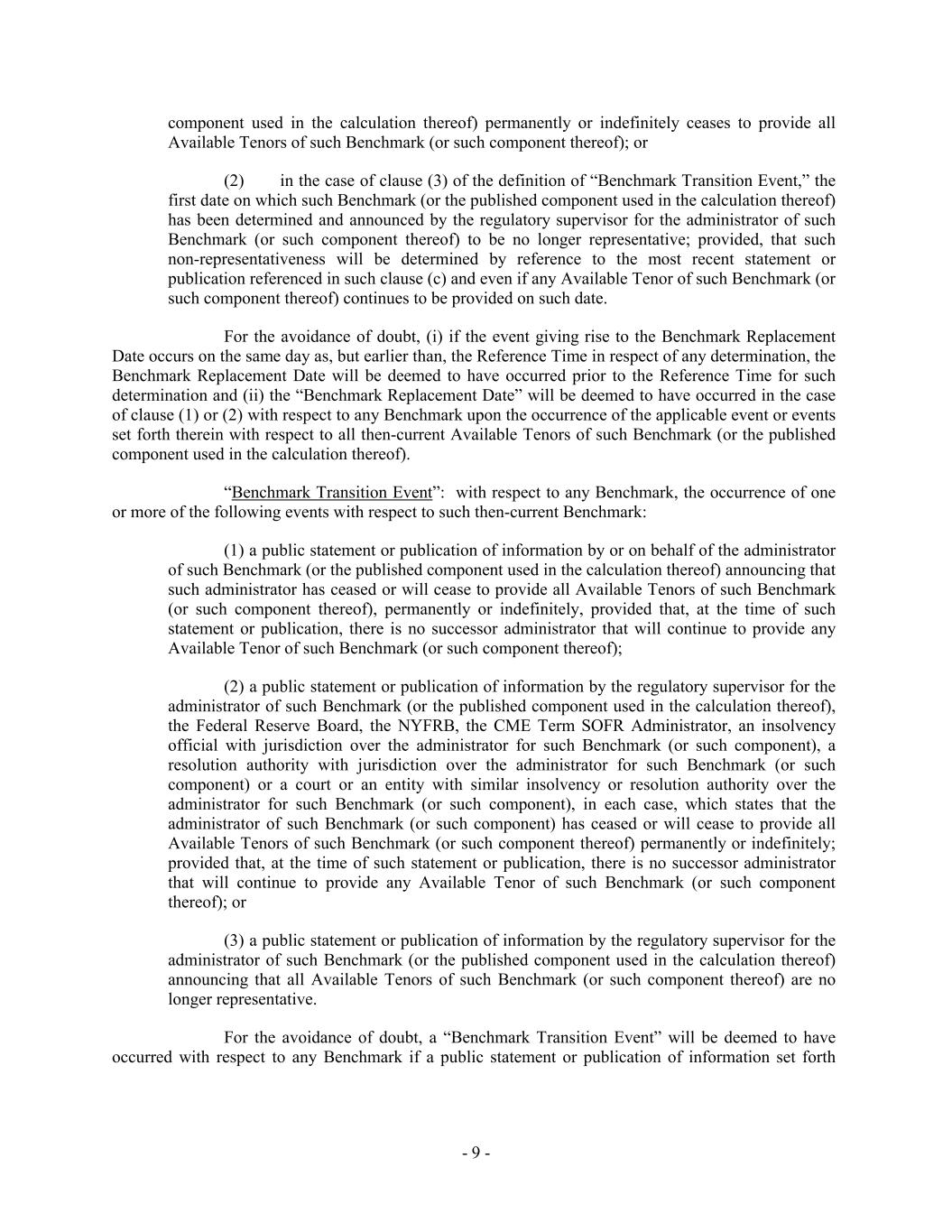 component used in the calculation thereof) permanently or indefinitely ceases to provide all Available Tenors of such Benchmark (or such component thereof); or (2) in the case of clause (3) of the definition of “Benchmark Transition Event,” the first date on which such Benchmark (or the published component used in the calculation thereof) has been determined and announced by the regulatory supervisor for the administrator of such Benchmark (or such component thereof) to be no longer representative; provided, that such non-representativeness will be determined by reference to the most recent statement or publication referenced in such clause (c) and even if any Available Tenor of such Benchmark (or such component thereof) continues to be provided on such date. For the avoidance of doubt, (i) if the event giving rise to the Benchmark Replacement Date occurs on the same day as, but earlier than, the Reference Time in respect of any determination, the Benchmark Replacement Date will be deemed to have occurred prior to the Reference Time for such determination and (ii) the “Benchmark Replacement Date” will be deemed to have occurred in the case of clause (1) or (2) with respect to any Benchmark upon the occurrence of the applicable event or events set forth therein with respect to all then-current Available Tenors of such Benchmark (or the published component used in the calculation thereof). “Benchmark Transition Event”: with respect to any Benchmark, the occurrence of one or more of the following events with respect to such then-current Benchmark: (1) a public statement or publication of information by or on behalf of the administrator of such Benchmark (or the published component used in the calculation thereof) announcing that such administrator has ceased or will cease to provide all Available Tenors of such Benchmark (or such component thereof), permanently or indefinitely, provided that, at the time of such statement or publication, there is no successor administrator that will continue to provide any Available Tenor of such Benchmark (or such component thereof); (2) a public statement or publication of information by the regulatory supervisor for the administrator of such Benchmark (or the published component used in the calculation thereof), the Federal Reserve Board, the NYFRB, the CME Term SOFR Administrator, an insolvency official with jurisdiction over the administrator for such Benchmark (or such component), a resolution authority with jurisdiction over the administrator for such Benchmark (or such component) or a court or an entity with similar insolvency or resolution authority over the administrator for such Benchmark (or such component), in each case, which states that the administrator of such Benchmark (or such component) has ceased or will cease to provide all Available Tenors of such Benchmark (or such component thereof) permanently or indefinitely; provided that, at the time of such statement or publication, there is no successor administrator that will continue to provide any Available Tenor of such Benchmark (or such component thereof); or (3) a public statement or publication of information by the regulatory supervisor for the administrator of such Benchmark (or the published component used in the calculation thereof) announcing that all Available Tenors of such Benchmark (or such component thereof) are no longer representative. For the avoidance of doubt, a “Benchmark Transition Event” will be deemed to have occurred with respect to any Benchmark if a public statement or publication of information set forth - 9 -