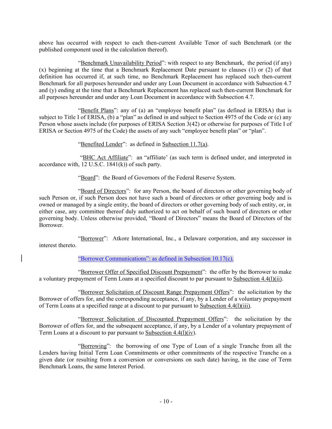 above has occurred with respect to each then-current Available Tenor of such Benchmark (or the published component used in the calculation thereof). “Benchmark Unavailability Period”: with respect to any Benchmark, the period (if any) (x) beginning at the time that a Benchmark Replacement Date pursuant to clauses (1) or (2) of that definition has occurred if, at such time, no Benchmark Replacement has replaced such then-current Benchmark for all purposes hereunder and under any Loan Document in accordance with Subsection 4.7 and (y) ending at the time that a Benchmark Replacement has replaced such then-current Benchmark for all purposes hereunder and under any Loan Document in accordance with Subsection 4.7. “Benefit Plans”: any of (a) an “employee benefit plan” (as defined in ERISA) that is subject to Title I of ERISA, (b) a “plan” as defined in and subject to Section 4975 of the Code or (c) any Person whose assets include (for purposes of ERISA Section 3(42) or otherwise for purposes of Title I of ERISA or Section 4975 of the Code) the assets of any such “employee benefit plan” or “plan”. “Benefited Lender”: as defined in Subsection 11.7(a). “BHC Act Affiliate”: an “affiliate’ (as such term is defined under, and interpreted in accordance with, 12 U.S.C. 1841(k)) of such party. “Board”: the Board of Governors of the Federal Reserve System. “Board of Directors”: for any Person, the board of directors or other governing body of such Person or, if such Person does not have such a board of directors or other governing body and is owned or managed by a single entity, the board of directors or other governing body of such entity, or, in either case, any committee thereof duly authorized to act on behalf of such board of directors or other governing body. Unless otherwise provided, “Board of Directors” means the Board of Directors of the Borrower. “Borrower”: Atkore International, Inc., a Delaware corporation, and any successor in interest thereto. “Borrower Communications”: as defined in Subsection 10.17(c). “Borrower Offer of Specified Discount Prepayment”: the offer by the Borrower to make a voluntary prepayment of Term Loans at a specified discount to par pursuant to Subsection 4.4(l)(ii). “Borrower Solicitation of Discount Range Prepayment Offers”: the solicitation by the Borrower of offers for, and the corresponding acceptance, if any, by a Lender of a voluntary prepayment of Term Loans at a specified range at a discount to par pursuant to Subsection 4.4(l)(iii). “Borrower Solicitation of Discounted Prepayment Offers”: the solicitation by the Borrower of offers for, and the subsequent acceptance, if any, by a Lender of a voluntary prepayment of Term Loans at a discount to par pursuant to Subsection 4.4(l)(iv). “Borrowing”: the borrowing of one Type of Loan of a single Tranche from all the Lenders having Initial Term Loan Commitments or other commitments of the respective Tranche on a given date (or resulting from a conversion or conversions on such date) having, in the case of Term Benchmark Loans, the same Interest Period. - 10 -