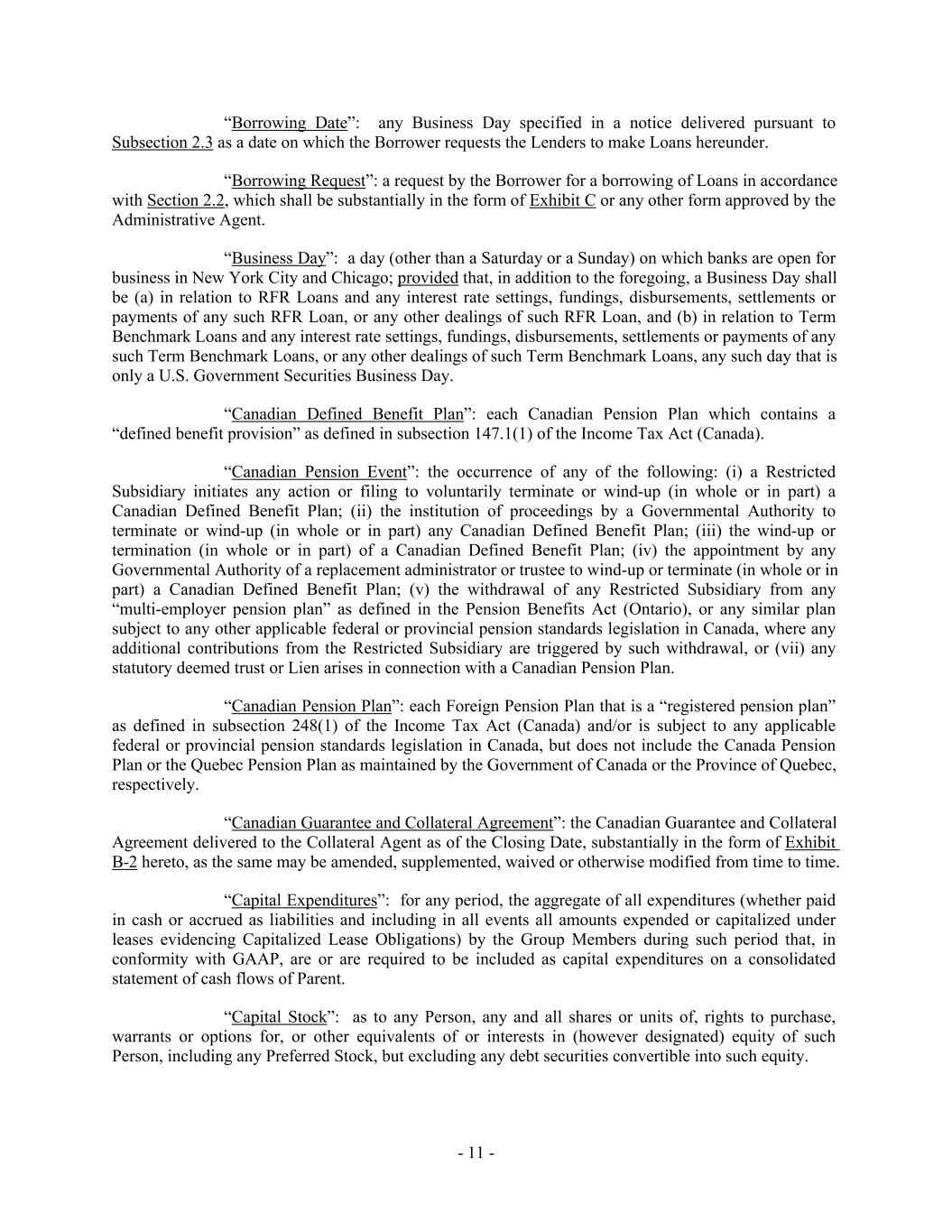 “Borrowing Date”: any Business Day specified in a notice delivered pursuant to Subsection 2.3 as a date on which the Borrower requests the Lenders to make Loans hereunder. “Borrowing Request”: a request by the Borrower for a borrowing of Loans in accordance with Section 2.2, which shall be substantially in the form of Exhibit C or any other form approved by the Administrative Agent. “Business Day”: a day (other than a Saturday or a Sunday) on which banks are open for business in New York City and Chicago; provided that, in addition to the foregoing, a Business Day shall be (a) in relation to RFR Loans and any interest rate settings, fundings, disbursements, settlements or payments of any such RFR Loan, or any other dealings of such RFR Loan, and (b) in relation to Term Benchmark Loans and any interest rate settings, fundings, disbursements, settlements or payments of any such Term Benchmark Loans, or any other dealings of such Term Benchmark Loans, any such day that is only a U.S. Government Securities Business Day. “Canadian Defined Benefit Plan”: each Canadian Pension Plan which contains a “defined benefit provision” as defined in subsection 147.1(1) of the Income Tax Act (Canada). “Canadian Pension Event”: the occurrence of any of the following: (i) a Restricted Subsidiary initiates any action or filing to voluntarily terminate or wind-up (in whole or in part) a Canadian Defined Benefit Plan; (ii) the institution of proceedings by a Governmental Authority to terminate or wind-up (in whole or in part) any Canadian Defined Benefit Plan; (iii) the wind-up or termination (in whole or in part) of a Canadian Defined Benefit Plan; (iv) the appointment by any Governmental Authority of a replacement administrator or trustee to wind-up or terminate (in whole or in part) a Canadian Defined Benefit Plan; (v) the withdrawal of any Restricted Subsidiary from any “multi-employer pension plan” as defined in the Pension Benefits Act (Ontario), or any similar plan subject to any other applicable federal or provincial pension standards legislation in Canada, where any additional contributions from the Restricted Subsidiary are triggered by such withdrawal, or (vii) any statutory deemed trust or Lien arises in connection with a Canadian Pension Plan. “Canadian Pension Plan”: each Foreign Pension Plan that is a “registered pension plan” as defined in subsection 248(1) of the Income Tax Act (Canada) and/or is subject to any applicable federal or provincial pension standards legislation in Canada, but does not include the Canada Pension Plan or the Quebec Pension Plan as maintained by the Government of Canada or the Province of Quebec, respectively. “Canadian Guarantee and Collateral Agreement”: the Canadian Guarantee and Collateral Agreement delivered to the Collateral Agent as of the Closing Date, substantially in the form of Exhibit B-2 hereto, as the same may be amended, supplemented, waived or otherwise modified from time to time. “Capital Expenditures”: for any period, the aggregate of all expenditures (whether paid in cash or accrued as liabilities and including in all events all amounts expended or capitalized under leases evidencing Capitalized Lease Obligations) by the Group Members during such period that, in conformity with GAAP, are or are required to be included as capital expenditures on a consolidated statement of cash flows of Parent. “Capital Stock”: as to any Person, any and all shares or units of, rights to purchase, warrants or options for, or other equivalents of or interests in (however designated) equity of such Person, including any Preferred Stock, but excluding any debt securities convertible into such equity. - 11 -