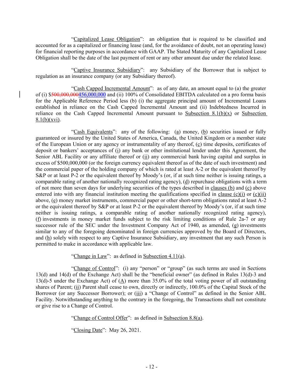 “Capitalized Lease Obligation”: an obligation that is required to be classified and accounted for as a capitalized or financing lease (and, for the avoidance of doubt, not an operating lease) for financial reporting purposes in accordance with GAAP. The Stated Maturity of any Capitalized Lease Obligation shall be the date of the last payment of rent or any other amount due under the related lease. “Captive Insurance Subsidiary”: any Subsidiary of the Borrower that is subject to regulation as an insurance company (or any Subsidiary thereof). “Cash Capped Incremental Amount”: as of any date, an amount equal to (a) the greater of (i) $500,000,000456,000,000 and (ii) 100% of Consolidated EBITDA calculated on a pro forma basis for the Applicable Reference Period less (b) (i) the aggregate principal amount of Incremental Loans established in reliance on the Cash Capped Incremental Amount and (ii) Indebtedness Incurred in reliance on the Cash Capped Incremental Amount pursuant to Subsection 8.1(b)(x) or Subsection 8.1(b)(xvi). “Cash Equivalents”: any of the following: (a) money, (b) securities issued or fully guaranteed or insured by the United States of America, Canada, the United Kingdom or a member state of the European Union or any agency or instrumentality of any thereof, (c) time deposits, certificates of deposit or bankers’ acceptances of (i) any bank or other institutional lender under this Agreement, the Senior ABL Facility or any affiliate thereof or (ii) any commercial bank having capital and surplus in excess of $500,000,000 (or the foreign currency equivalent thereof as of the date of such investment) and the commercial paper of the holding company of which is rated at least A-2 or the equivalent thereof by S&P or at least P-2 or the equivalent thereof by Moody’s (or, if at such time neither is issuing ratings, a comparable rating of another nationally recognized rating agency), (d) repurchase obligations with a term of not more than seven days for underlying securities of the types described in clauses (b) and (c) above entered into with any financial institution meeting the qualifications specified in clause (c)(i) or (c)(ii) above, (e) money market instruments, commercial paper or other short-term obligations rated at least A-2 or the equivalent thereof by S&P or at least P-2 or the equivalent thereof by Moody’s (or, if at such time neither is issuing ratings, a comparable rating of another nationally recognized rating agency), (f) investments in money market funds subject to the risk limiting conditions of Rule 2a-7 or any successor rule of the SEC under the Investment Company Act of 1940, as amended, (g) investments similar to any of the foregoing denominated in foreign currencies approved by the Board of Directors, and (h) solely with respect to any Captive Insurance Subsidiary, any investment that any such Person is permitted to make in accordance with applicable law. “Change in Law”: as defined in Subsection 4.11(a). “Change of Control”: (i) any “person” or “group” (as such terms are used in Sections 13(d) and 14(d) of the Exchange Act) shall be the “beneficial owner” (as defined in Rules 13(d)-3 and 13(d)-5 under the Exchange Act) of (A) more than 35.0% of the total voting power of all outstanding shares of Parent; (ii) Parent shall cease to own, directly or indirectly, 100.0% of the Capital Stock of the Borrower (or any Successor Borrower); or (iii) a “Change of Control” as defined in the Senior ABL Facility. Notwithstanding anything to the contrary in the foregoing, the Transactions shall not constitute or give rise to a Change of Control. “Change of Control Offer”: as defined in Subsection 8.8(a). “Closing Date”: May 26, 2021. - 12 -