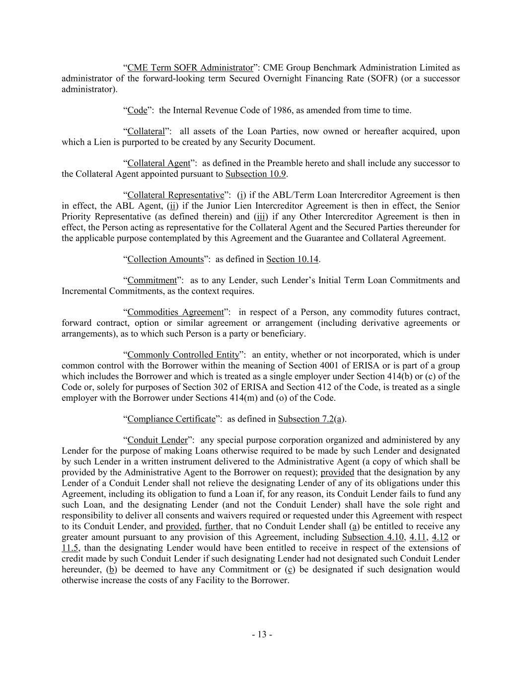 “CME Term SOFR Administrator”: CME Group Benchmark Administration Limited as administrator of the forward-looking term Secured Overnight Financing Rate (SOFR) (or a successor administrator). “Code”: the Internal Revenue Code of 1986, as amended from time to time. “Collateral”: all assets of the Loan Parties, now owned or hereafter acquired, upon which a Lien is purported to be created by any Security Document. “Collateral Agent”: as defined in the Preamble hereto and shall include any successor to the Collateral Agent appointed pursuant to Subsection 10.9. “Collateral Representative”: (i) if the ABL/Term Loan Intercreditor Agreement is then in effect, the ABL Agent, (ii) if the Junior Lien Intercreditor Agreement is then in effect, the Senior Priority Representative (as defined therein) and (iii) if any Other Intercreditor Agreement is then in effect, the Person acting as representative for the Collateral Agent and the Secured Parties thereunder for the applicable purpose contemplated by this Agreement and the Guarantee and Collateral Agreement. “Collection Amounts”: as defined in Section 10.14. “Commitment”: as to any Lender, such Lender’s Initial Term Loan Commitments and Incremental Commitments, as the context requires. “Commodities Agreement”: in respect of a Person, any commodity futures contract, forward contract, option or similar agreement or arrangement (including derivative agreements or arrangements), as to which such Person is a party or beneficiary. “Commonly Controlled Entity”: an entity, whether or not incorporated, which is under common control with the Borrower within the meaning of Section 4001 of ERISA or is part of a group which includes the Borrower and which is treated as a single employer under Section 414(b) or (c) of the Code or, solely for purposes of Section 302 of ERISA and Section 412 of the Code, is treated as a single employer with the Borrower under Sections 414(m) and (o) of the Code. “Compliance Certificate”: as defined in Subsection 7.2(a). “Conduit Lender”: any special purpose corporation organized and administered by any Lender for the purpose of making Loans otherwise required to be made by such Lender and designated by such Lender in a written instrument delivered to the Administrative Agent (a copy of which shall be provided by the Administrative Agent to the Borrower on request); provided that the designation by any Lender of a Conduit Lender shall not relieve the designating Lender of any of its obligations under this Agreement, including its obligation to fund a Loan if, for any reason, its Conduit Lender fails to fund any such Loan, and the designating Lender (and not the Conduit Lender) shall have the sole right and responsibility to deliver all consents and waivers required or requested under this Agreement with respect to its Conduit Lender, and provided, further, that no Conduit Lender shall (a) be entitled to receive any greater amount pursuant to any provision of this Agreement, including Subsection 4.10, 4.11, 4.12 or 11.5, than the designating Lender would have been entitled to receive in respect of the extensions of credit made by such Conduit Lender if such designating Lender had not designated such Conduit Lender hereunder, (b) be deemed to have any Commitment or (c) be designated if such designation would otherwise increase the costs of any Facility to the Borrower. - 13 -