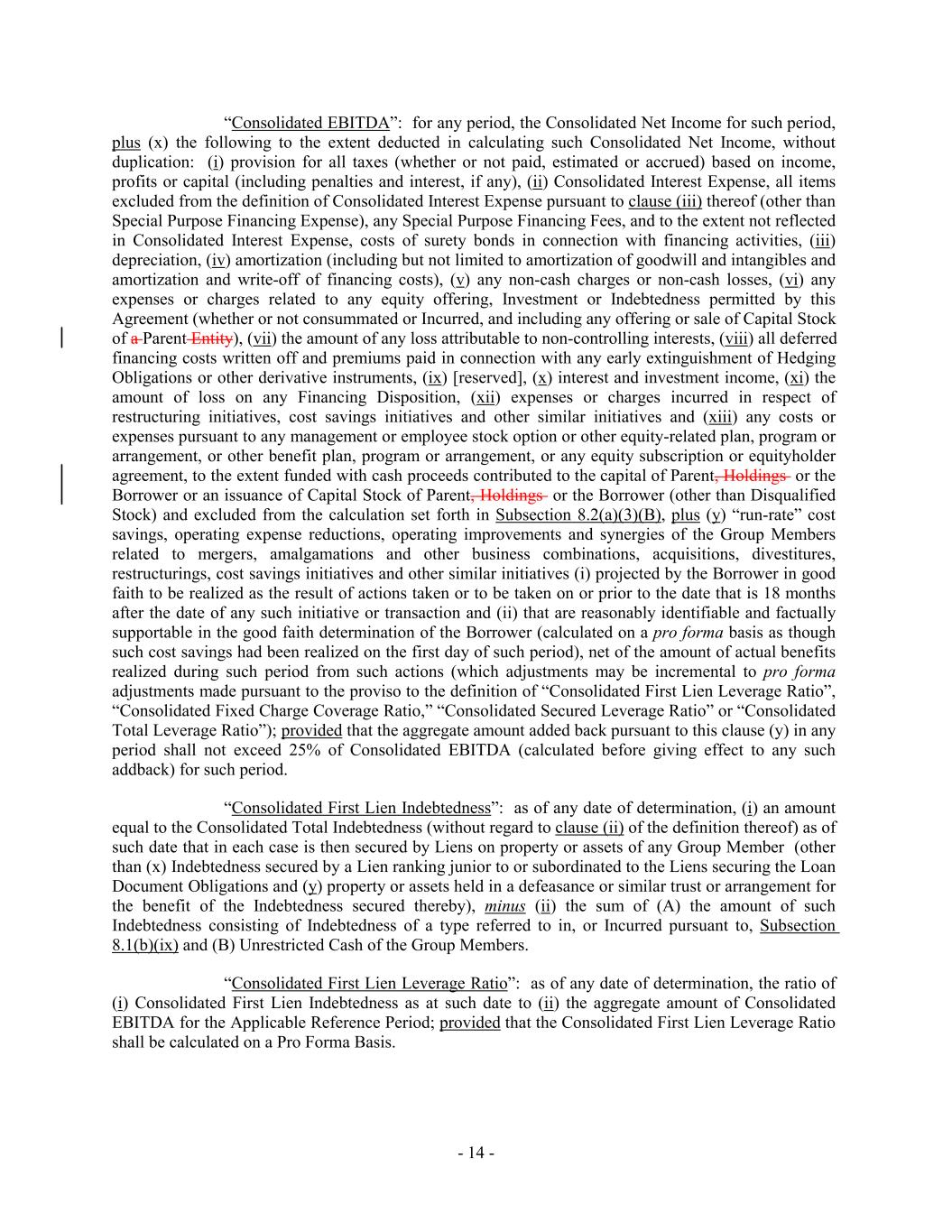“Consolidated EBITDA”: for any period, the Consolidated Net Income for such period, plus (x) the following to the extent deducted in calculating such Consolidated Net Income, without duplication: (i) provision for all taxes (whether or not paid, estimated or accrued) based on income, profits or capital (including penalties and interest, if any), (ii) Consolidated Interest Expense, all items excluded from the definition of Consolidated Interest Expense pursuant to clause (iii) thereof (other than Special Purpose Financing Expense), any Special Purpose Financing Fees, and to the extent not reflected in Consolidated Interest Expense, costs of surety bonds in connection with financing activities, (iii) depreciation, (iv) amortization (including but not limited to amortization of goodwill and intangibles and amortization and write-off of financing costs), (v) any non-cash charges or non-cash losses, (vi) any expenses or charges related to any equity offering, Investment or Indebtedness permitted by this Agreement (whether or not consummated or Incurred, and including any offering or sale of Capital Stock of a Parent Entity), (vii) the amount of any loss attributable to non-controlling interests, (viii) all deferred financing costs written off and premiums paid in connection with any early extinguishment of Hedging Obligations or other derivative instruments, (ix) [reserved], (x) interest and investment income, (xi) the amount of loss on any Financing Disposition, (xii) expenses or charges incurred in respect of restructuring initiatives, cost savings initiatives and other similar initiatives and (xiii) any costs or expenses pursuant to any management or employee stock option or other equity-related plan, program or arrangement, or other benefit plan, program or arrangement, or any equity subscription or equityholder agreement, to the extent funded with cash proceeds contributed to the capital of Parent, Holdings or the Borrower or an issuance of Capital Stock of Parent, Holdings or the Borrower (other than Disqualified Stock) and excluded from the calculation set forth in Subsection 8.2(a)(3)(B), plus (y) “run-rate” cost savings, operating expense reductions, operating improvements and synergies of the Group Members related to mergers, amalgamations and other business combinations, acquisitions, divestitures, restructurings, cost savings initiatives and other similar initiatives (i) projected by the Borrower in good faith to be realized as the result of actions taken or to be taken on or prior to the date that is 18 months after the date of any such initiative or transaction and (ii) that are reasonably identifiable and factually supportable in the good faith determination of the Borrower (calculated on a pro forma basis as though such cost savings had been realized on the first day of such period), net of the amount of actual benefits realized during such period from such actions (which adjustments may be incremental to pro forma adjustments made pursuant to the proviso to the definition of “Consolidated First Lien Leverage Ratio”, “Consolidated Fixed Charge Coverage Ratio,” “Consolidated Secured Leverage Ratio” or “Consolidated Total Leverage Ratio”); provided that the aggregate amount added back pursuant to this clause (y) in any period shall not exceed 25% of Consolidated EBITDA (calculated before giving effect to any such addback) for such period. “Consolidated First Lien Indebtedness”: as of any date of determination, (i) an amount equal to the Consolidated Total Indebtedness (without regard to clause (ii) of the definition thereof) as of such date that in each case is then secured by Liens on property or assets of any Group Member (other than (x) Indebtedness secured by a Lien ranking junior to or subordinated to the Liens securing the Loan Document Obligations and (y) property or assets held in a defeasance or similar trust or arrangement for the benefit of the Indebtedness secured thereby), minus (ii) the sum of (A) the amount of such Indebtedness consisting of Indebtedness of a type referred to in, or Incurred pursuant to, Subsection 8.1(b)(ix) and (B) Unrestricted Cash of the Group Members. “Consolidated First Lien Leverage Ratio”: as of any date of determination, the ratio of (i) Consolidated First Lien Indebtedness as at such date to (ii) the aggregate amount of Consolidated EBITDA for the Applicable Reference Period; provided that the Consolidated First Lien Leverage Ratio shall be calculated on a Pro Forma Basis. - 14 -