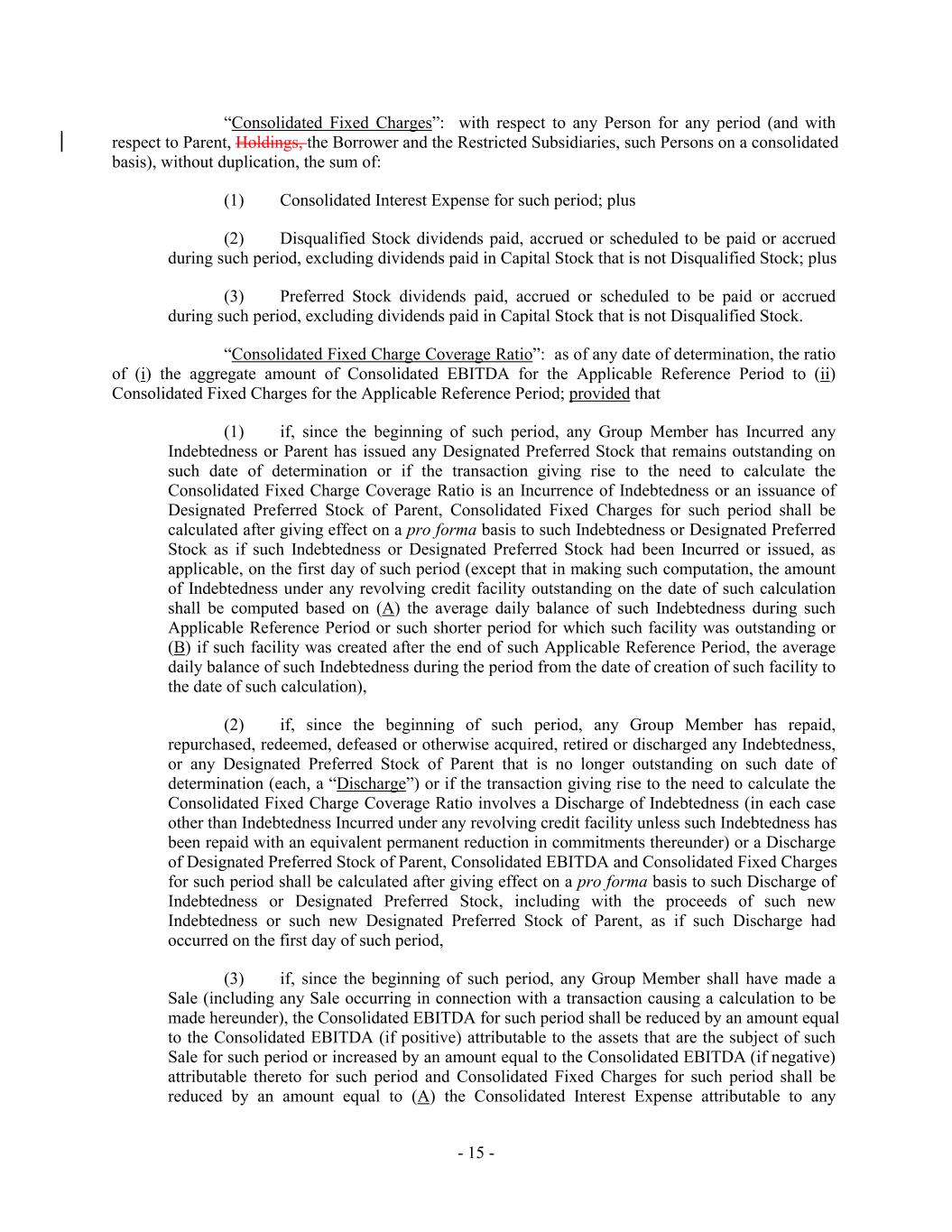 “Consolidated Fixed Charges”: with respect to any Person for any period (and with respect to Parent, Holdings, the Borrower and the Restricted Subsidiaries, such Persons on a consolidated basis), without duplication, the sum of: (1) Consolidated Interest Expense for such period; plus (2) Disqualified Stock dividends paid, accrued or scheduled to be paid or accrued during such period, excluding dividends paid in Capital Stock that is not Disqualified Stock; plus (3) Preferred Stock dividends paid, accrued or scheduled to be paid or accrued during such period, excluding dividends paid in Capital Stock that is not Disqualified Stock. “Consolidated Fixed Charge Coverage Ratio”: as of any date of determination, the ratio of (i) the aggregate amount of Consolidated EBITDA for the Applicable Reference Period to (ii) Consolidated Fixed Charges for the Applicable Reference Period; provided that (1) if, since the beginning of such period, any Group Member has Incurred any Indebtedness or Parent has issued any Designated Preferred Stock that remains outstanding on such date of determination or if the transaction giving rise to the need to calculate the Consolidated Fixed Charge Coverage Ratio is an Incurrence of Indebtedness or an issuance of Designated Preferred Stock of Parent, Consolidated Fixed Charges for such period shall be calculated after giving effect on a pro forma basis to such Indebtedness or Designated Preferred Stock as if such Indebtedness or Designated Preferred Stock had been Incurred or issued, as applicable, on the first day of such period (except that in making such computation, the amount of Indebtedness under any revolving credit facility outstanding on the date of such calculation shall be computed based on (A) the average daily balance of such Indebtedness during such Applicable Reference Period or such shorter period for which such facility was outstanding or (B) if such facility was created after the end of such Applicable Reference Period, the average daily balance of such Indebtedness during the period from the date of creation of such facility to the date of such calculation), (2) if, since the beginning of such period, any Group Member has repaid, repurchased, redeemed, defeased or otherwise acquired, retired or discharged any Indebtedness, or any Designated Preferred Stock of Parent that is no longer outstanding on such date of determination (each, a “Discharge”) or if the transaction giving rise to the need to calculate the Consolidated Fixed Charge Coverage Ratio involves a Discharge of Indebtedness (in each case other than Indebtedness Incurred under any revolving credit facility unless such Indebtedness has been repaid with an equivalent permanent reduction in commitments thereunder) or a Discharge of Designated Preferred Stock of Parent, Consolidated EBITDA and Consolidated Fixed Charges for such period shall be calculated after giving effect on a pro forma basis to such Discharge of Indebtedness or Designated Preferred Stock, including with the proceeds of such new Indebtedness or such new Designated Preferred Stock of Parent, as if such Discharge had occurred on the first day of such period, (3) if, since the beginning of such period, any Group Member shall have made a Sale (including any Sale occurring in connection with a transaction causing a calculation to be made hereunder), the Consolidated EBITDA for such period shall be reduced by an amount equal to the Consolidated EBITDA (if positive) attributable to the assets that are the subject of such Sale for such period or increased by an amount equal to the Consolidated EBITDA (if negative) attributable thereto for such period and Consolidated Fixed Charges for such period shall be reduced by an amount equal to (A) the Consolidated Interest Expense attributable to any - 15 -