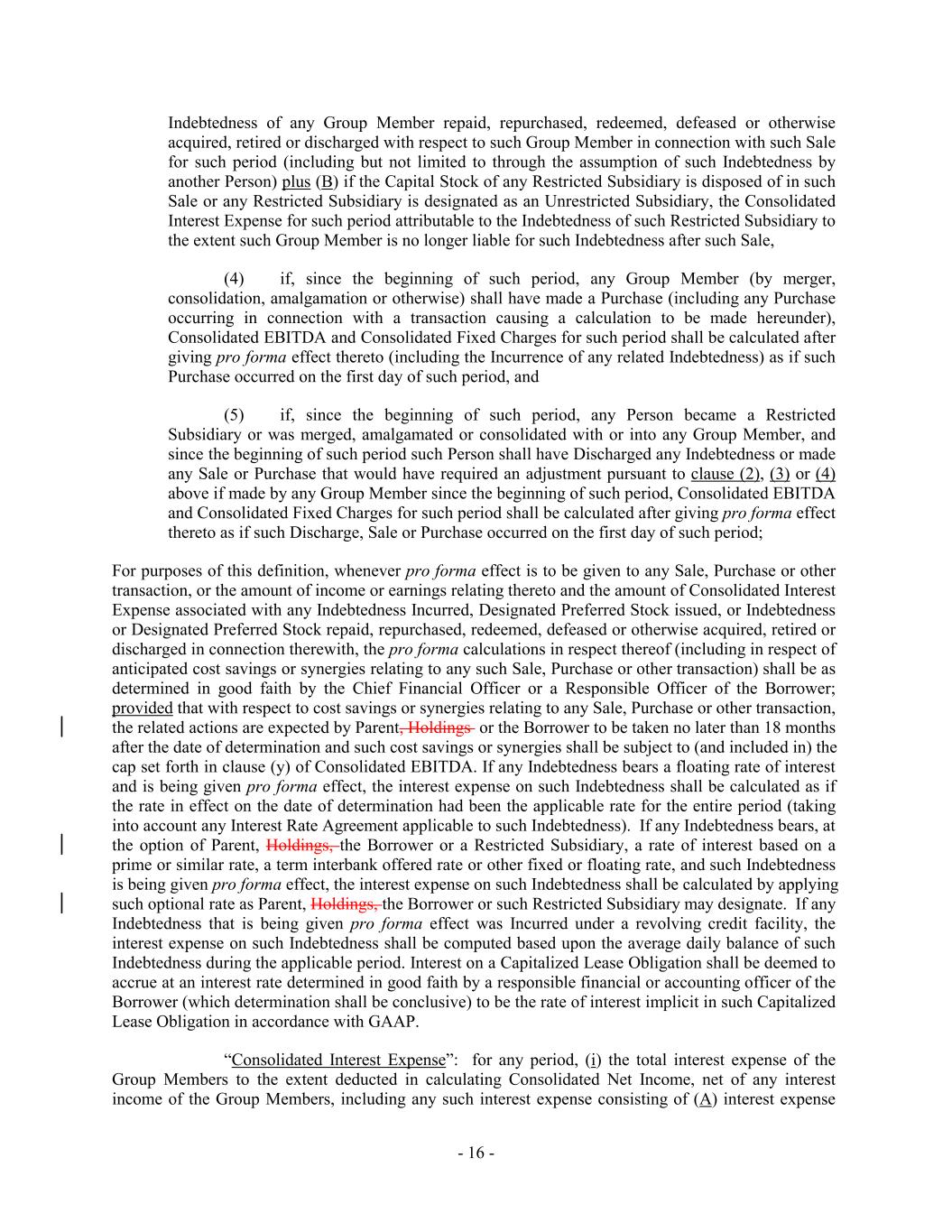 Indebtedness of any Group Member repaid, repurchased, redeemed, defeased or otherwise acquired, retired or discharged with respect to such Group Member in connection with such Sale for such period (including but not limited to through the assumption of such Indebtedness by another Person) plus (B) if the Capital Stock of any Restricted Subsidiary is disposed of in such Sale or any Restricted Subsidiary is designated as an Unrestricted Subsidiary, the Consolidated Interest Expense for such period attributable to the Indebtedness of such Restricted Subsidiary to the extent such Group Member is no longer liable for such Indebtedness after such Sale, (4) if, since the beginning of such period, any Group Member (by merger, consolidation, amalgamation or otherwise) shall have made a Purchase (including any Purchase occurring in connection with a transaction causing a calculation to be made hereunder), Consolidated EBITDA and Consolidated Fixed Charges for such period shall be calculated after giving pro forma effect thereto (including the Incurrence of any related Indebtedness) as if such Purchase occurred on the first day of such period, and (5) if, since the beginning of such period, any Person became a Restricted Subsidiary or was merged, amalgamated or consolidated with or into any Group Member, and since the beginning of such period such Person shall have Discharged any Indebtedness or made any Sale or Purchase that would have required an adjustment pursuant to clause (2), (3) or (4) above if made by any Group Member since the beginning of such period, Consolidated EBITDA and Consolidated Fixed Charges for such period shall be calculated after giving pro forma effect thereto as if such Discharge, Sale or Purchase occurred on the first day of such period; For purposes of this definition, whenever pro forma effect is to be given to any Sale, Purchase or other transaction, or the amount of income or earnings relating thereto and the amount of Consolidated Interest Expense associated with any Indebtedness Incurred, Designated Preferred Stock issued, or Indebtedness or Designated Preferred Stock repaid, repurchased, redeemed, defeased or otherwise acquired, retired or discharged in connection therewith, the pro forma calculations in respect thereof (including in respect of anticipated cost savings or synergies relating to any such Sale, Purchase or other transaction) shall be as determined in good faith by the Chief Financial Officer or a Responsible Officer of the Borrower; provided that with respect to cost savings or synergies relating to any Sale, Purchase or other transaction, the related actions are expected by Parent, Holdings or the Borrower to be taken no later than 18 months after the date of determination and such cost savings or synergies shall be subject to (and included in) the cap set forth in clause (y) of Consolidated EBITDA. If any Indebtedness bears a floating rate of interest and is being given pro forma effect, the interest expense on such Indebtedness shall be calculated as if the rate in effect on the date of determination had been the applicable rate for the entire period (taking into account any Interest Rate Agreement applicable to such Indebtedness). If any Indebtedness bears, at the option of Parent, Holdings, the Borrower or a Restricted Subsidiary, a rate of interest based on a prime or similar rate, a term interbank offered rate or other fixed or floating rate, and such Indebtedness is being given pro forma effect, the interest expense on such Indebtedness shall be calculated by applying such optional rate as Parent, Holdings, the Borrower or such Restricted Subsidiary may designate. If any Indebtedness that is being given pro forma effect was Incurred under a revolving credit facility, the interest expense on such Indebtedness shall be computed based upon the average daily balance of such Indebtedness during the applicable period. Interest on a Capitalized Lease Obligation shall be deemed to accrue at an interest rate determined in good faith by a responsible financial or accounting officer of the Borrower (which determination shall be conclusive) to be the rate of interest implicit in such Capitalized Lease Obligation in accordance with GAAP. “Consolidated Interest Expense”: for any period, (i) the total interest expense of the Group Members to the extent deducted in calculating Consolidated Net Income, net of any interest income of the Group Members, including any such interest expense consisting of (A) interest expense - 16 -