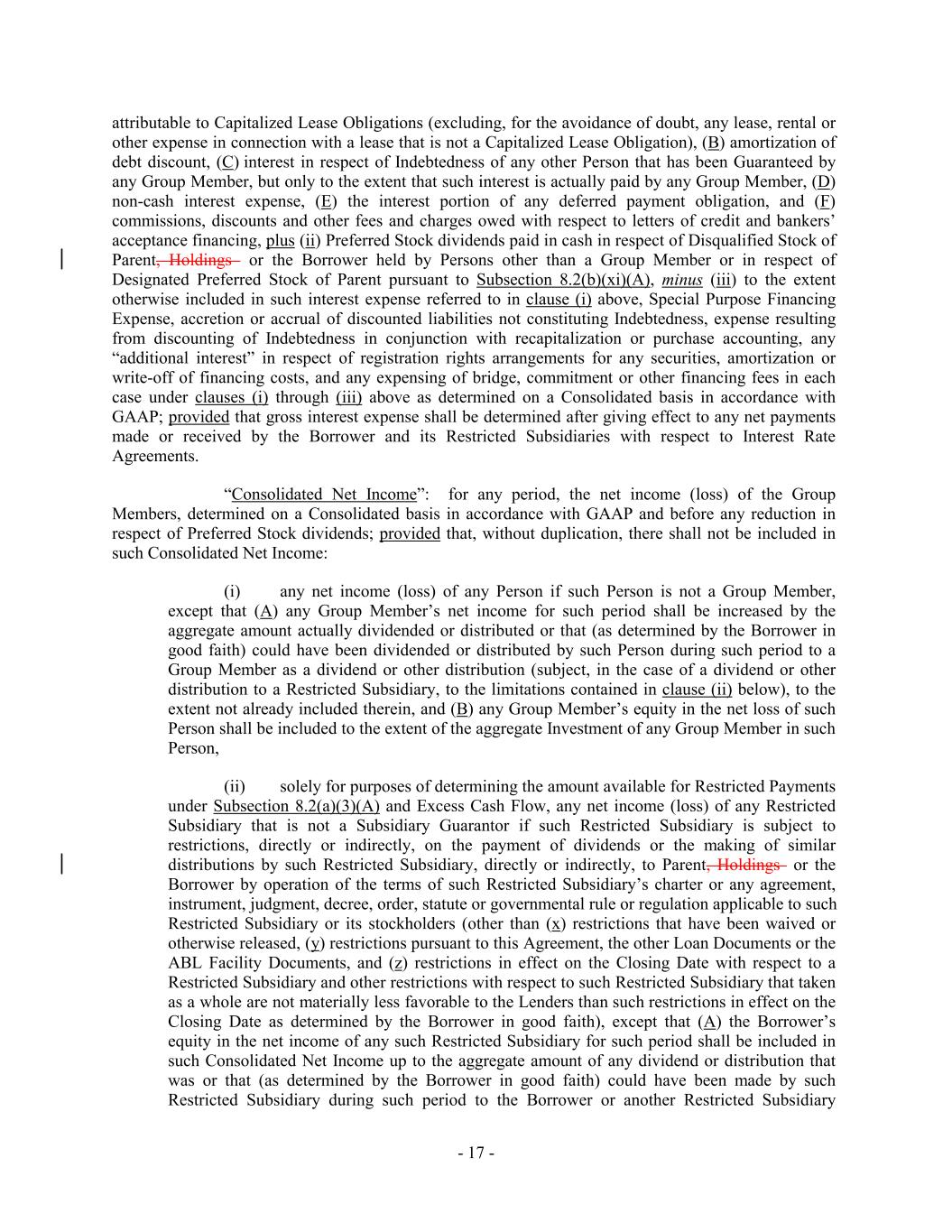 attributable to Capitalized Lease Obligations (excluding, for the avoidance of doubt, any lease, rental or other expense in connection with a lease that is not a Capitalized Lease Obligation), (B) amortization of debt discount, (C) interest in respect of Indebtedness of any other Person that has been Guaranteed by any Group Member, but only to the extent that such interest is actually paid by any Group Member, (D) non-cash interest expense, (E) the interest portion of any deferred payment obligation, and (F) commissions, discounts and other fees and charges owed with respect to letters of credit and bankers’ acceptance financing, plus (ii) Preferred Stock dividends paid in cash in respect of Disqualified Stock of Parent, Holdings or the Borrower held by Persons other than a Group Member or in respect of Designated Preferred Stock of Parent pursuant to Subsection 8.2(b)(xi)(A), minus (iii) to the extent otherwise included in such interest expense referred to in clause (i) above, Special Purpose Financing Expense, accretion or accrual of discounted liabilities not constituting Indebtedness, expense resulting from discounting of Indebtedness in conjunction with recapitalization or purchase accounting, any “additional interest” in respect of registration rights arrangements for any securities, amortization or write-off of financing costs, and any expensing of bridge, commitment or other financing fees in each case under clauses (i) through (iii) above as determined on a Consolidated basis in accordance with GAAP; provided that gross interest expense shall be determined after giving effect to any net payments made or received by the Borrower and its Restricted Subsidiaries with respect to Interest Rate Agreements. “Consolidated Net Income”: for any period, the net income (loss) of the Group Members, determined on a Consolidated basis in accordance with GAAP and before any reduction in respect of Preferred Stock dividends; provided that, without duplication, there shall not be included in such Consolidated Net Income: (i) any net income (loss) of any Person if such Person is not a Group Member, except that (A) any Group Member’s net income for such period shall be increased by the aggregate amount actually dividended or distributed or that (as determined by the Borrower in good faith) could have been dividended or distributed by such Person during such period to a Group Member as a dividend or other distribution (subject, in the case of a dividend or other distribution to a Restricted Subsidiary, to the limitations contained in clause (ii) below), to the extent not already included therein, and (B) any Group Member’s equity in the net loss of such Person shall be included to the extent of the aggregate Investment of any Group Member in such Person, (ii) solely for purposes of determining the amount available for Restricted Payments under Subsection 8.2(a)(3)(A) and Excess Cash Flow, any net income (loss) of any Restricted Subsidiary that is not a Subsidiary Guarantor if such Restricted Subsidiary is subject to restrictions, directly or indirectly, on the payment of dividends or the making of similar distributions by such Restricted Subsidiary, directly or indirectly, to Parent, Holdings or the Borrower by operation of the terms of such Restricted Subsidiary’s charter or any agreement, instrument, judgment, decree, order, statute or governmental rule or regulation applicable to such Restricted Subsidiary or its stockholders (other than (x) restrictions that have been waived or otherwise released, (y) restrictions pursuant to this Agreement, the other Loan Documents or the ABL Facility Documents, and (z) restrictions in effect on the Closing Date with respect to a Restricted Subsidiary and other restrictions with respect to such Restricted Subsidiary that taken as a whole are not materially less favorable to the Lenders than such restrictions in effect on the Closing Date as determined by the Borrower in good faith), except that (A) the Borrower’s equity in the net income of any such Restricted Subsidiary for such period shall be included in such Consolidated Net Income up to the aggregate amount of any dividend or distribution that was or that (as determined by the Borrower in good faith) could have been made by such Restricted Subsidiary during such period to the Borrower or another Restricted Subsidiary - 17 -
