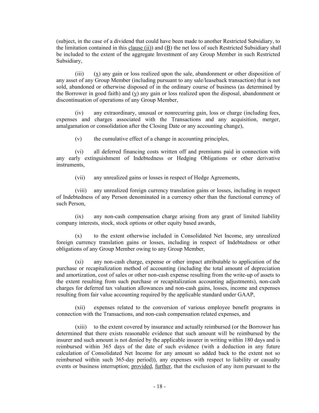 (subject, in the case of a dividend that could have been made to another Restricted Subsidiary, to the limitation contained in this clause (ii)) and (B) the net loss of such Restricted Subsidiary shall be included to the extent of the aggregate Investment of any Group Member in such Restricted Subsidiary, (iii) (x) any gain or loss realized upon the sale, abandonment or other disposition of any asset of any Group Member (including pursuant to any sale/leaseback transaction) that is not sold, abandoned or otherwise disposed of in the ordinary course of business (as determined by the Borrower in good faith) and (y) any gain or loss realized upon the disposal, abandonment or discontinuation of operations of any Group Member, (iv) any extraordinary, unusual or nonrecurring gain, loss or charge (including fees, expenses and charges associated with the Transactions and any acquisition, merger, amalgamation or consolidation after the Closing Date or any accounting change), (v) the cumulative effect of a change in accounting principles, (vi) all deferred financing costs written off and premiums paid in connection with any early extinguishment of Indebtedness or Hedging Obligations or other derivative instruments, (vii) any unrealized gains or losses in respect of Hedge Agreements, (viii) any unrealized foreign currency translation gains or losses, including in respect of Indebtedness of any Person denominated in a currency other than the functional currency of such Person, (ix) any non-cash compensation charge arising from any grant of limited liability company interests, stock, stock options or other equity based awards, (x) to the extent otherwise included in Consolidated Net Income, any unrealized foreign currency translation gains or losses, including in respect of Indebtedness or other obligations of any Group Member owing to any Group Member, (xi) any non-cash charge, expense or other impact attributable to application of the purchase or recapitalization method of accounting (including the total amount of depreciation and amortization, cost of sales or other non-cash expense resulting from the write-up of assets to the extent resulting from such purchase or recapitalization accounting adjustments), non-cash charges for deferred tax valuation allowances and non-cash gains, losses, income and expenses resulting from fair value accounting required by the applicable standard under GAAP, (xii) expenses related to the conversion of various employee benefit programs in connection with the Transactions, and non-cash compensation related expenses, and (xiii) to the extent covered by insurance and actually reimbursed (or the Borrower has determined that there exists reasonable evidence that such amount will be reimbursed by the insurer and such amount is not denied by the applicable insurer in writing within 180 days and is reimbursed within 365 days of the date of such evidence (with a deduction in any future calculation of Consolidated Net Income for any amount so added back to the extent not so reimbursed within such 365-day period)), any expenses with respect to liability or casualty events or business interruption; provided, further, that the exclusion of any item pursuant to the - 18 -