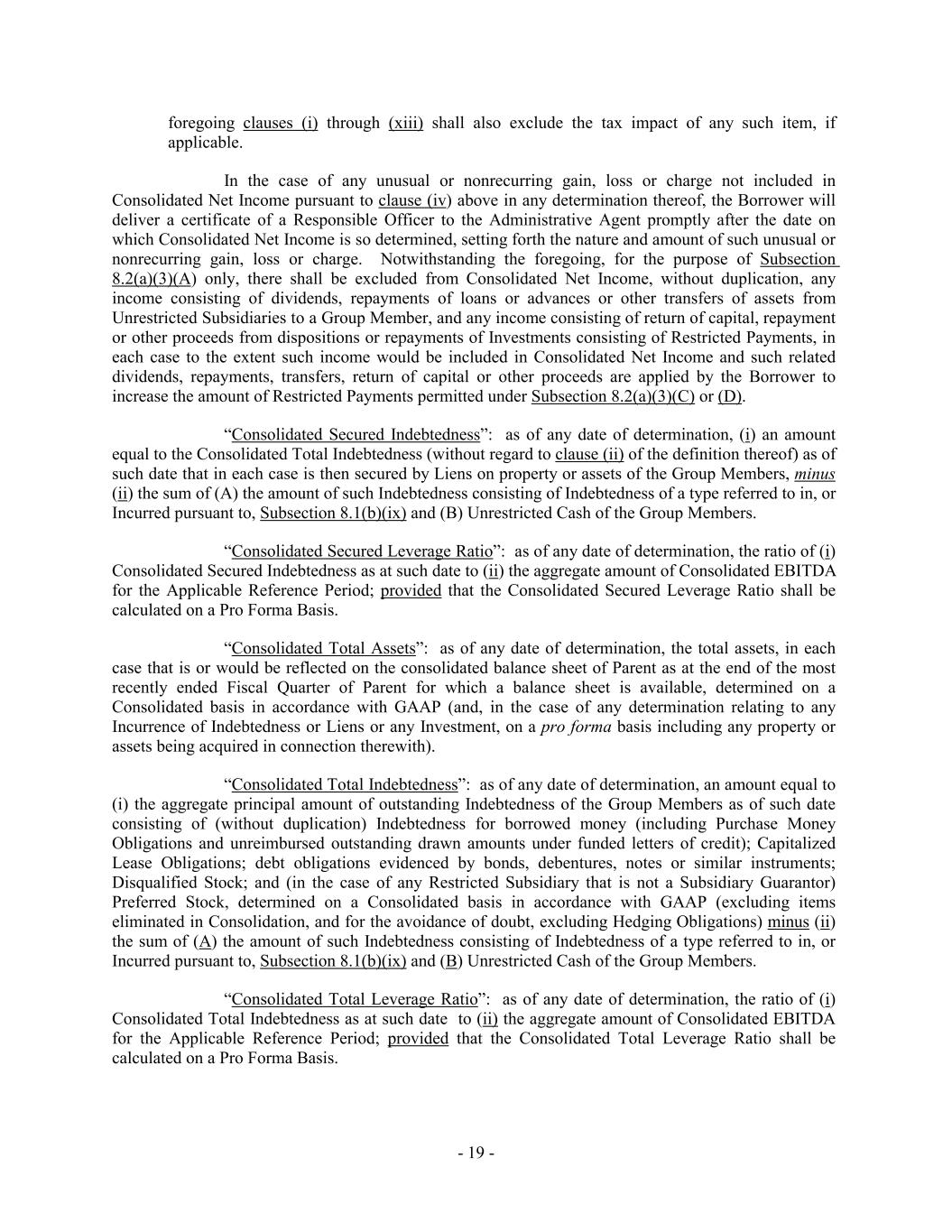 foregoing clauses (i) through (xiii) shall also exclude the tax impact of any such item, if applicable. In the case of any unusual or nonrecurring gain, loss or charge not included in Consolidated Net Income pursuant to clause (iv) above in any determination thereof, the Borrower will deliver a certificate of a Responsible Officer to the Administrative Agent promptly after the date on which Consolidated Net Income is so determined, setting forth the nature and amount of such unusual or nonrecurring gain, loss or charge. Notwithstanding the foregoing, for the purpose of Subsection 8.2(a)(3)(A) only, there shall be excluded from Consolidated Net Income, without duplication, any income consisting of dividends, repayments of loans or advances or other transfers of assets from Unrestricted Subsidiaries to a Group Member, and any income consisting of return of capital, repayment or other proceeds from dispositions or repayments of Investments consisting of Restricted Payments, in each case to the extent such income would be included in Consolidated Net Income and such related dividends, repayments, transfers, return of capital or other proceeds are applied by the Borrower to increase the amount of Restricted Payments permitted under Subsection 8.2(a)(3)(C) or (D). “Consolidated Secured Indebtedness”: as of any date of determination, (i) an amount equal to the Consolidated Total Indebtedness (without regard to clause (ii) of the definition thereof) as of such date that in each case is then secured by Liens on property or assets of the Group Members, minus (ii) the sum of (A) the amount of such Indebtedness consisting of Indebtedness of a type referred to in, or Incurred pursuant to, Subsection 8.1(b)(ix) and (B) Unrestricted Cash of the Group Members. “Consolidated Secured Leverage Ratio”: as of any date of determination, the ratio of (i) Consolidated Secured Indebtedness as at such date to (ii) the aggregate amount of Consolidated EBITDA for the Applicable Reference Period; provided that the Consolidated Secured Leverage Ratio shall be calculated on a Pro Forma Basis. “Consolidated Total Assets”: as of any date of determination, the total assets, in each case that is or would be reflected on the consolidated balance sheet of Parent as at the end of the most recently ended Fiscal Quarter of Parent for which a balance sheet is available, determined on a Consolidated basis in accordance with GAAP (and, in the case of any determination relating to any Incurrence of Indebtedness or Liens or any Investment, on a pro forma basis including any property or assets being acquired in connection therewith). “Consolidated Total Indebtedness”: as of any date of determination, an amount equal to (i) the aggregate principal amount of outstanding Indebtedness of the Group Members as of such date consisting of (without duplication) Indebtedness for borrowed money (including Purchase Money Obligations and unreimbursed outstanding drawn amounts under funded letters of credit); Capitalized Lease Obligations; debt obligations evidenced by bonds, debentures, notes or similar instruments; Disqualified Stock; and (in the case of any Restricted Subsidiary that is not a Subsidiary Guarantor) Preferred Stock, determined on a Consolidated basis in accordance with GAAP (excluding items eliminated in Consolidation, and for the avoidance of doubt, excluding Hedging Obligations) minus (ii) the sum of (A) the amount of such Indebtedness consisting of Indebtedness of a type referred to in, or Incurred pursuant to, Subsection 8.1(b)(ix) and (B) Unrestricted Cash of the Group Members. “Consolidated Total Leverage Ratio”: as of any date of determination, the ratio of (i) Consolidated Total Indebtedness as at such date to (ii) the aggregate amount of Consolidated EBITDA for the Applicable Reference Period; provided that the Consolidated Total Leverage Ratio shall be calculated on a Pro Forma Basis. - 19 -