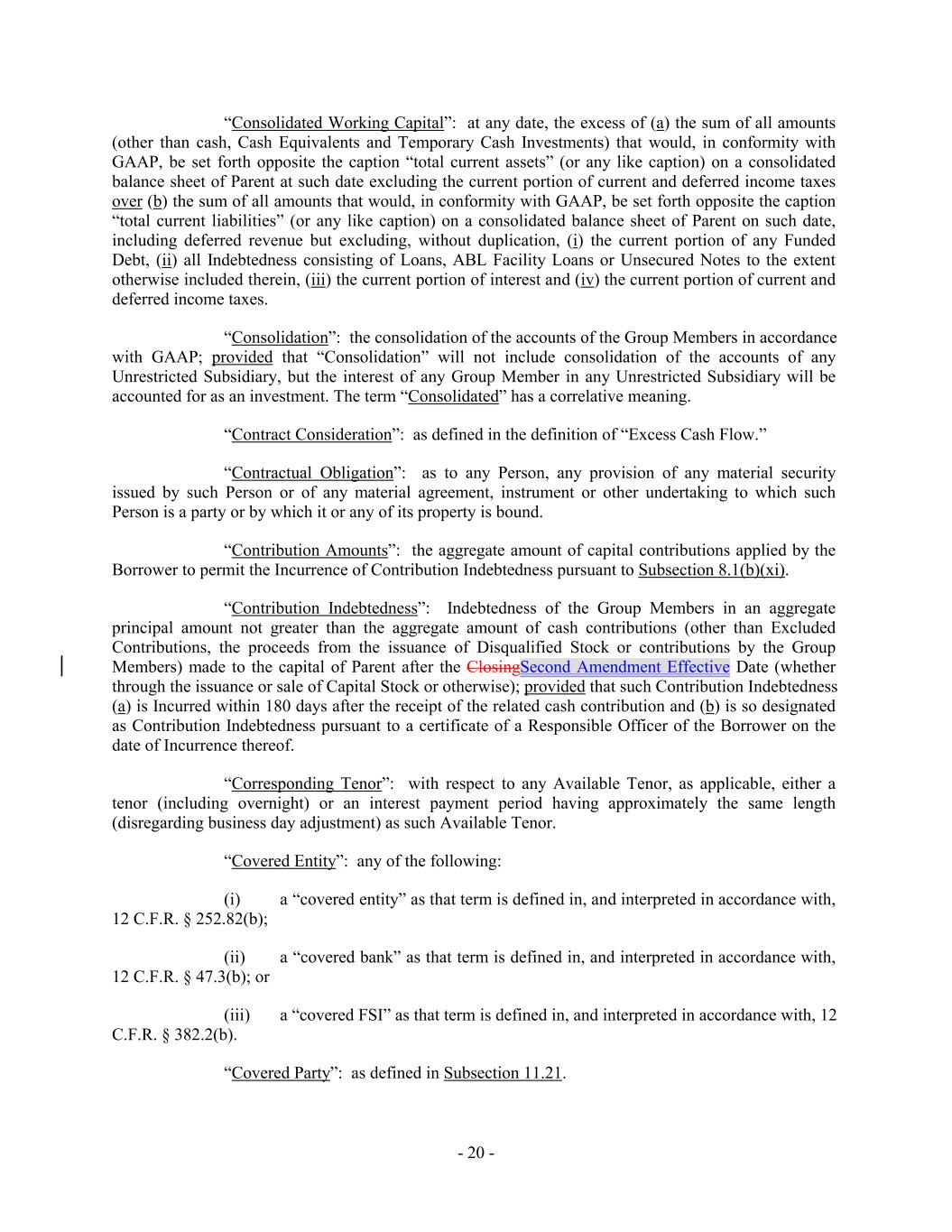 “Consolidated Working Capital”: at any date, the excess of (a) the sum of all amounts (other than cash, Cash Equivalents and Temporary Cash Investments) that would, in conformity with GAAP, be set forth opposite the caption “total current assets” (or any like caption) on a consolidated balance sheet of Parent at such date excluding the current portion of current and deferred income taxes over (b) the sum of all amounts that would, in conformity with GAAP, be set forth opposite the caption “total current liabilities” (or any like caption) on a consolidated balance sheet of Parent on such date, including deferred revenue but excluding, without duplication, (i) the current portion of any Funded Debt, (ii) all Indebtedness consisting of Loans, ABL Facility Loans or Unsecured Notes to the extent otherwise included therein, (iii) the current portion of interest and (iv) the current portion of current and deferred income taxes. “Consolidation”: the consolidation of the accounts of the Group Members in accordance with GAAP; provided that “Consolidation” will not include consolidation of the accounts of any Unrestricted Subsidiary, but the interest of any Group Member in any Unrestricted Subsidiary will be accounted for as an investment. The term “Consolidated” has a correlative meaning. “Contract Consideration”: as defined in the definition of “Excess Cash Flow.” “Contractual Obligation”: as to any Person, any provision of any material security issued by such Person or of any material agreement, instrument or other undertaking to which such Person is a party or by which it or any of its property is bound. “Contribution Amounts”: the aggregate amount of capital contributions applied by the Borrower to permit the Incurrence of Contribution Indebtedness pursuant to Subsection 8.1(b)(xi). “Contribution Indebtedness”: Indebtedness of the Group Members in an aggregate principal amount not greater than the aggregate amount of cash contributions (other than Excluded Contributions, the proceeds from the issuance of Disqualified Stock or contributions by the Group Members) made to the capital of Parent after the ClosingSecond Amendment Effective Date (whether through the issuance or sale of Capital Stock or otherwise); provided that such Contribution Indebtedness (a) is Incurred within 180 days after the receipt of the related cash contribution and (b) is so designated as Contribution Indebtedness pursuant to a certificate of a Responsible Officer of the Borrower on the date of Incurrence thereof. “Corresponding Tenor”: with respect to any Available Tenor, as applicable, either a tenor (including overnight) or an interest payment period having approximately the same length (disregarding business day adjustment) as such Available Tenor. “Covered Entity”: any of the following: (i) a “covered entity” as that term is defined in, and interpreted in accordance with, 12 C.F.R. § 252.82(b); (ii) a “covered bank” as that term is defined in, and interpreted in accordance with, 12 C.F.R. § 47.3(b); or (iii) a “covered FSI” as that term is defined in, and interpreted in accordance with, 12 C.F.R. § 382.2(b). “Covered Party”: as defined in Subsection 11.21. - 20 -