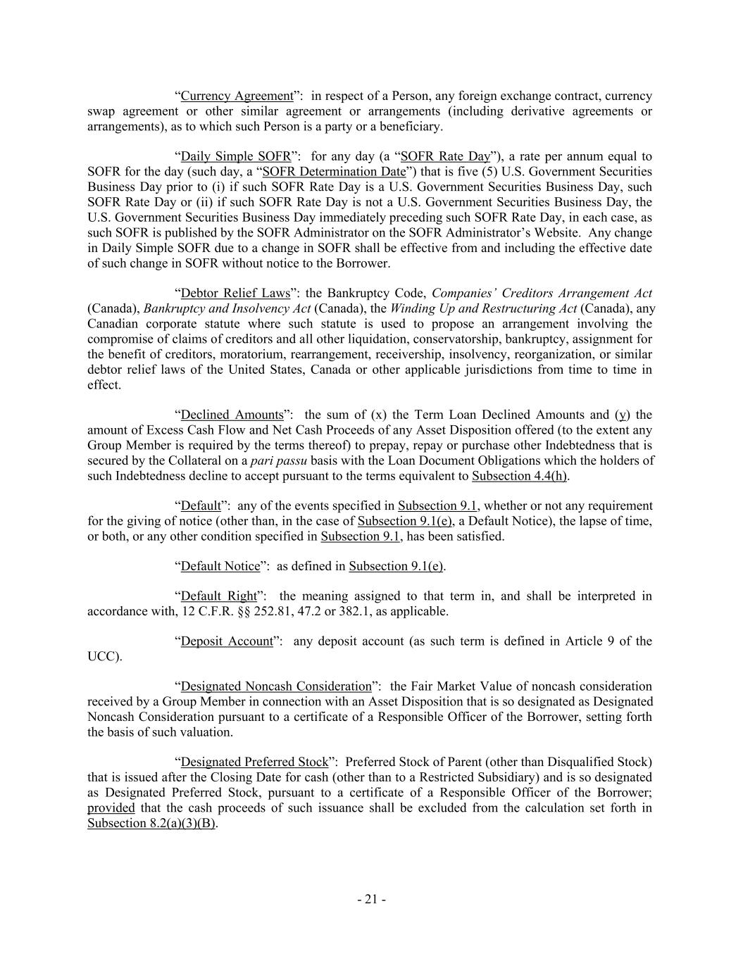 “Currency Agreement”: in respect of a Person, any foreign exchange contract, currency swap agreement or other similar agreement or arrangements (including derivative agreements or arrangements), as to which such Person is a party or a beneficiary. “Daily Simple SOFR”: for any day (a “SOFR Rate Day”), a rate per annum equal to SOFR for the day (such day, a “SOFR Determination Date”) that is five (5) U.S. Government Securities Business Day prior to (i) if such SOFR Rate Day is a U.S. Government Securities Business Day, such SOFR Rate Day or (ii) if such SOFR Rate Day is not a U.S. Government Securities Business Day, the U.S. Government Securities Business Day immediately preceding such SOFR Rate Day, in each case, as such SOFR is published by the SOFR Administrator on the SOFR Administrator’s Website. Any change in Daily Simple SOFR due to a change in SOFR shall be effective from and including the effective date of such change in SOFR without notice to the Borrower. “Debtor Relief Laws”: the Bankruptcy Code, Companies’ Creditors Arrangement Act (Canada), Bankruptcy and Insolvency Act (Canada), the Winding Up and Restructuring Act (Canada), any Canadian corporate statute where such statute is used to propose an arrangement involving the compromise of claims of creditors and all other liquidation, conservatorship, bankruptcy, assignment for the benefit of creditors, moratorium, rearrangement, receivership, insolvency, reorganization, or similar debtor relief laws of the United States, Canada or other applicable jurisdictions from time to time in effect. “Declined Amounts”: the sum of (x) the Term Loan Declined Amounts and (y) the amount of Excess Cash Flow and Net Cash Proceeds of any Asset Disposition offered (to the extent any Group Member is required by the terms thereof) to prepay, repay or purchase other Indebtedness that is secured by the Collateral on a pari passu basis with the Loan Document Obligations which the holders of such Indebtedness decline to accept pursuant to the terms equivalent to Subsection 4.4(h). “Default”: any of the events specified in Subsection 9.1, whether or not any requirement for the giving of notice (other than, in the case of Subsection 9.1(e), a Default Notice), the lapse of time, or both, or any other condition specified in Subsection 9.1, has been satisfied. “Default Notice”: as defined in Subsection 9.1(e). “Default Right”: the meaning assigned to that term in, and shall be interpreted in accordance with, 12 C.F.R. §§ 252.81, 47.2 or 382.1, as applicable. “Deposit Account”: any deposit account (as such term is defined in Article 9 of the UCC). “Designated Noncash Consideration”: the Fair Market Value of noncash consideration received by a Group Member in connection with an Asset Disposition that is so designated as Designated Noncash Consideration pursuant to a certificate of a Responsible Officer of the Borrower, setting forth the basis of such valuation. “Designated Preferred Stock”: Preferred Stock of Parent (other than Disqualified Stock) that is issued after the Closing Date for cash (other than to a Restricted Subsidiary) and is so designated as Designated Preferred Stock, pursuant to a certificate of a Responsible Officer of the Borrower; provided that the cash proceeds of such issuance shall be excluded from the calculation set forth in Subsection 8.2(a)(3)(B). - 21 -