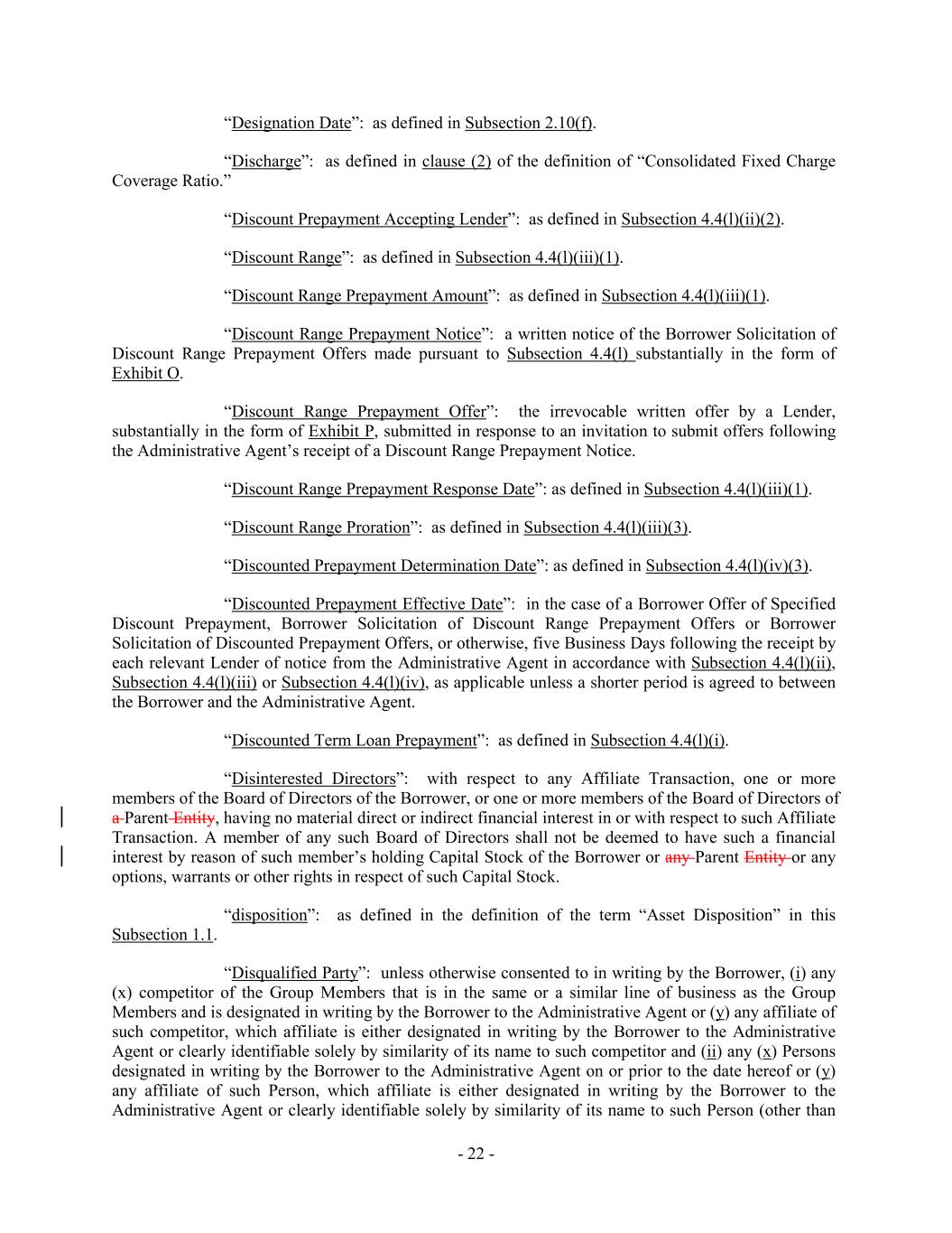 “Designation Date”: as defined in Subsection 2.10(f). “Discharge”: as defined in clause (2) of the definition of “Consolidated Fixed Charge Coverage Ratio.” “Discount Prepayment Accepting Lender”: as defined in Subsection 4.4(l)(ii)(2). “Discount Range”: as defined in Subsection 4.4(l)(iii)(1). “Discount Range Prepayment Amount”: as defined in Subsection 4.4(l)(iii)(1). “Discount Range Prepayment Notice”: a written notice of the Borrower Solicitation of Discount Range Prepayment Offers made pursuant to Subsection 4.4(l) substantially in the form of Exhibit O. “Discount Range Prepayment Offer”: the irrevocable written offer by a Lender, substantially in the form of Exhibit P, submitted in response to an invitation to submit offers following the Administrative Agent’s receipt of a Discount Range Prepayment Notice. “Discount Range Prepayment Response Date”: as defined in Subsection 4.4(l)(iii)(1). “Discount Range Proration”: as defined in Subsection 4.4(l)(iii)(3). “Discounted Prepayment Determination Date”: as defined in Subsection 4.4(l)(iv)(3). “Discounted Prepayment Effective Date”: in the case of a Borrower Offer of Specified Discount Prepayment, Borrower Solicitation of Discount Range Prepayment Offers or Borrower Solicitation of Discounted Prepayment Offers, or otherwise, five Business Days following the receipt by each relevant Lender of notice from the Administrative Agent in accordance with Subsection 4.4(l)(ii), Subsection 4.4(l)(iii) or Subsection 4.4(l)(iv), as applicable unless a shorter period is agreed to between the Borrower and the Administrative Agent. “Discounted Term Loan Prepayment”: as defined in Subsection 4.4(l)(i). “Disinterested Directors”: with respect to any Affiliate Transaction, one or more members of the Board of Directors of the Borrower, or one or more members of the Board of Directors of a Parent Entity, having no material direct or indirect financial interest in or with respect to such Affiliate Transaction. A member of any such Board of Directors shall not be deemed to have such a financial interest by reason of such member’s holding Capital Stock of the Borrower or any Parent Entity or any options, warrants or other rights in respect of such Capital Stock. “disposition”: as defined in the definition of the term “Asset Disposition” in this Subsection 1.1. “Disqualified Party”: unless otherwise consented to in writing by the Borrower, (i) any (x) competitor of the Group Members that is in the same or a similar line of business as the Group Members and is designated in writing by the Borrower to the Administrative Agent or (y) any affiliate of such competitor, which affiliate is either designated in writing by the Borrower to the Administrative Agent or clearly identifiable solely by similarity of its name to such competitor and (ii) any (x) Persons designated in writing by the Borrower to the Administrative Agent on or prior to the date hereof or (y) any affiliate of such Person, which affiliate is either designated in writing by the Borrower to the Administrative Agent or clearly identifiable solely by similarity of its name to such Person (other than - 22 -