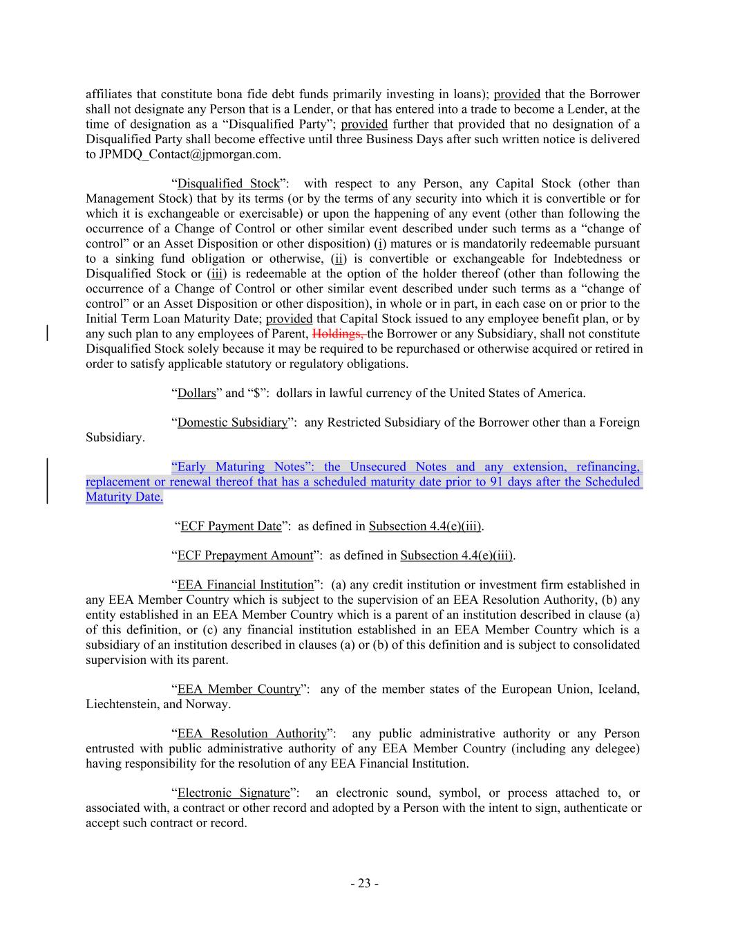 affiliates that constitute bona fide debt funds primarily investing in loans); provided that the Borrower shall not designate any Person that is a Lender, or that has entered into a trade to become a Lender, at the time of designation as a “Disqualified Party”; provided further that provided that no designation of a Disqualified Party shall become effective until three Business Days after such written notice is delivered to JPMDQ_Contact@jpmorgan.com. “Disqualified Stock”: with respect to any Person, any Capital Stock (other than Management Stock) that by its terms (or by the terms of any security into which it is convertible or for which it is exchangeable or exercisable) or upon the happening of any event (other than following the occurrence of a Change of Control or other similar event described under such terms as a “change of control” or an Asset Disposition or other disposition) (i) matures or is mandatorily redeemable pursuant to a sinking fund obligation or otherwise, (ii) is convertible or exchangeable for Indebtedness or Disqualified Stock or (iii) is redeemable at the option of the holder thereof (other than following the occurrence of a Change of Control or other similar event described under such terms as a “change of control” or an Asset Disposition or other disposition), in whole or in part, in each case on or prior to the Initial Term Loan Maturity Date; provided that Capital Stock issued to any employee benefit plan, or by any such plan to any employees of Parent, Holdings, the Borrower or any Subsidiary, shall not constitute Disqualified Stock solely because it may be required to be repurchased or otherwise acquired or retired in order to satisfy applicable statutory or regulatory obligations. “Dollars” and “$”: dollars in lawful currency of the United States of America. “Domestic Subsidiary”: any Restricted Subsidiary of the Borrower other than a Foreign Subsidiary. “Early Maturing Notes”: the Unsecured Notes and any extension, refinancing, replacement or renewal thereof that has a scheduled maturity date prior to 91 days after the Scheduled Maturity Date. “ECF Payment Date”: as defined in Subsection 4.4(e)(iii). “ECF Prepayment Amount”: as defined in Subsection 4.4(e)(iii). “EEA Financial Institution”: (a) any credit institution or investment firm established in any EEA Member Country which is subject to the supervision of an EEA Resolution Authority, (b) any entity established in an EEA Member Country which is a parent of an institution described in clause (a) of this definition, or (c) any financial institution established in an EEA Member Country which is a subsidiary of an institution described in clauses (a) or (b) of this definition and is subject to consolidated supervision with its parent. “EEA Member Country”: any of the member states of the European Union, Iceland, Liechtenstein, and Norway. “EEA Resolution Authority”: any public administrative authority or any Person entrusted with public administrative authority of any EEA Member Country (including any delegee) having responsibility for the resolution of any EEA Financial Institution. “Electronic Signature”: an electronic sound, symbol, or process attached to, or associated with, a contract or other record and adopted by a Person with the intent to sign, authenticate or accept such contract or record. - 23 -