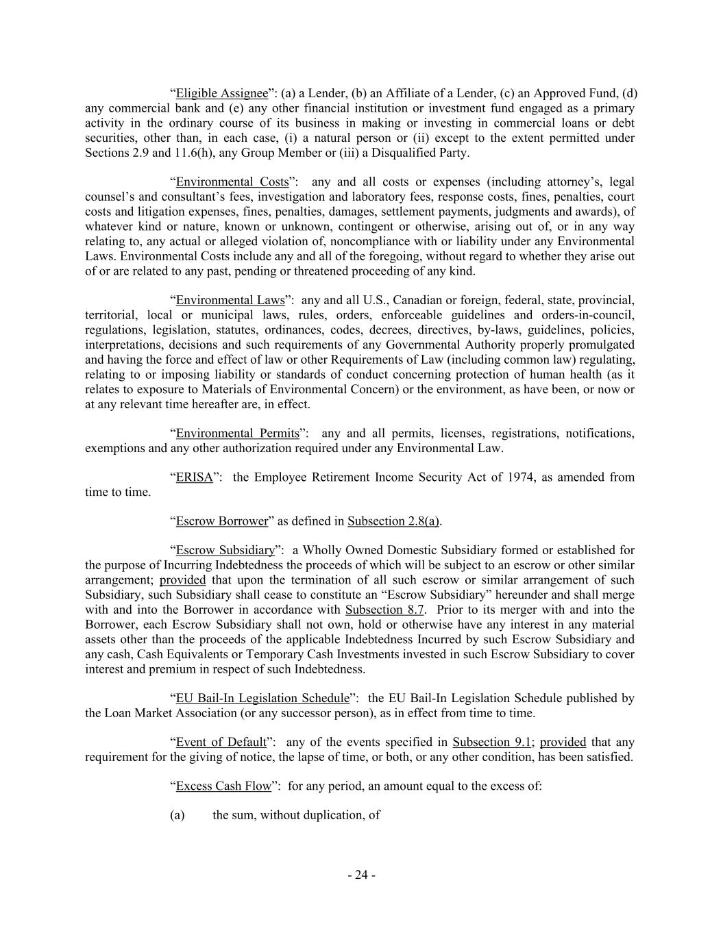 “Eligible Assignee”: (a) a Lender, (b) an Affiliate of a Lender, (c) an Approved Fund, (d) any commercial bank and (e) any other financial institution or investment fund engaged as a primary activity in the ordinary course of its business in making or investing in commercial loans or debt securities, other than, in each case, (i) a natural person or (ii) except to the extent permitted under Sections 2.9 and 11.6(h), any Group Member or (iii) a Disqualified Party. “Environmental Costs”: any and all costs or expenses (including attorney’s, legal counsel’s and consultant’s fees, investigation and laboratory fees, response costs, fines, penalties, court costs and litigation expenses, fines, penalties, damages, settlement payments, judgments and awards), of whatever kind or nature, known or unknown, contingent or otherwise, arising out of, or in any way relating to, any actual or alleged violation of, noncompliance with or liability under any Environmental Laws. Environmental Costs include any and all of the foregoing, without regard to whether they arise out of or are related to any past, pending or threatened proceeding of any kind. “Environmental Laws”: any and all U.S., Canadian or foreign, federal, state, provincial, territorial, local or municipal laws, rules, orders, enforceable guidelines and orders-in-council, regulations, legislation, statutes, ordinances, codes, decrees, directives, by-laws, guidelines, policies, interpretations, decisions and such requirements of any Governmental Authority properly promulgated and having the force and effect of law or other Requirements of Law (including common law) regulating, relating to or imposing liability or standards of conduct concerning protection of human health (as it relates to exposure to Materials of Environmental Concern) or the environment, as have been, or now or at any relevant time hereafter are, in effect. “Environmental Permits”: any and all permits, licenses, registrations, notifications, exemptions and any other authorization required under any Environmental Law. “ERISA”: the Employee Retirement Income Security Act of 1974, as amended from time to time. “Escrow Borrower” as defined in Subsection 2.8(a). “Escrow Subsidiary”: a Wholly Owned Domestic Subsidiary formed or established for the purpose of Incurring Indebtedness the proceeds of which will be subject to an escrow or other similar arrangement; provided that upon the termination of all such escrow or similar arrangement of such Subsidiary, such Subsidiary shall cease to constitute an “Escrow Subsidiary” hereunder and shall merge with and into the Borrower in accordance with Subsection 8.7. Prior to its merger with and into the Borrower, each Escrow Subsidiary shall not own, hold or otherwise have any interest in any material assets other than the proceeds of the applicable Indebtedness Incurred by such Escrow Subsidiary and any cash, Cash Equivalents or Temporary Cash Investments invested in such Escrow Subsidiary to cover interest and premium in respect of such Indebtedness. “EU Bail-In Legislation Schedule”: the EU Bail-In Legislation Schedule published by the Loan Market Association (or any successor person), as in effect from time to time. “Event of Default”: any of the events specified in Subsection 9.1; provided that any requirement for the giving of notice, the lapse of time, or both, or any other condition, has been satisfied. “Excess Cash Flow”: for any period, an amount equal to the excess of: (a) the sum, without duplication, of - 24 -
