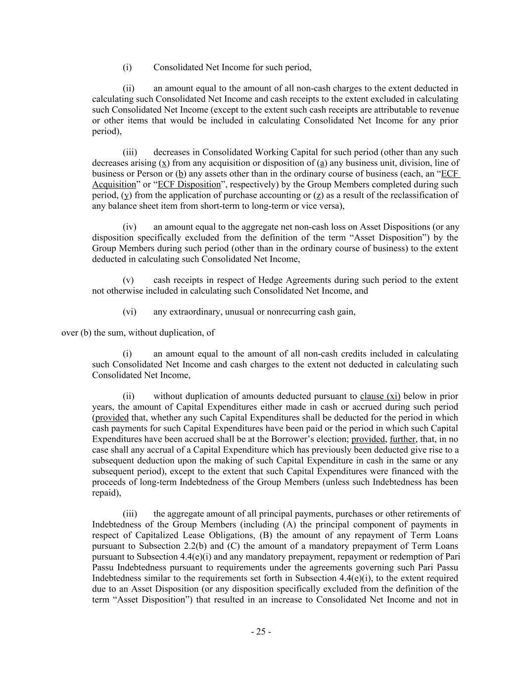 (i) Consolidated Net Income for such period, (ii) an amount equal to the amount of all non-cash charges to the extent deducted in calculating such Consolidated Net Income and cash receipts to the extent excluded in calculating such Consolidated Net Income (except to the extent such cash receipts are attributable to revenue or other items that would be included in calculating Consolidated Net Income for any prior period), (iii) decreases in Consolidated Working Capital for such period (other than any such decreases arising (x) from any acquisition or disposition of (a) any business unit, division, line of business or Person or (b) any assets other than in the ordinary course of business (each, an “ECF Acquisition” or “ECF Disposition”, respectively) by the Group Members completed during such period, (y) from the application of purchase accounting or (z) as a result of the reclassification of any balance sheet item from short-term to long-term or vice versa), (iv) an amount equal to the aggregate net non-cash loss on Asset Dispositions (or any disposition specifically excluded from the definition of the term “Asset Disposition”) by the Group Members during such period (other than in the ordinary course of business) to the extent deducted in calculating such Consolidated Net Income, (v) cash receipts in respect of Hedge Agreements during such period to the extent not otherwise included in calculating such Consolidated Net Income, and (vi) any extraordinary, unusual or nonrecurring cash gain, over (b) the sum, without duplication, of (i) an amount equal to the amount of all non-cash credits included in calculating such Consolidated Net Income and cash charges to the extent not deducted in calculating such Consolidated Net Income, (ii) without duplication of amounts deducted pursuant to clause (xi) below in prior years, the amount of Capital Expenditures either made in cash or accrued during such period (provided that, whether any such Capital Expenditures shall be deducted for the period in which cash payments for such Capital Expenditures have been paid or the period in which such Capital Expenditures have been accrued shall be at the Borrower’s election; provided, further, that, in no case shall any accrual of a Capital Expenditure which has previously been deducted give rise to a subsequent deduction upon the making of such Capital Expenditure in cash in the same or any subsequent period), except to the extent that such Capital Expenditures were financed with the proceeds of long-term Indebtedness of the Group Members (unless such Indebtedness has been repaid), (iii) the aggregate amount of all principal payments, purchases or other retirements of Indebtedness of the Group Members (including (A) the principal component of payments in respect of Capitalized Lease Obligations, (B) the amount of any repayment of Term Loans pursuant to Subsection 2.2(b) and (C) the amount of a mandatory prepayment of Term Loans pursuant to Subsection 4.4(e)(i) and any mandatory prepayment, repayment or redemption of Pari Passu Indebtedness pursuant to requirements under the agreements governing such Pari Passu Indebtedness similar to the requirements set forth in Subsection 4.4(e)(i), to the extent required due to an Asset Disposition (or any disposition specifically excluded from the definition of the term “Asset Disposition”) that resulted in an increase to Consolidated Net Income and not in - 25 -